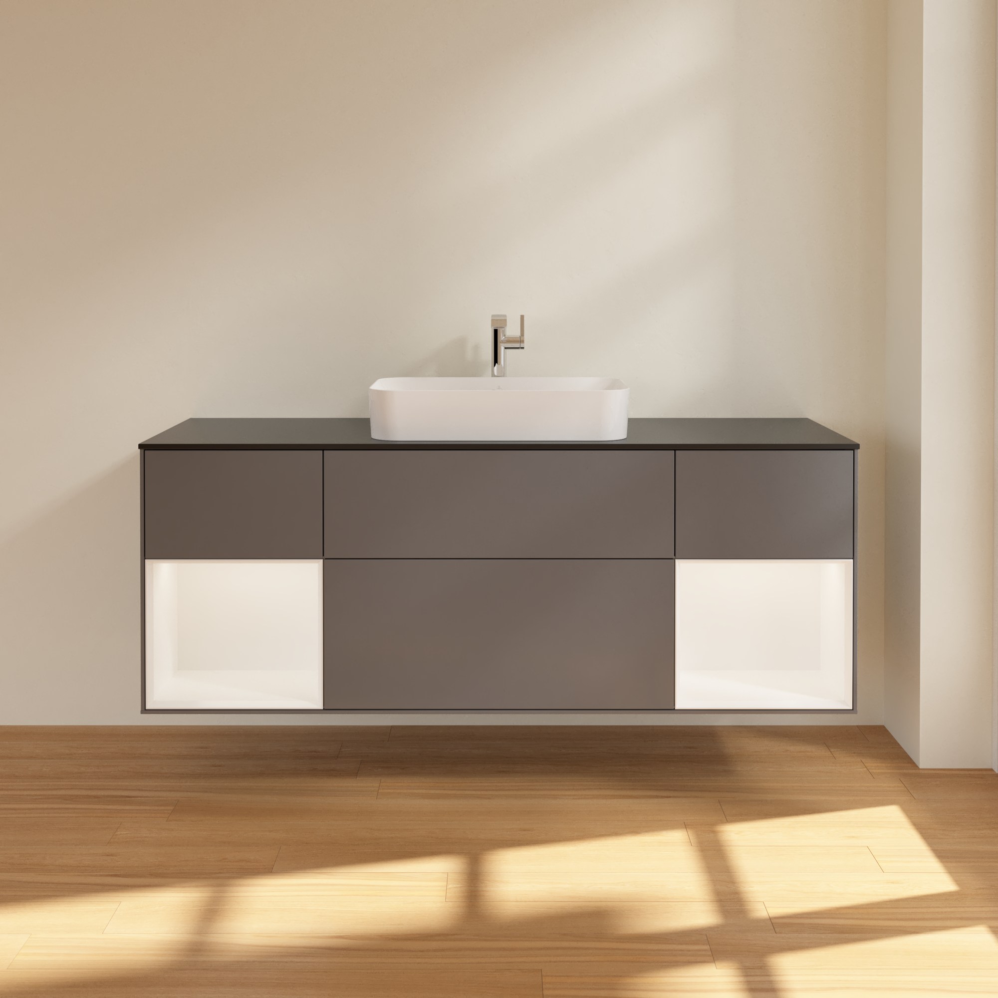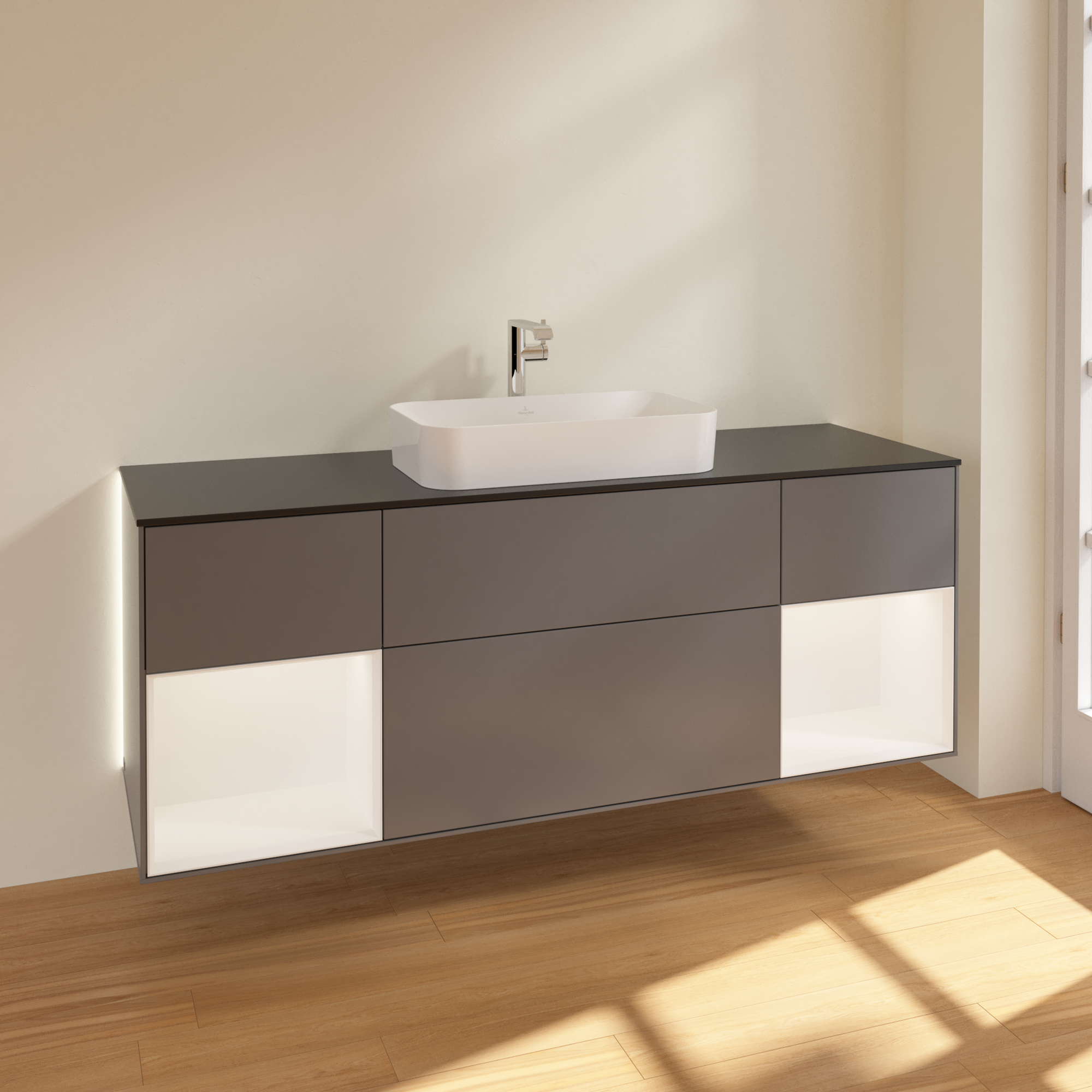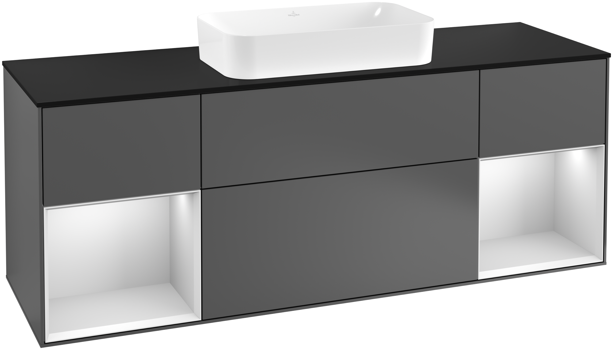 福朗 梳洗柜, 含照明, 4个拉出式抽屉, 1600x603x501mm, 主体: 哑光烟灰色烤漆, 正面: 哑光烟灰色烤漆, 置物架: 白色哑光漆, 顶部: 玻璃哑光黑色