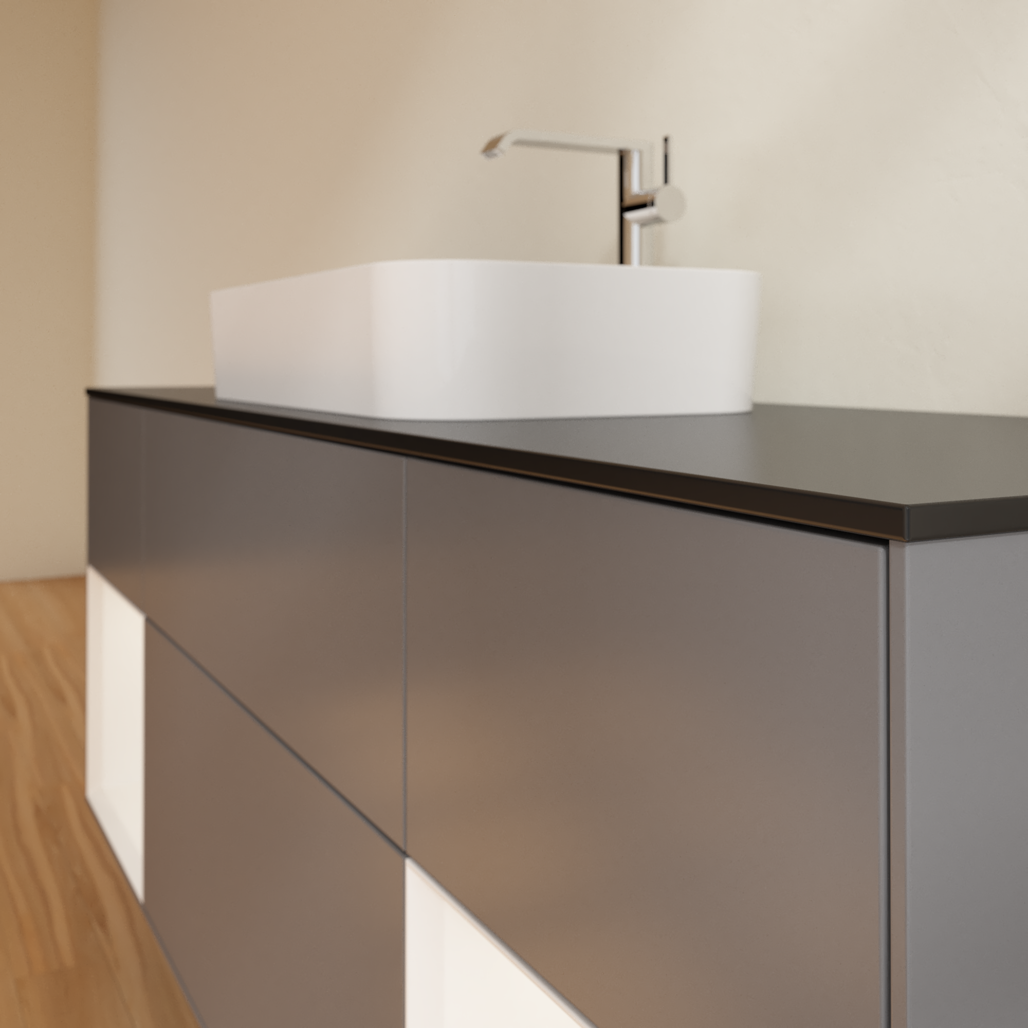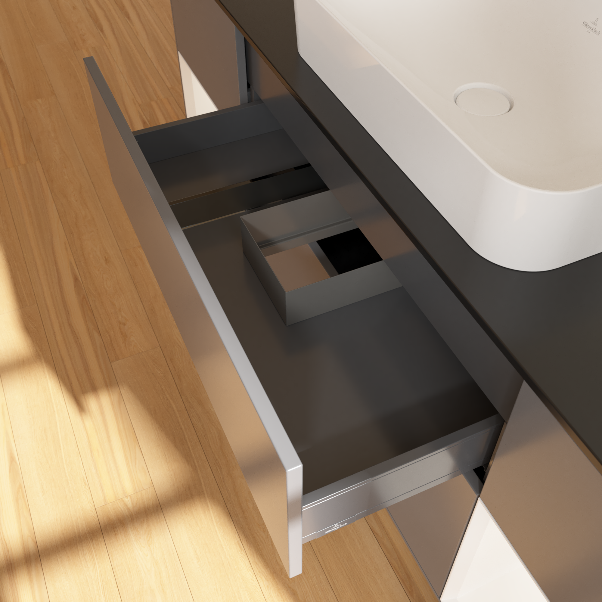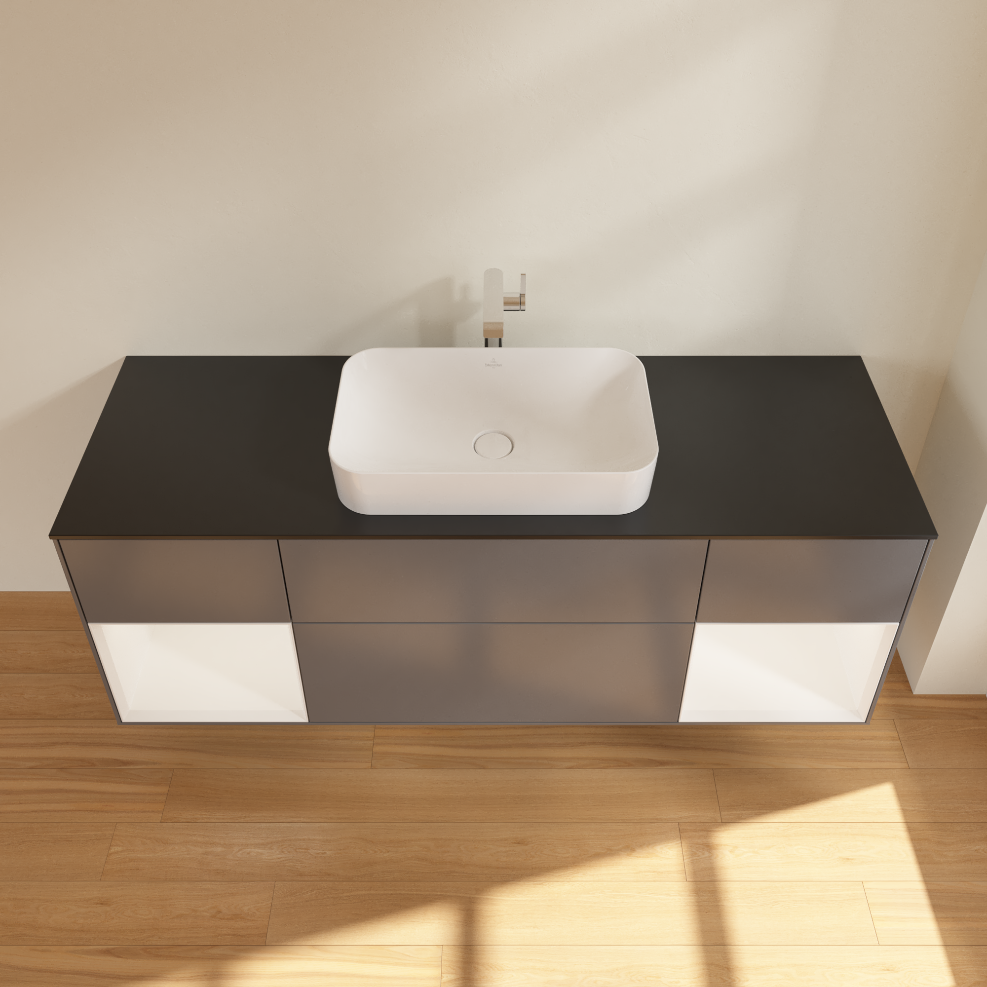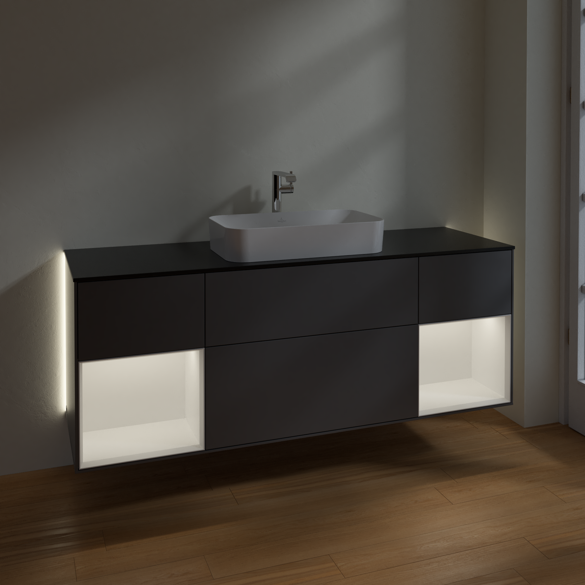 福朗 梳洗柜, 含照明, 4个拉出式抽屉, 1600x603x501mm, 主体: 哑光烟灰色烤漆, 正面: 哑光烟灰色烤漆, 置物架: 白色哑光漆, 顶部: 玻璃哑光黑色