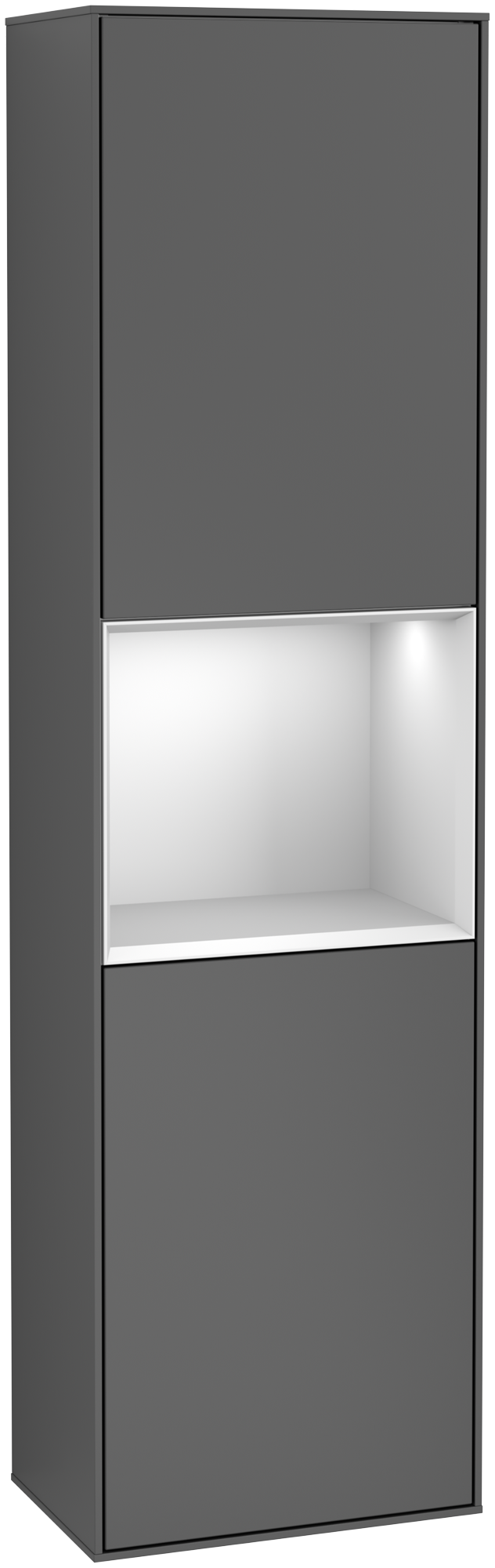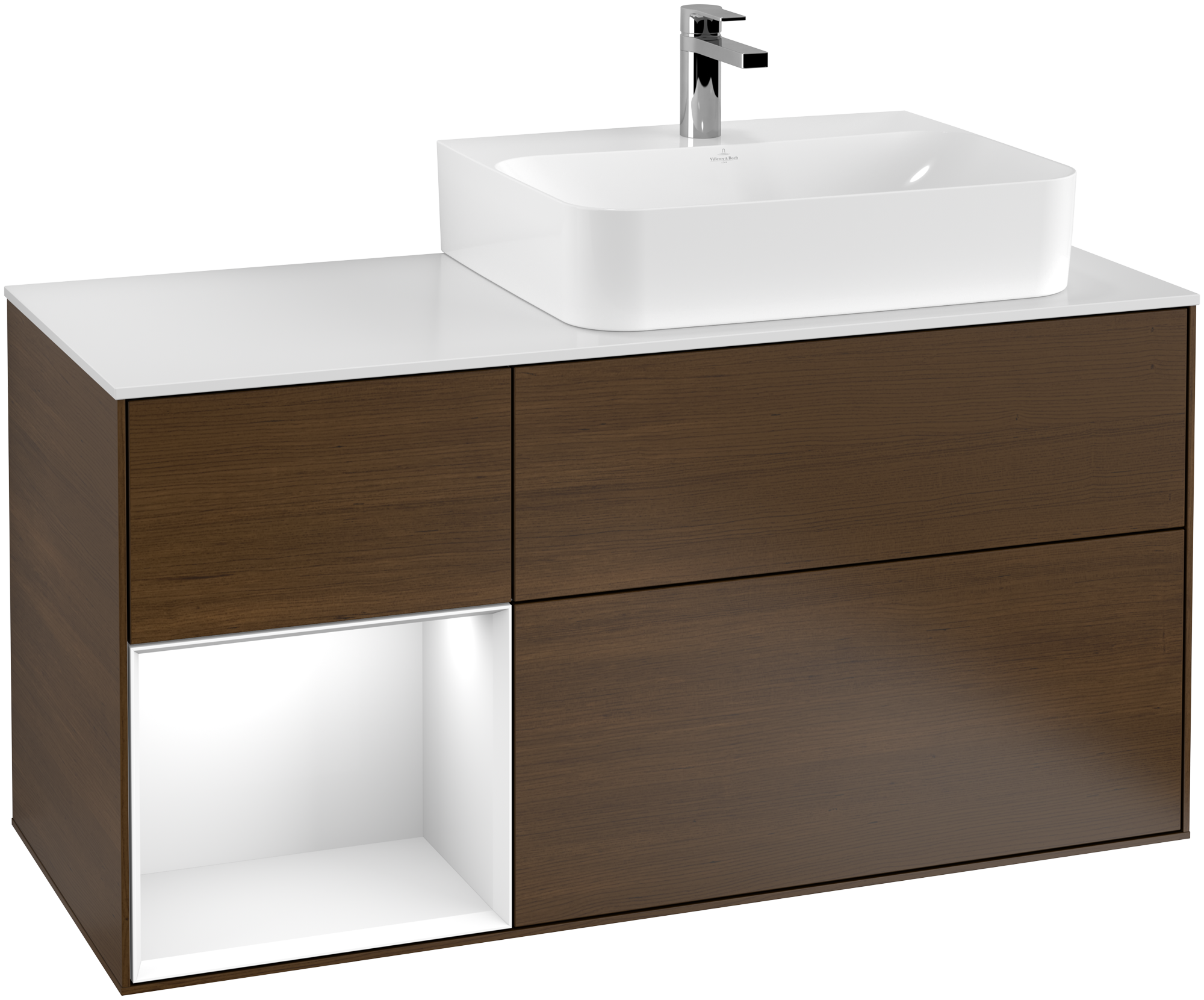 - Underskab til håndvaske, højskabe og sideskabe i stilrent Finion-design Modulopbyggede underskabe med præcist facetterede hylder Overflader af høj kvalitet i 10 lakfarver og 1 træfiner samt 2 elegante glashylder til bordmonterede håndvaske Hylder i frit valgbare møbelfarver giver mulighed for et individuelt præg Indirekte belyste hylder og skabe med Emotion-funktion Grebfri møbellåger med push-to-open-system