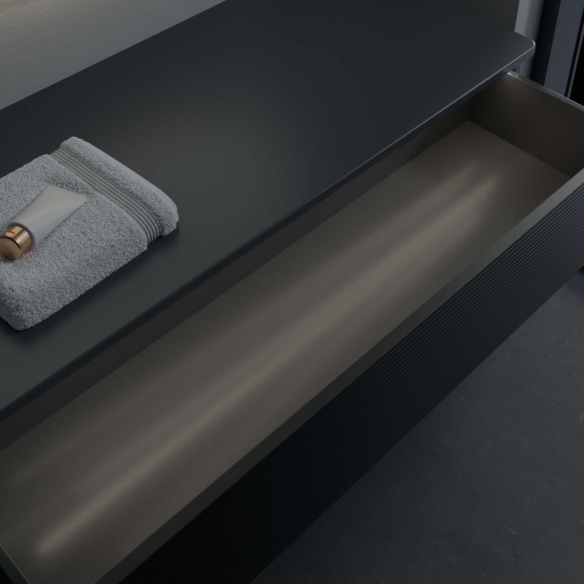 Antao Sideskab, med belysning, 1 udtræk, 1200x268x500mm, Forside med årestruktur, Korpus: Black Matt Lacquer, Front: Black Matt Lacquer, Afdækningsplade: Botticino