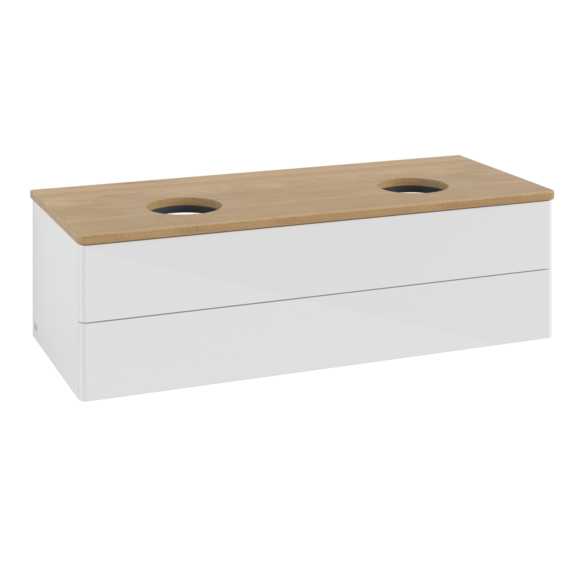 Antao Skab, 2 udtræk, 1200x360x500mm, Forside uden årestruktur, Korpus: Glossy White Lacquer, Front: Glossy White Lacquer, Afdækningsplade: Honey Oak