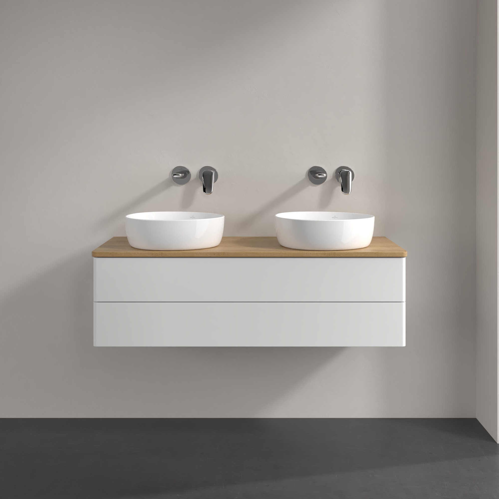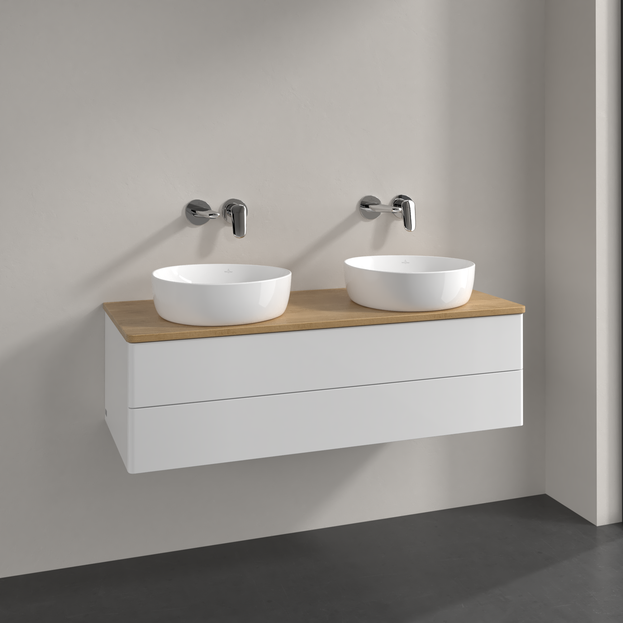 Antao Skab, med belysning, 2 udtræk, 1200x360x500mm, Forside uden årestruktur, Korpus: Glossy White Lacquer, Front: Glossy White Lacquer, Afdækningsplade: Honey Oak