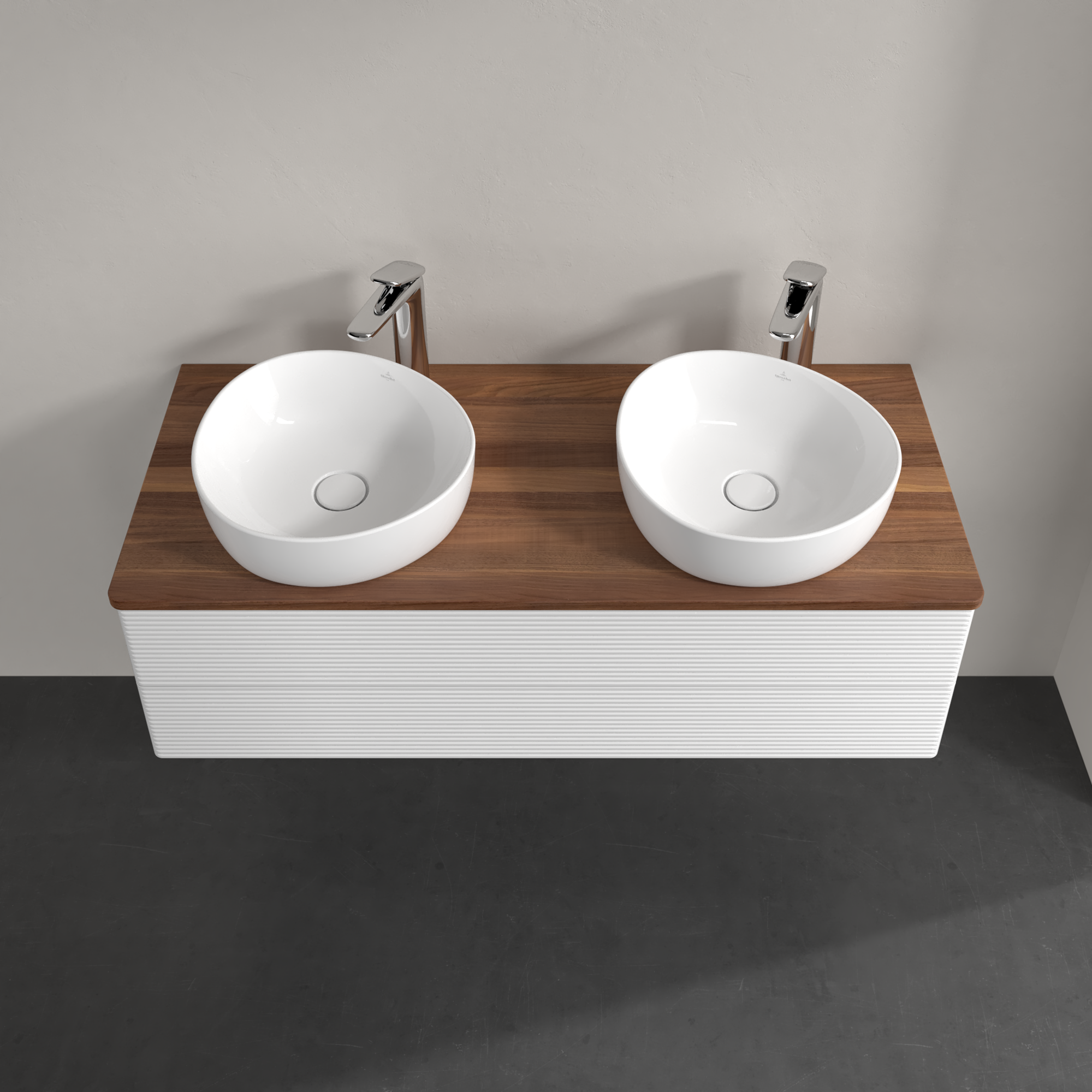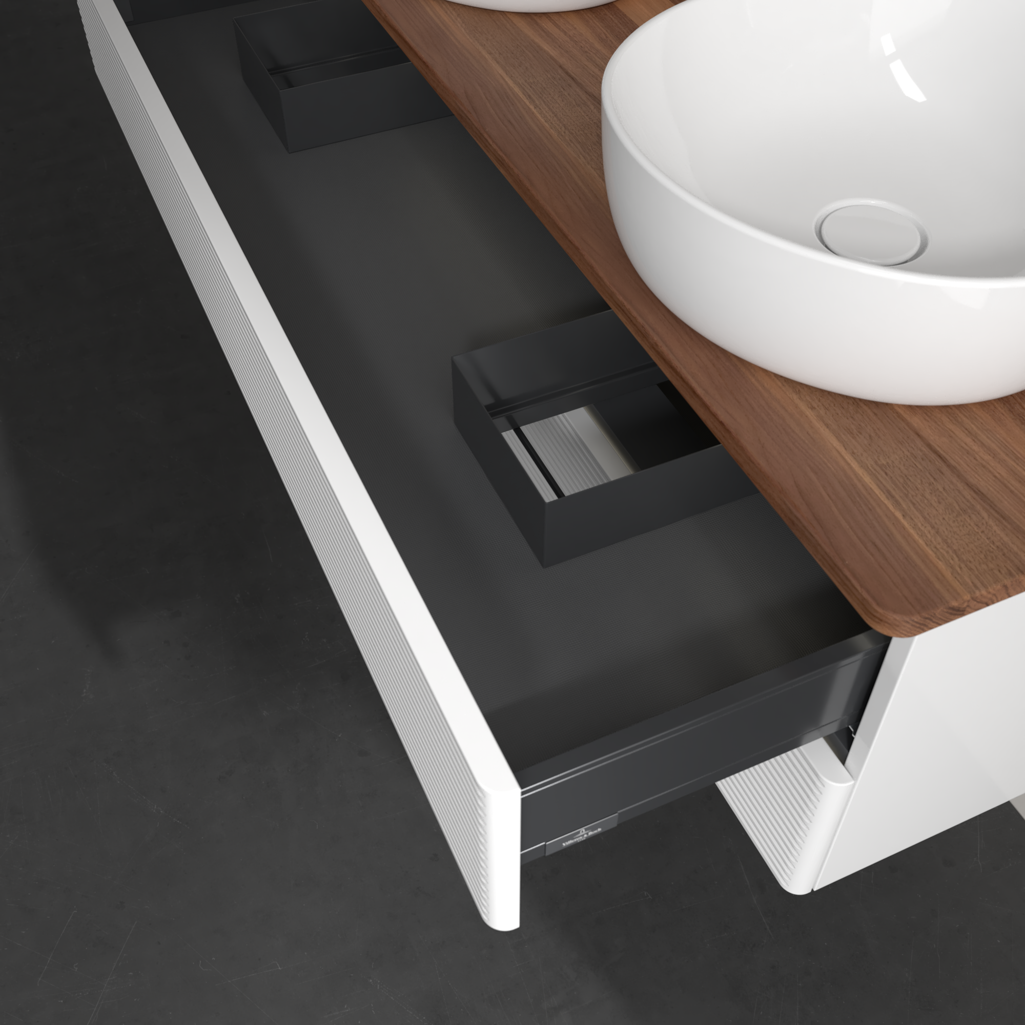 Antao Skab, med belysning, 2 udtræk, 1200x360x500mm, Forside med årestruktur, Korpus: Glossy White Lacquer, Front: Glossy White Lacquer, Afdækningsplade: Warm Walnut
