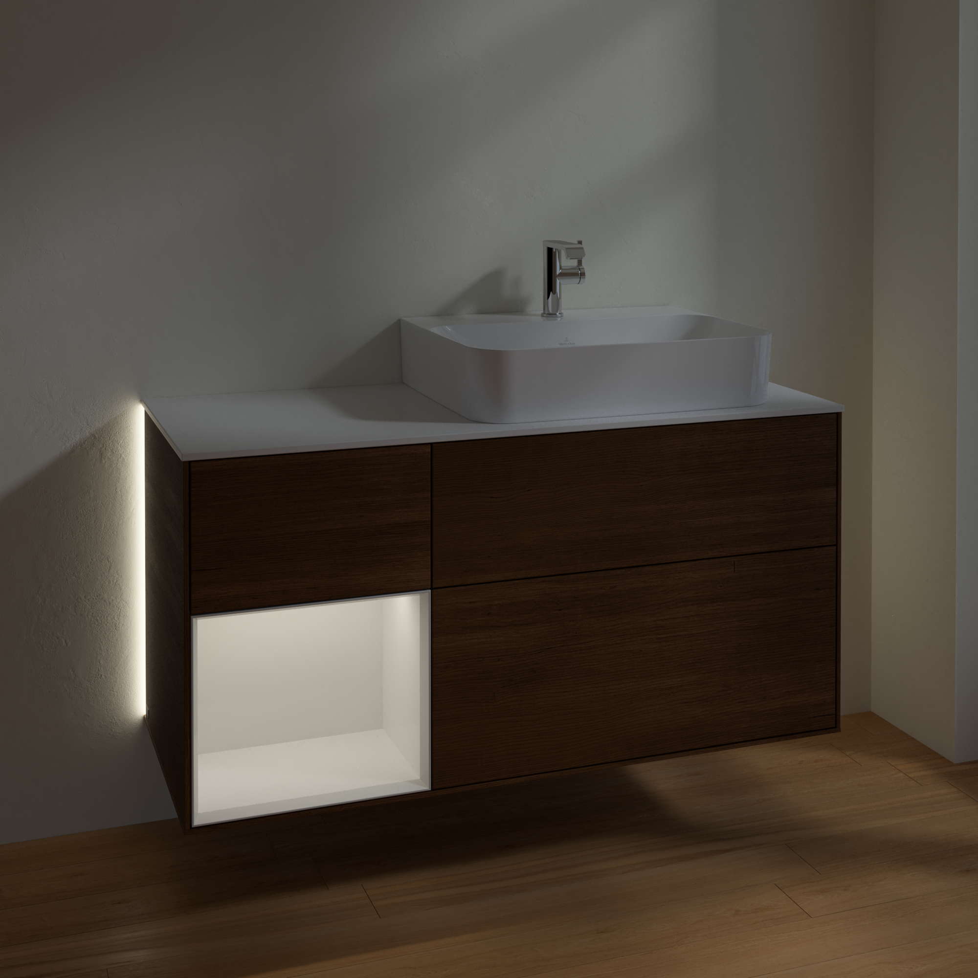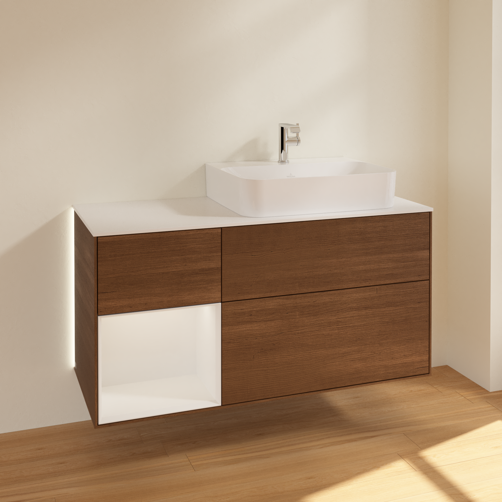 Finion Skab, med belysning, 3 udtræk, 1200x603x501mm, Korpus: Walnut Veneer, Front: Walnut Veneer, Reolelement: Glossy White Lacquer, Afdækningsplade: Glass White Matt