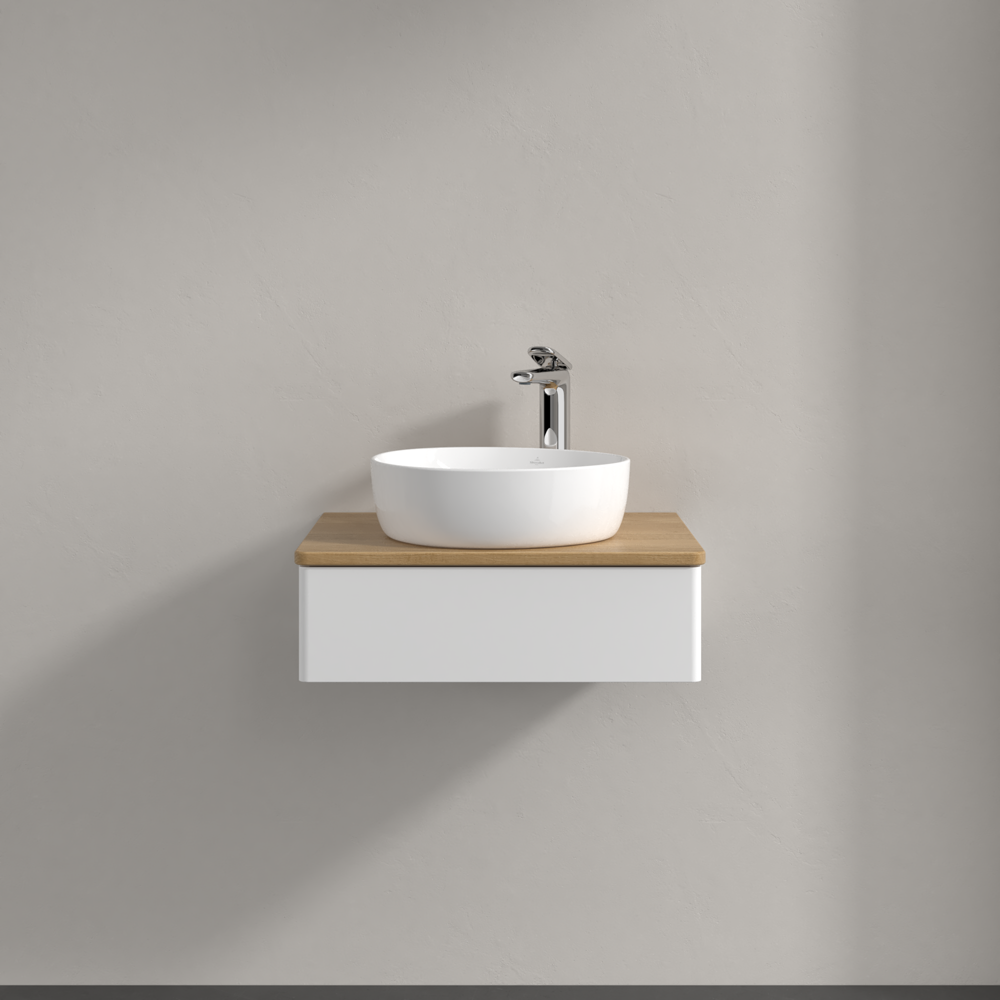 Antao Waschbeckenunterschrank, 1 Auszug, 600x190x500mm, Front ohne Struktur, Korpus: White Matt Lacquer, Front: White Matt Lacquer, Abdeckplatte: Honey Oak