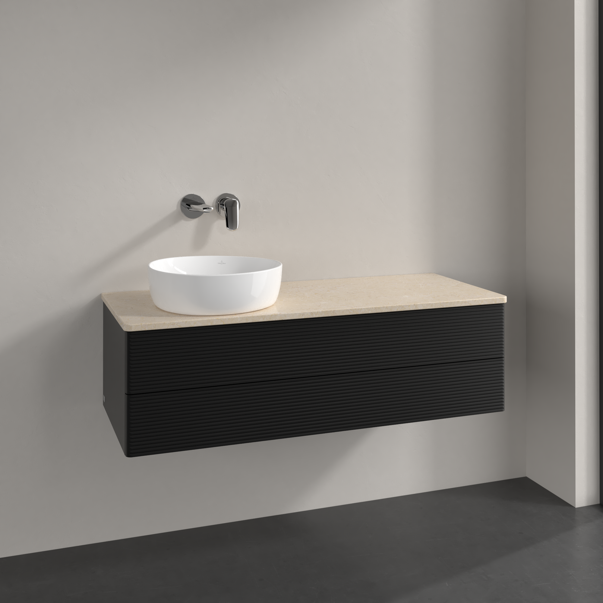 Antao Waschbeckenunterschrank, 2 Auszüge, 1200x360x500mm, Front mit Struktur, Korpus: Black Matt Lacquer, Front: Black Matt Lacquer, Abdeckplatte: Botticino
