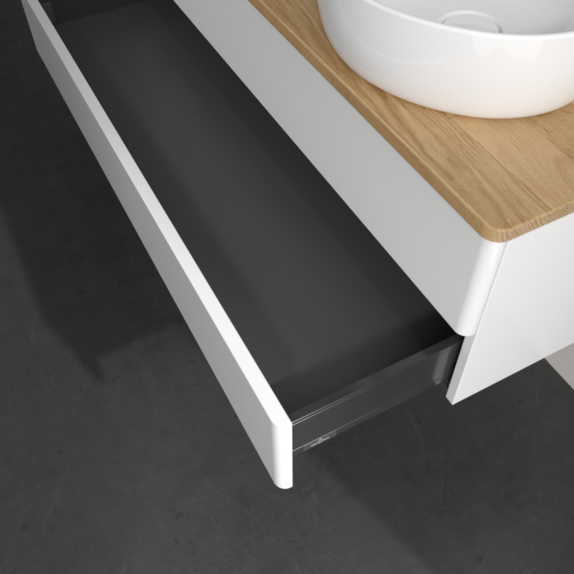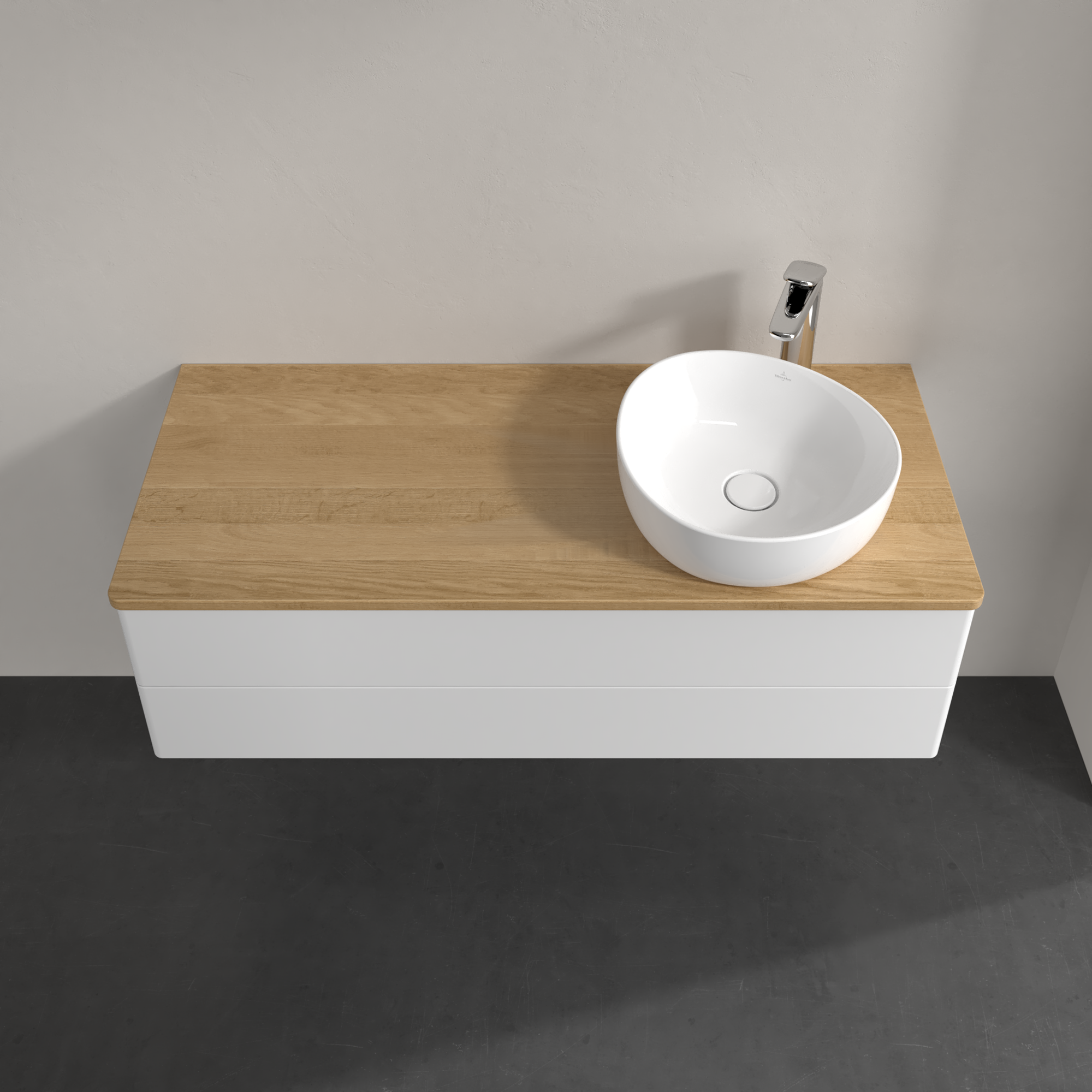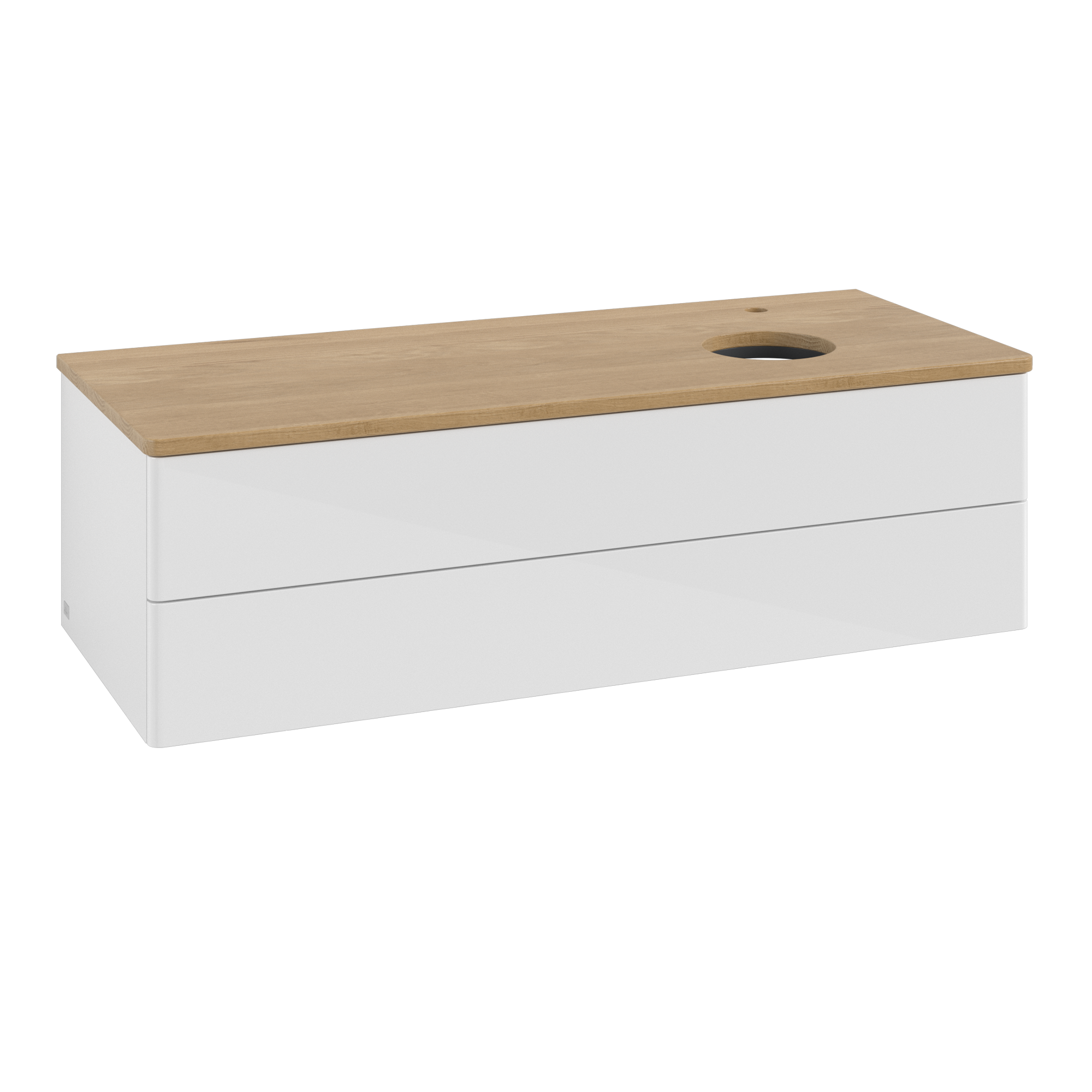 Antao Waschbeckenunterschrank, 2 Auszüge, 1200x360x500mm, Front ohne Struktur, Korpus: Glossy White Lacquer, Front: Glossy White Lacquer, Abdeckplatte: Honey Oak