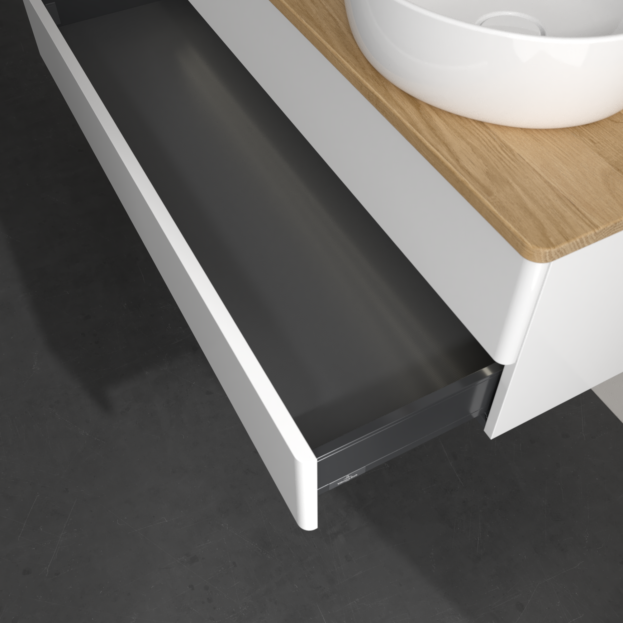 Antao Waschbeckenunterschrank, mit Beleuchtung, 2 Auszüge, 1200x360x500mm, Front ohne Struktur, Korpus: Glossy White Lacquer, Front: Glossy White Lacquer, Abdeckplatte: Honey Oak