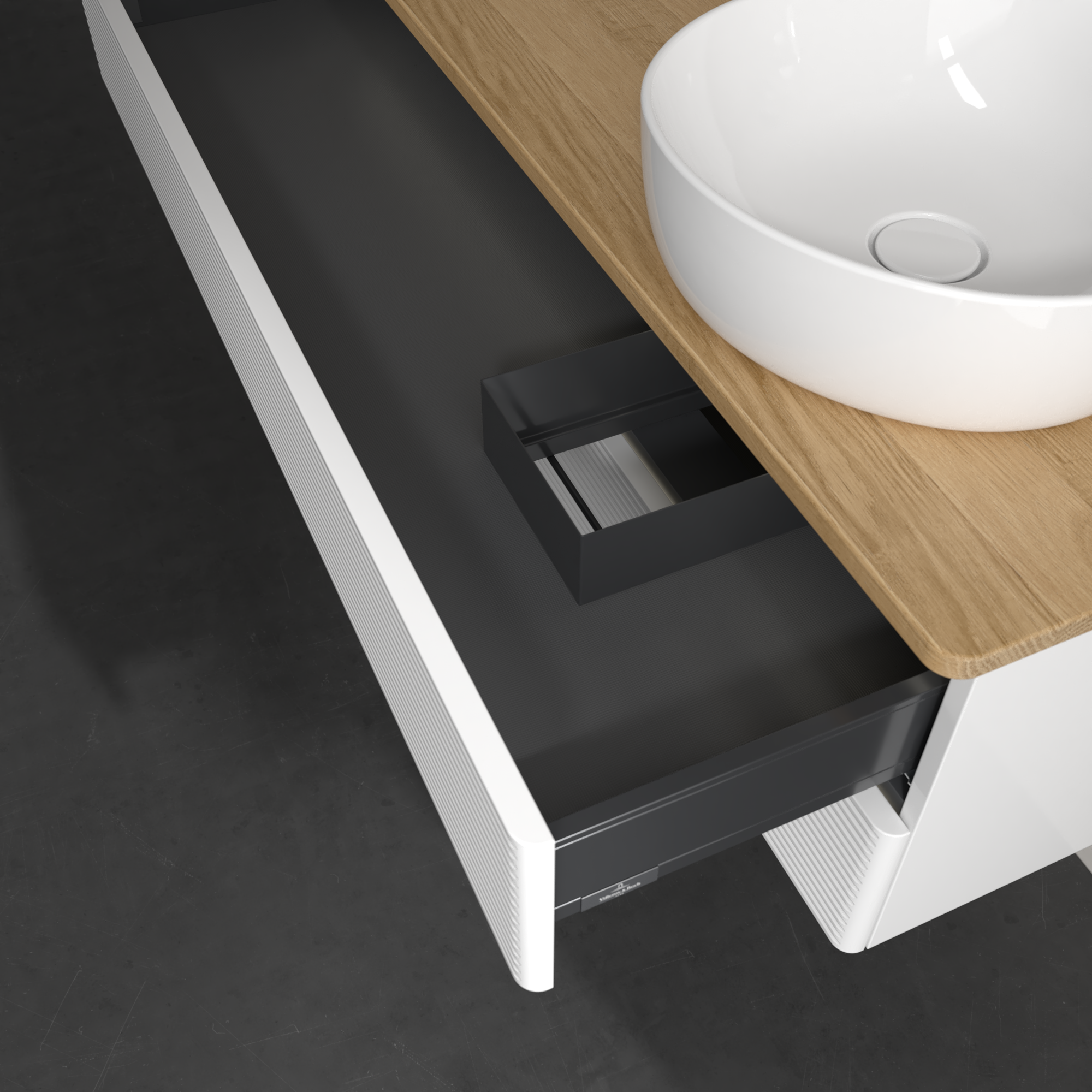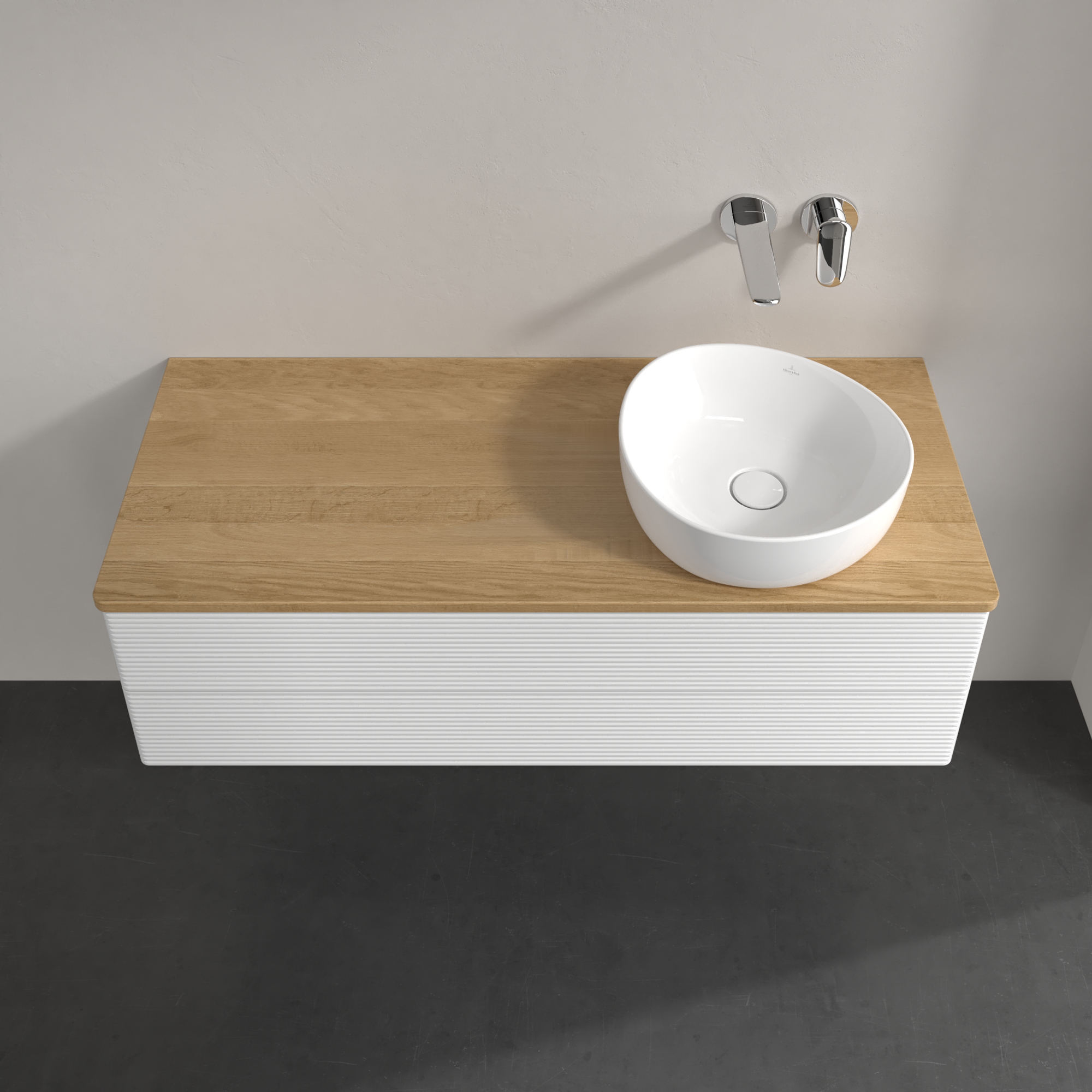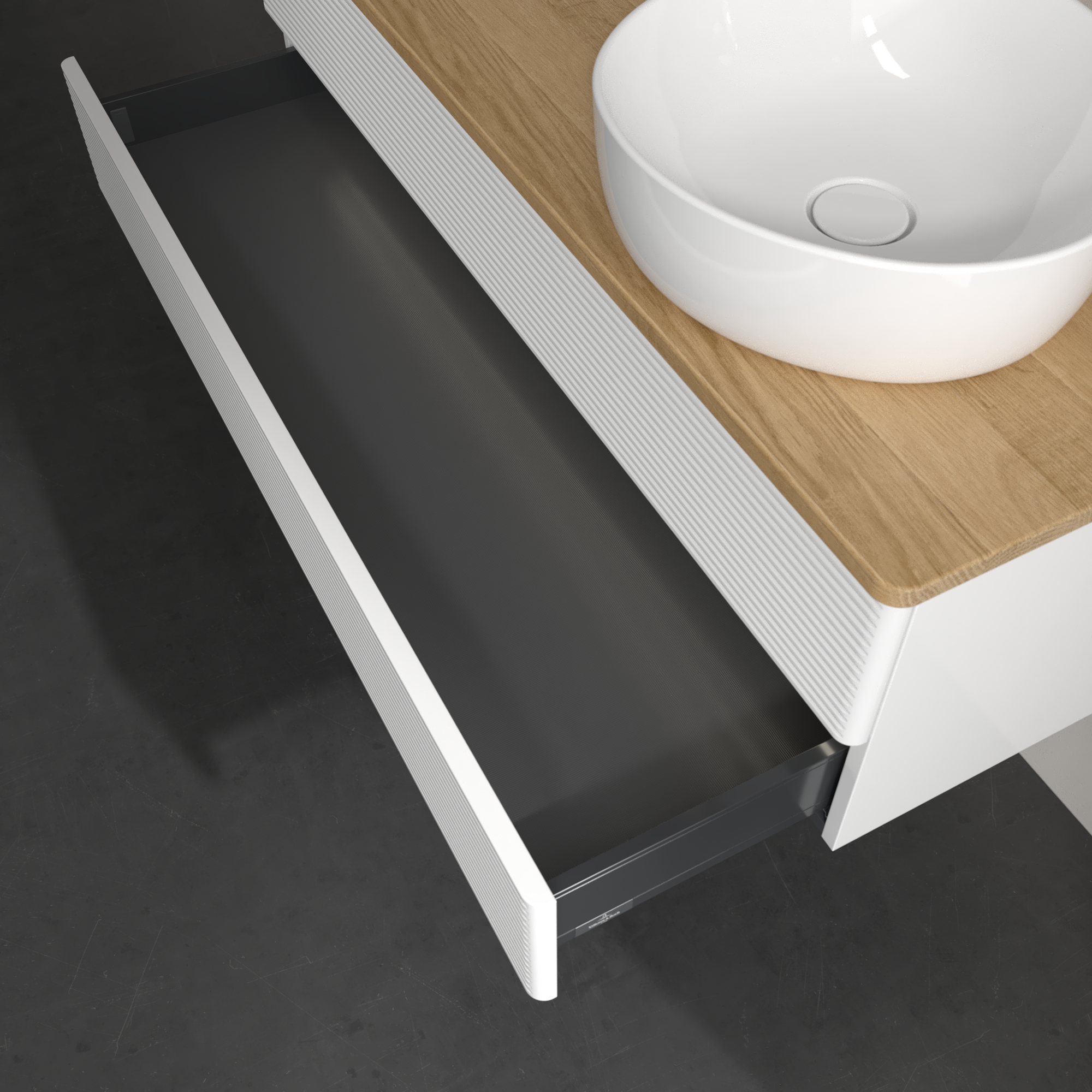 Antao Waschbeckenunterschrank, mit Beleuchtung, 2 Auszüge, 1200x360x500mm, Front mit Struktur, Korpus: Glossy White Lacquer, Front: Glossy White Lacquer, Abdeckplatte: Honey Oak