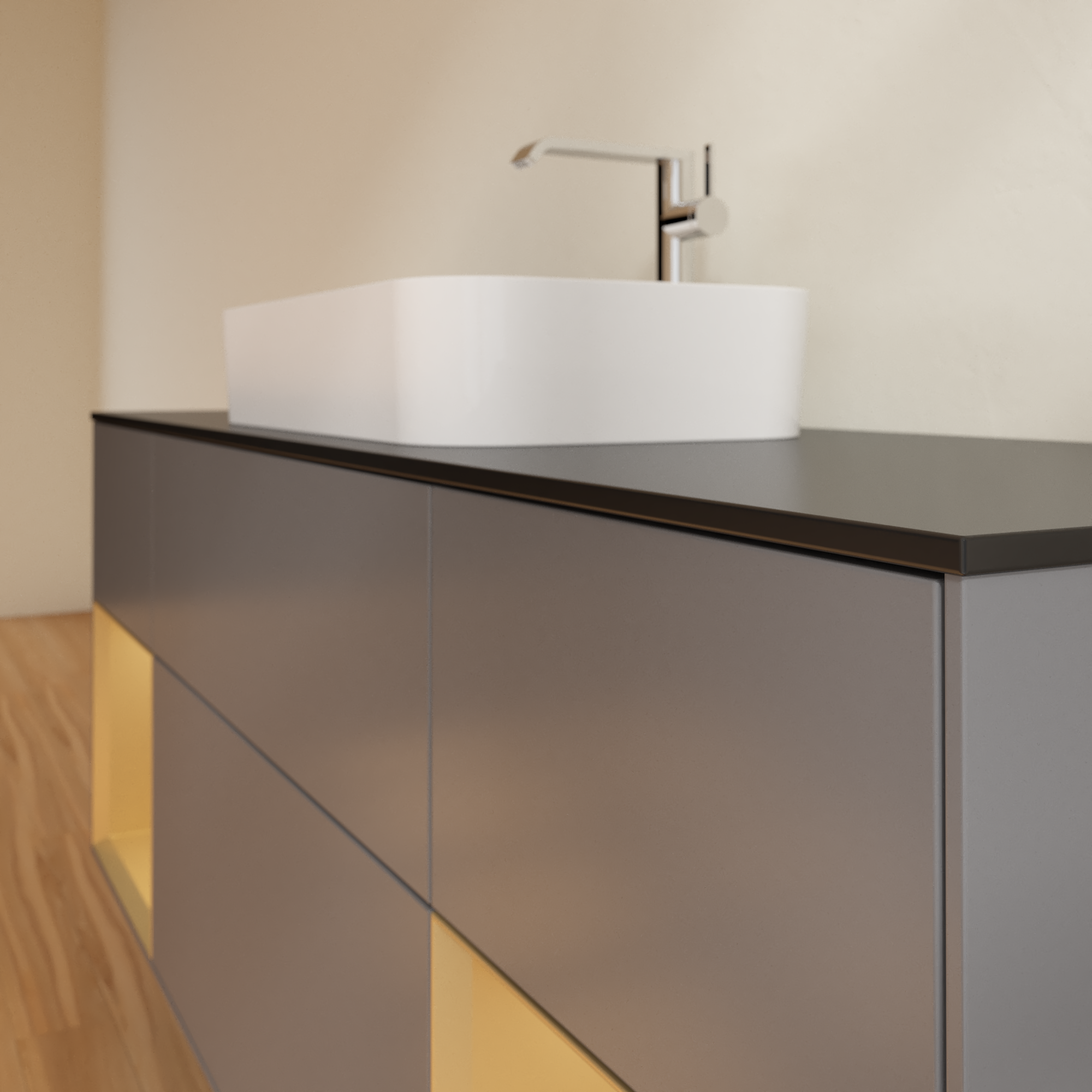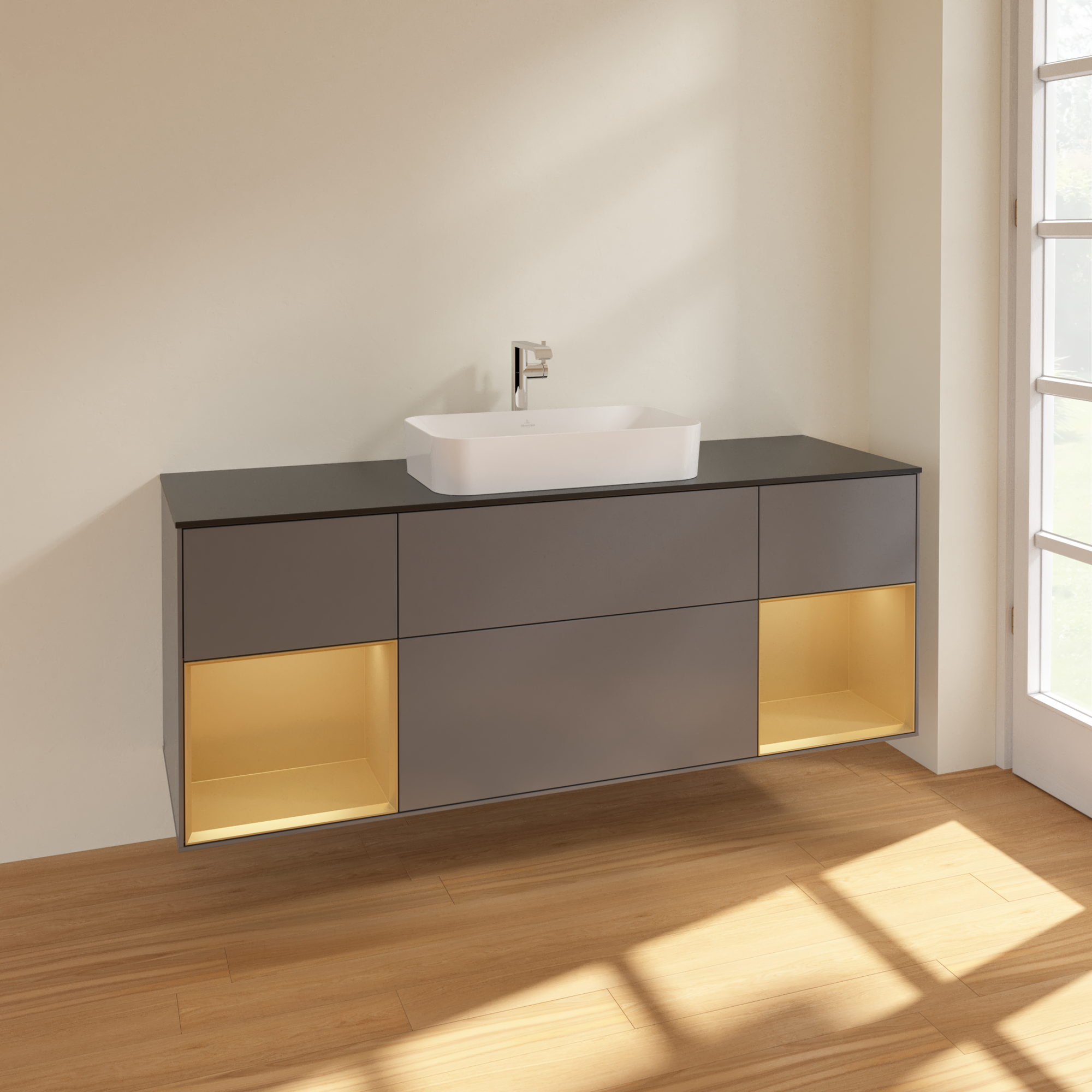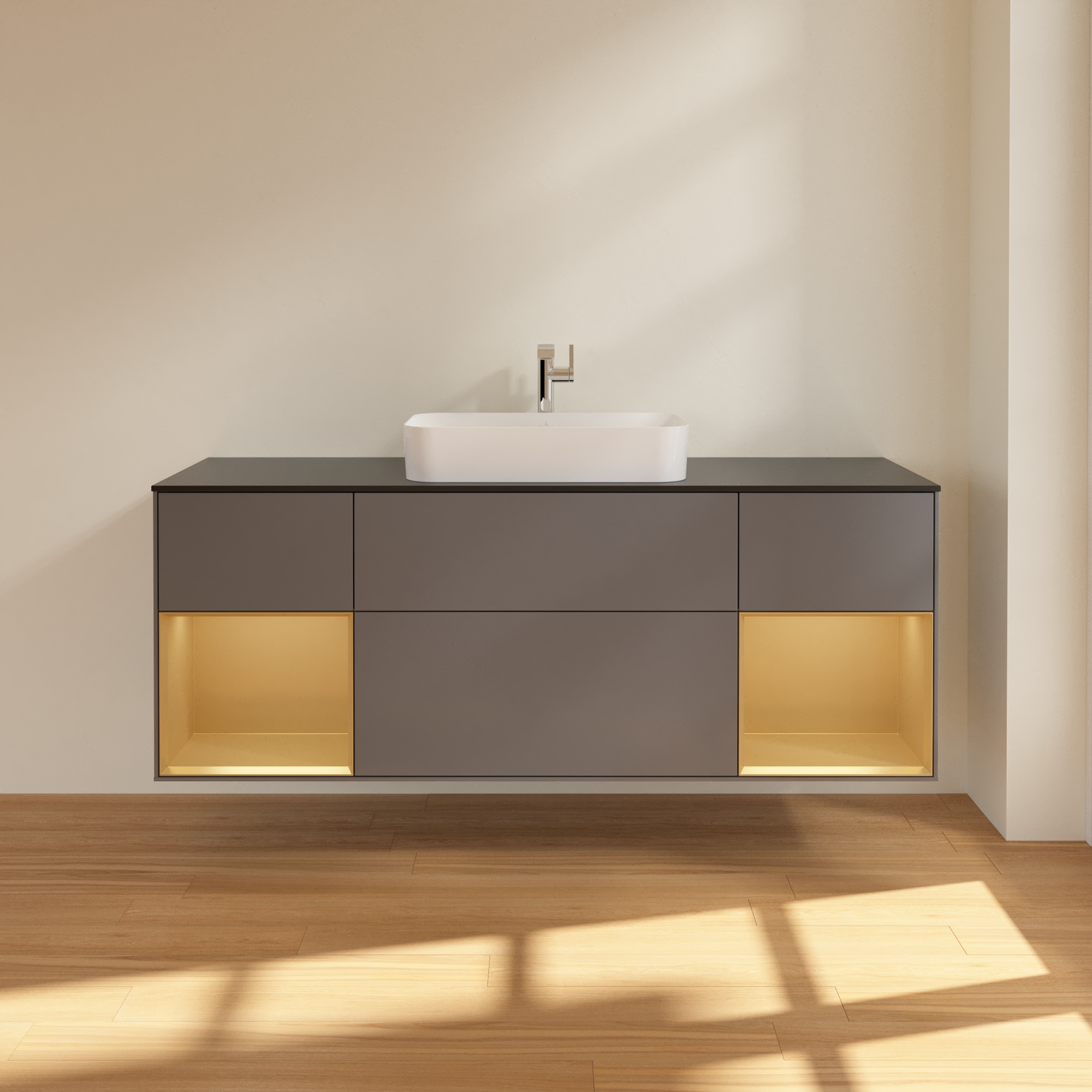 Finion Waschbeckenunterschrank, mit Beleuchtung, 4 Auszüge, 1600x603x501mm, Korpus: Anthracite Matt Lacquer, Front: Anthracite Matt Lacquer, Regalelement: Gold Matt Lacquer, Abdeckplatte: Glass Black Matt