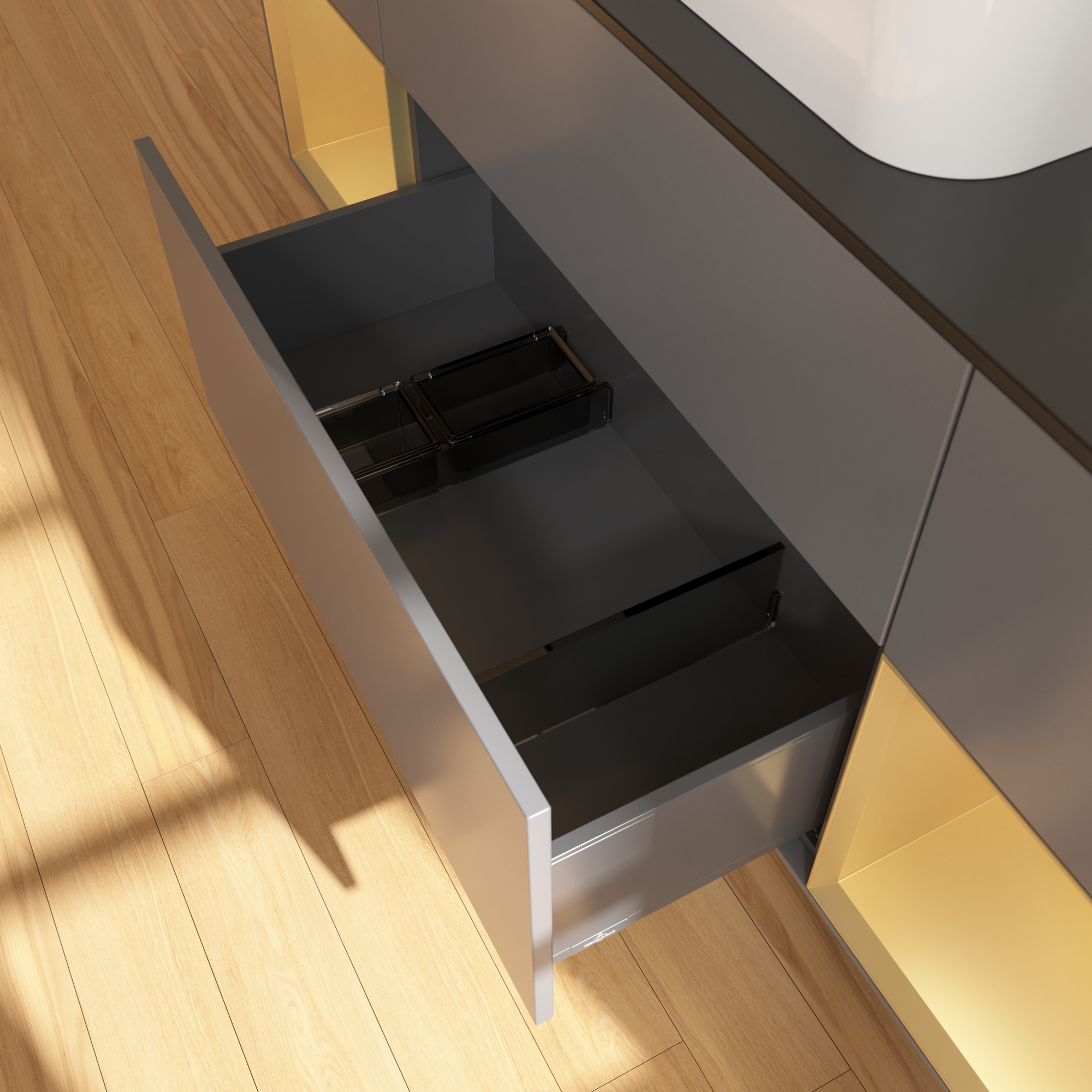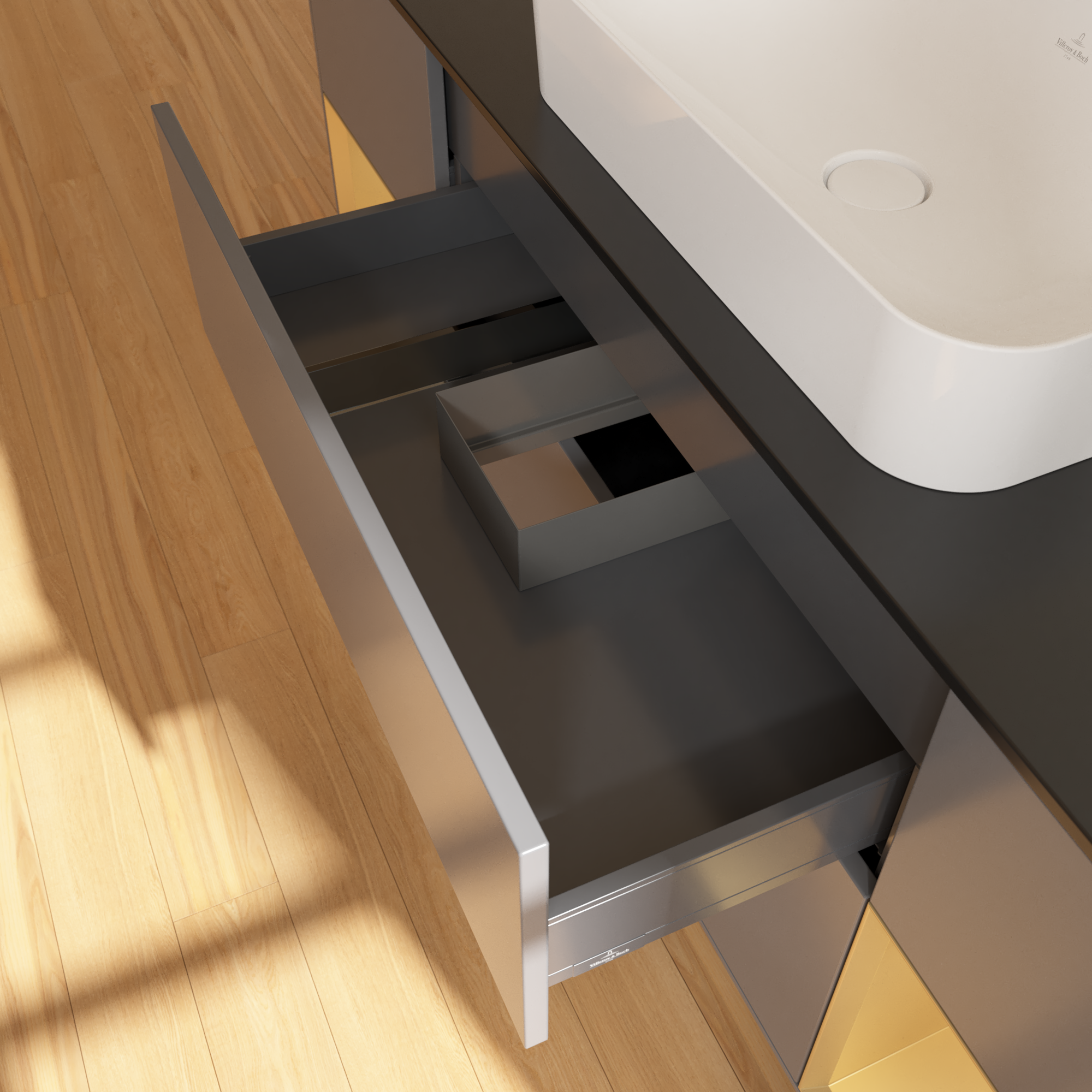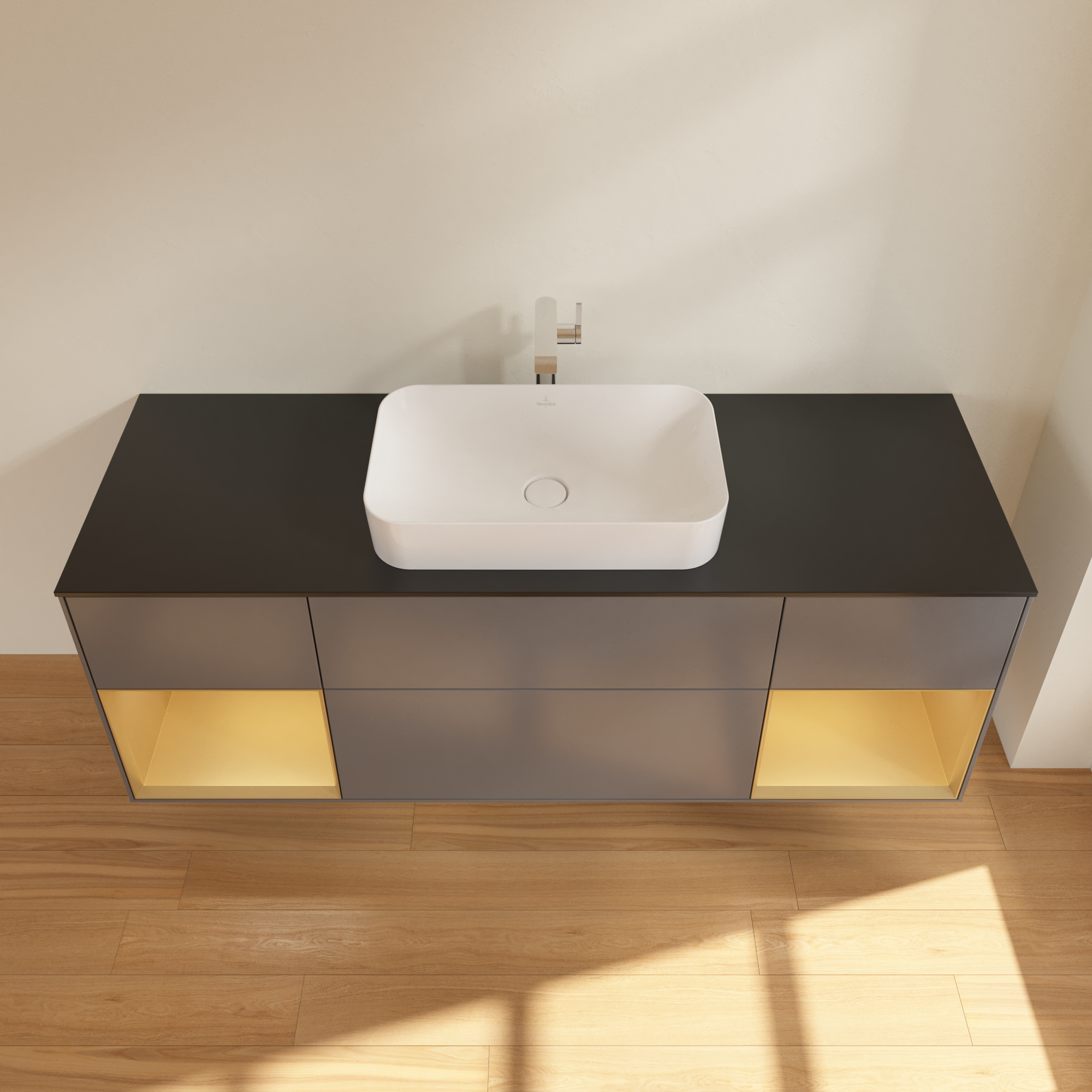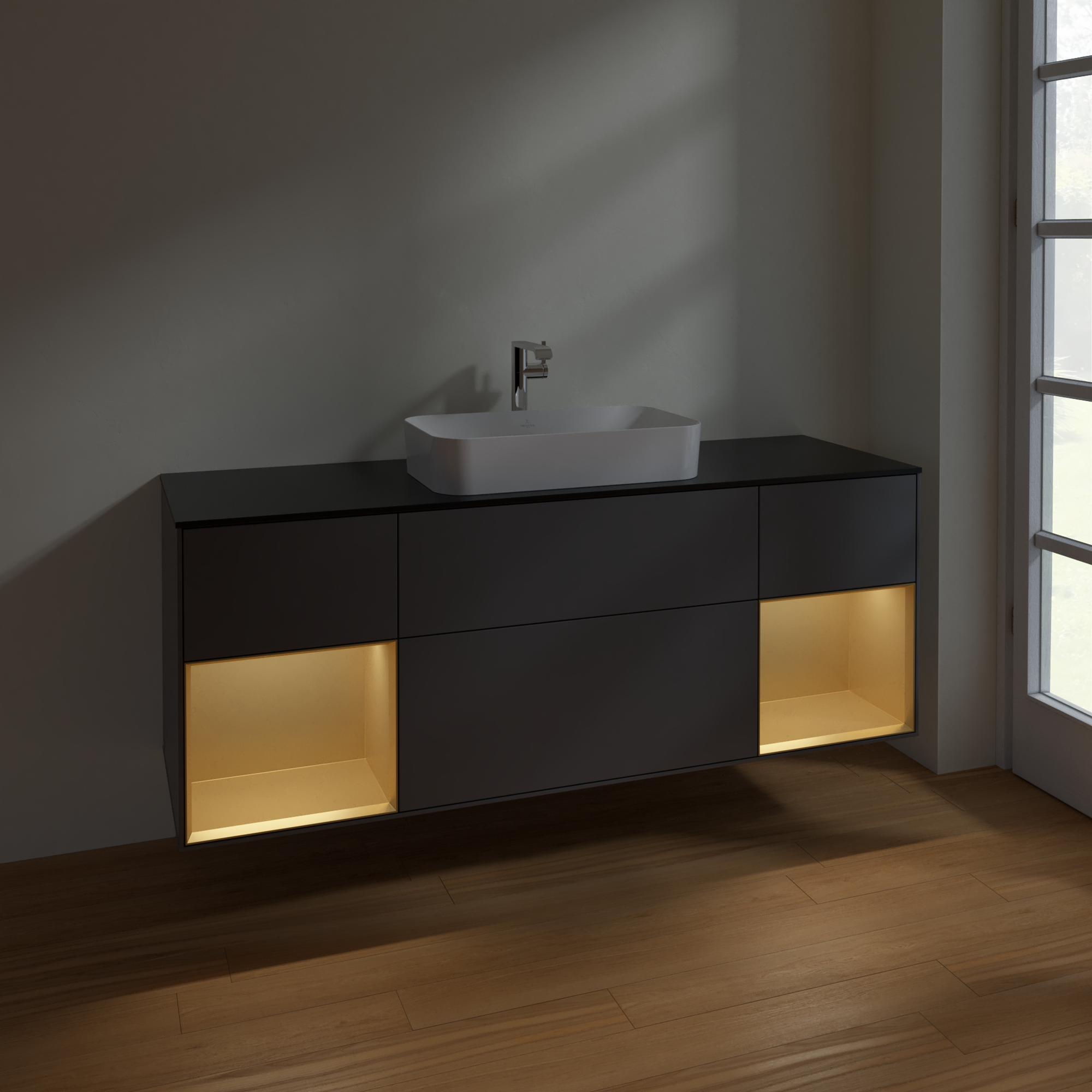 Finion Waschbeckenunterschrank, mit Beleuchtung, 4 Auszüge, 1600x603x501mm, Korpus: Anthracite Matt Lacquer, Front: Anthracite Matt Lacquer, Regalelement: Gold Matt Lacquer, Abdeckplatte: Glass Black Matt
