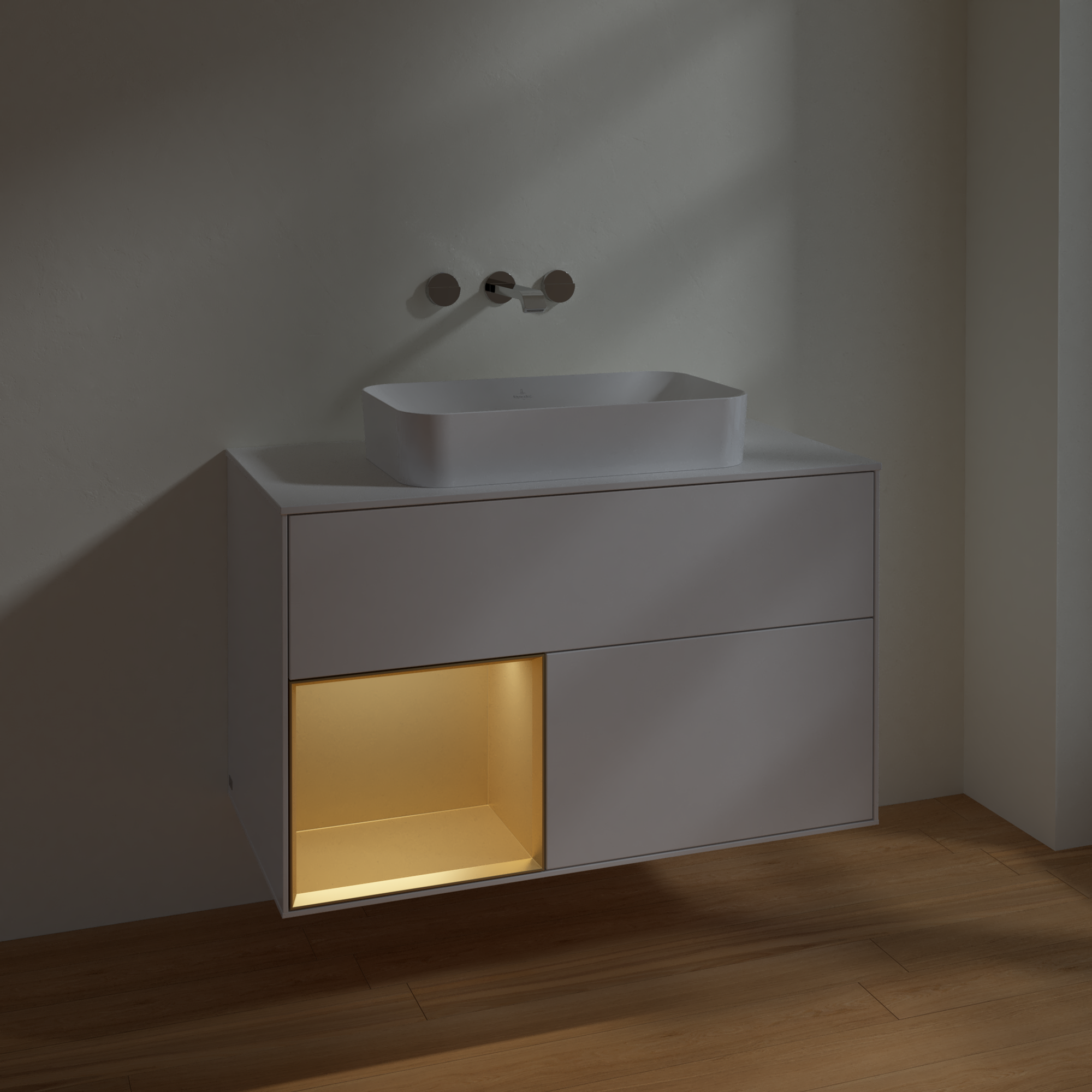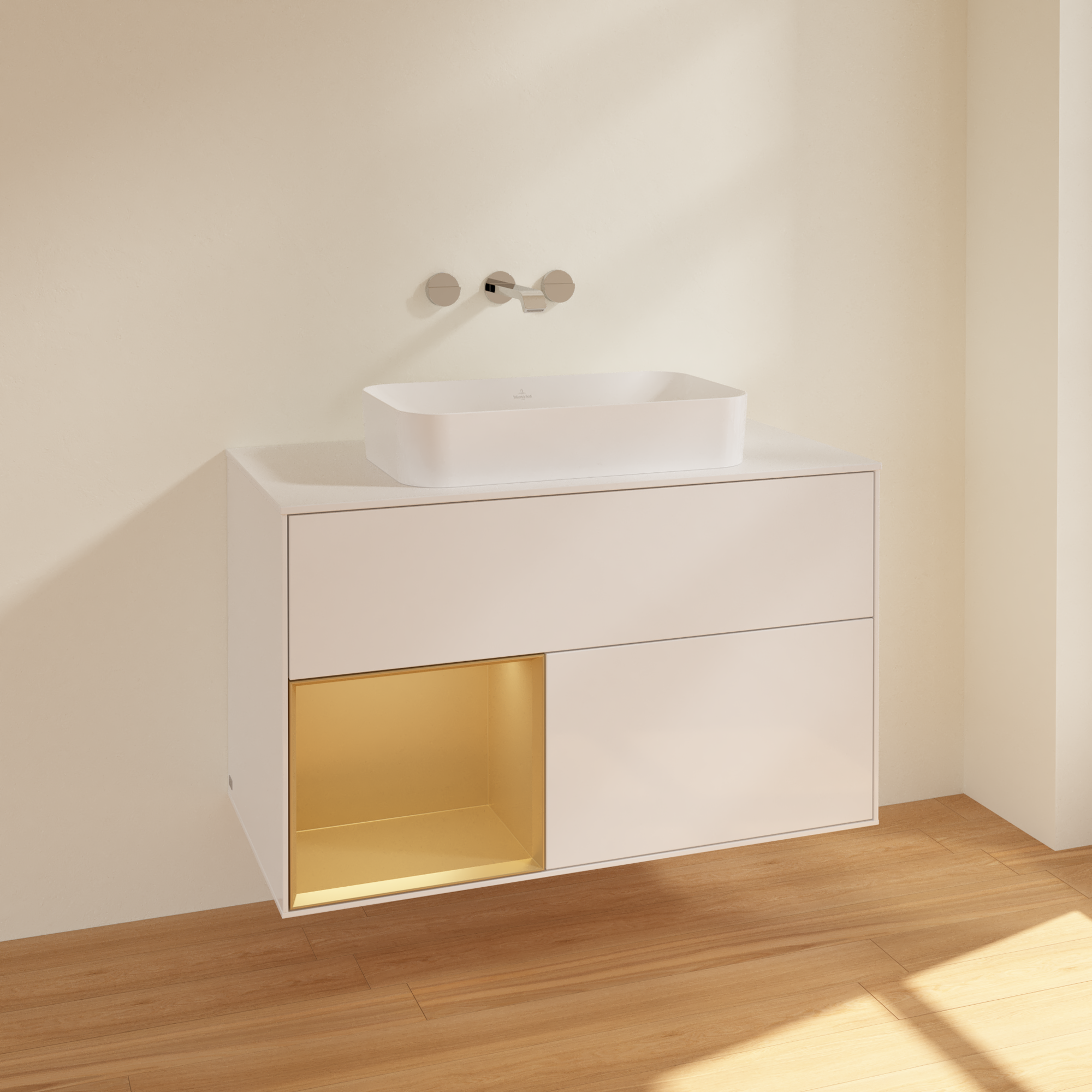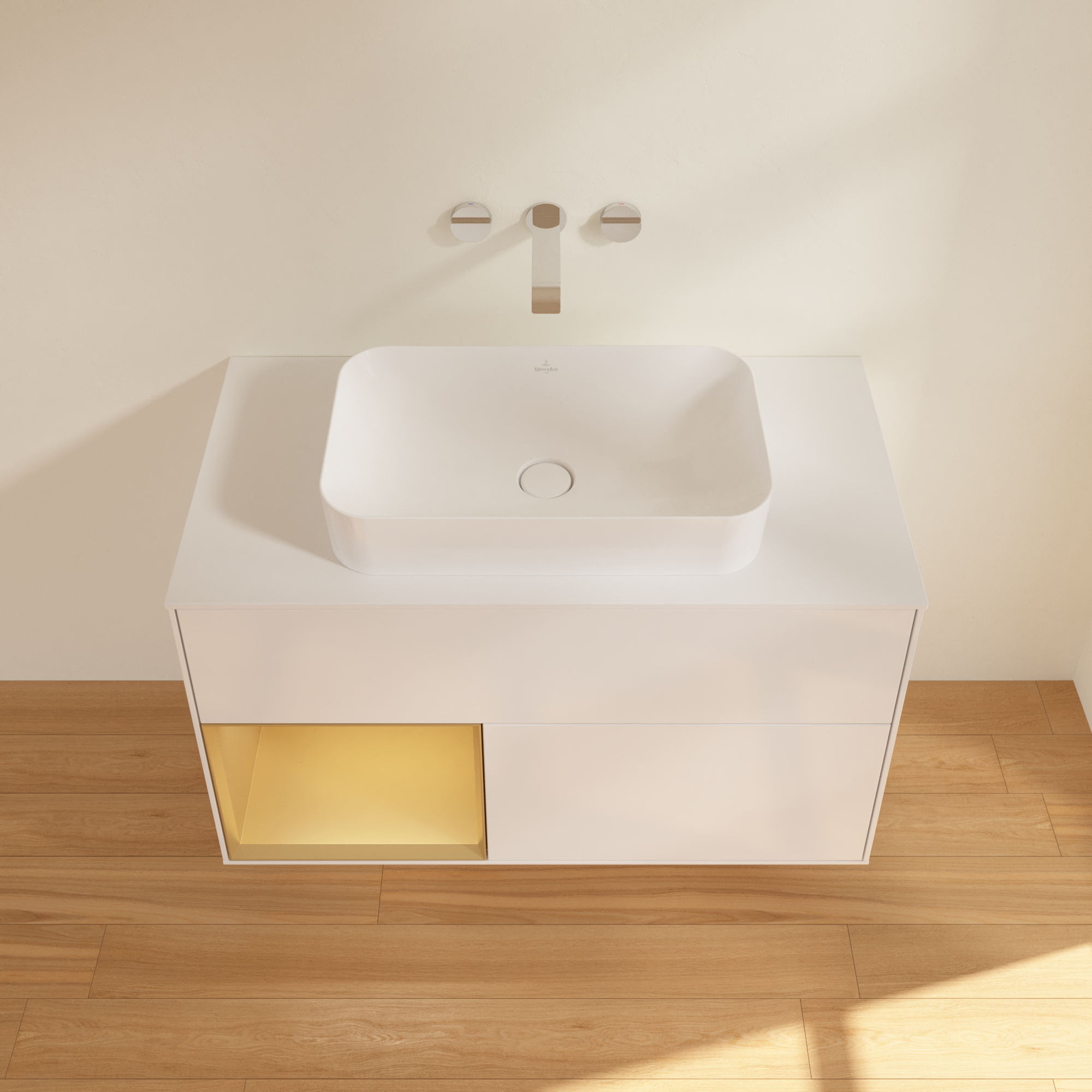 Finion Waschbeckenunterschrank, mit Beleuchtung, 2 Auszüge, 1000x603x501mm, Korpus: Glossy White Lacquer, Front: Glossy White Lacquer, Regalelement: Gold Matt Lacquer, Abdeckplatte: Glass White Matt