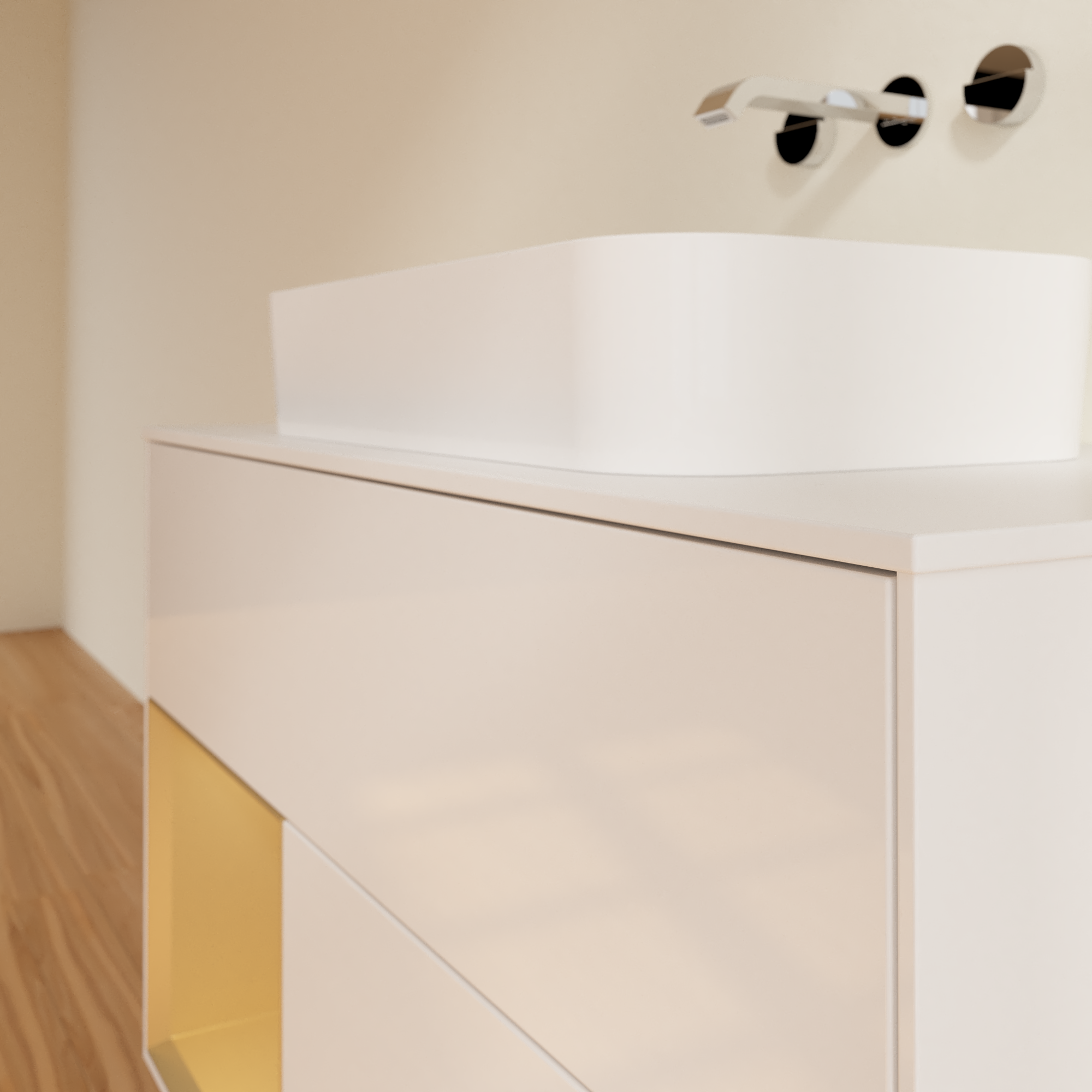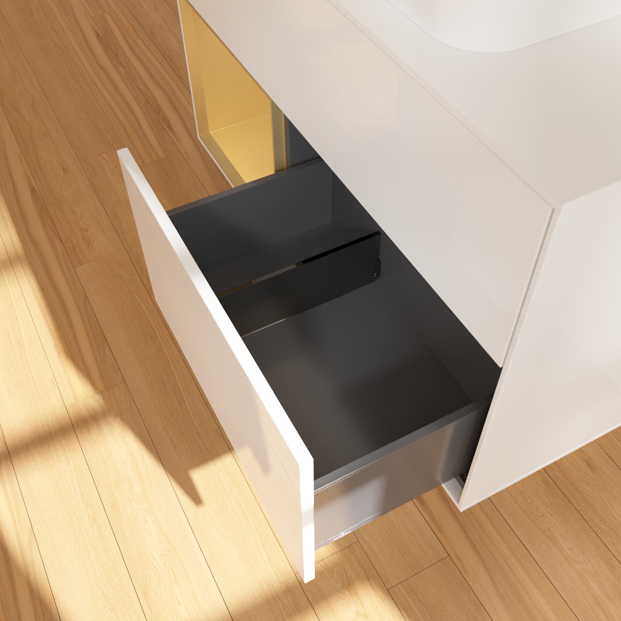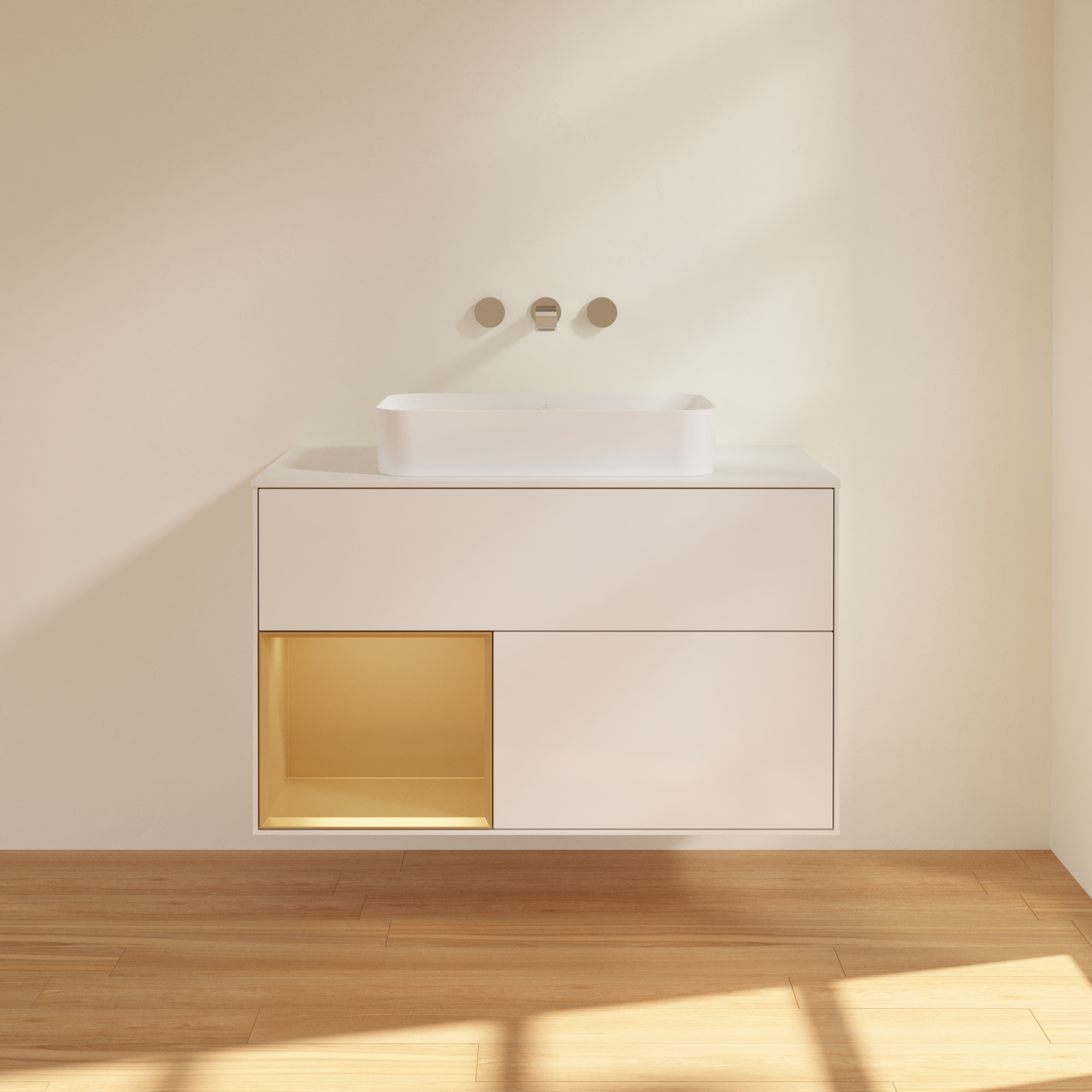 Finion Waschbeckenunterschrank, mit Beleuchtung, 2 Auszüge, 1000x603x501mm, Korpus: Glossy White Lacquer, Front: Glossy White Lacquer, Regalelement: Gold Matt Lacquer, Abdeckplatte: Glass White Matt