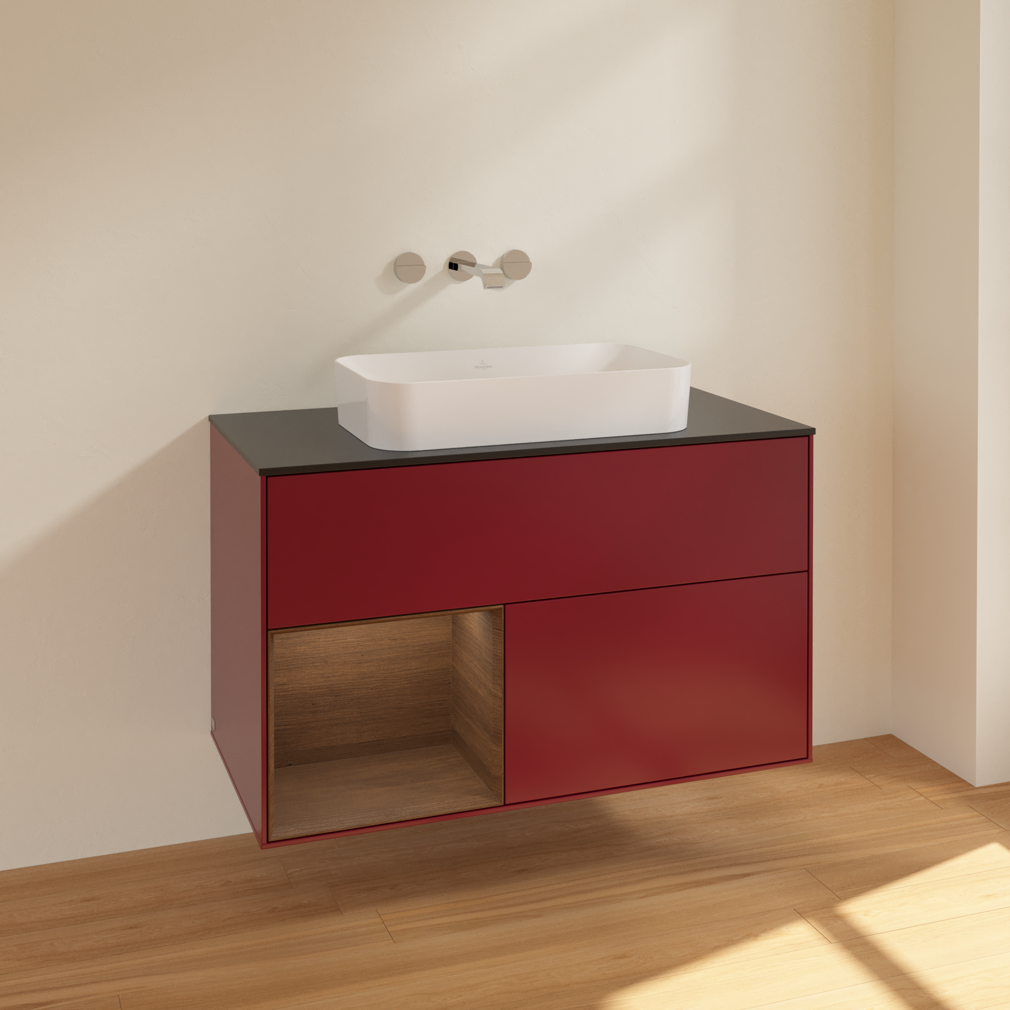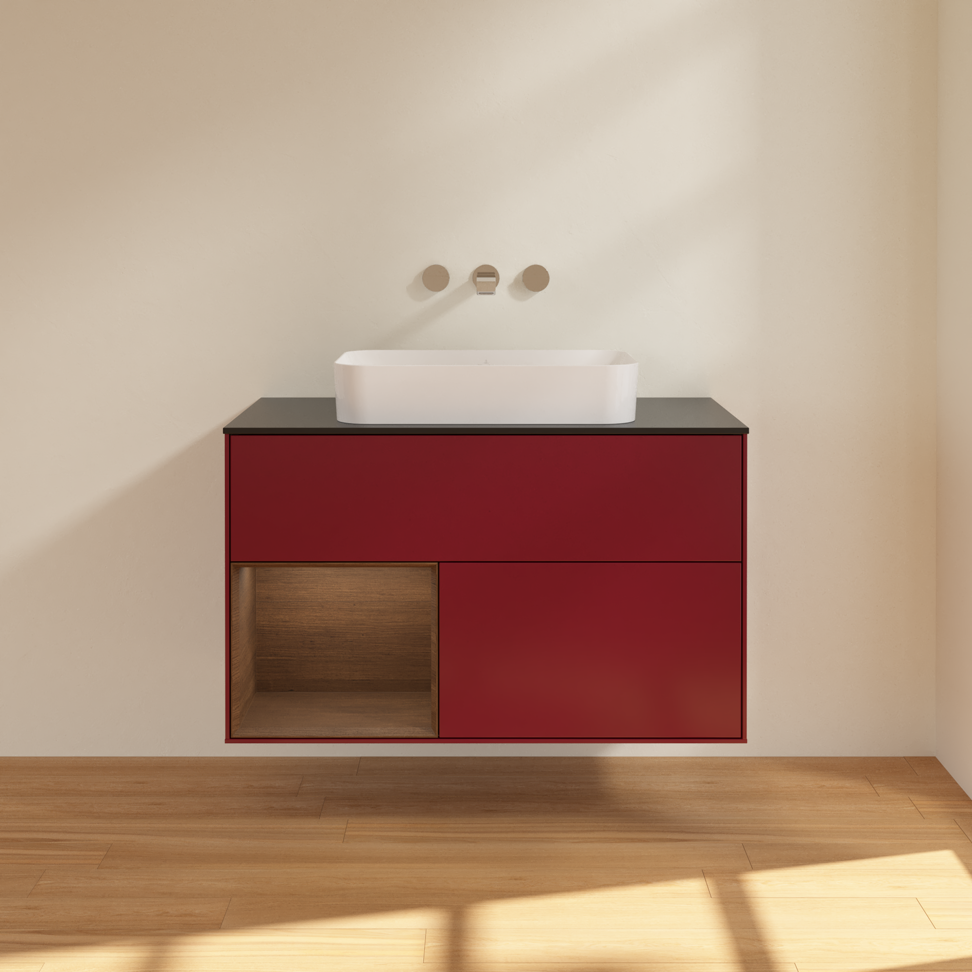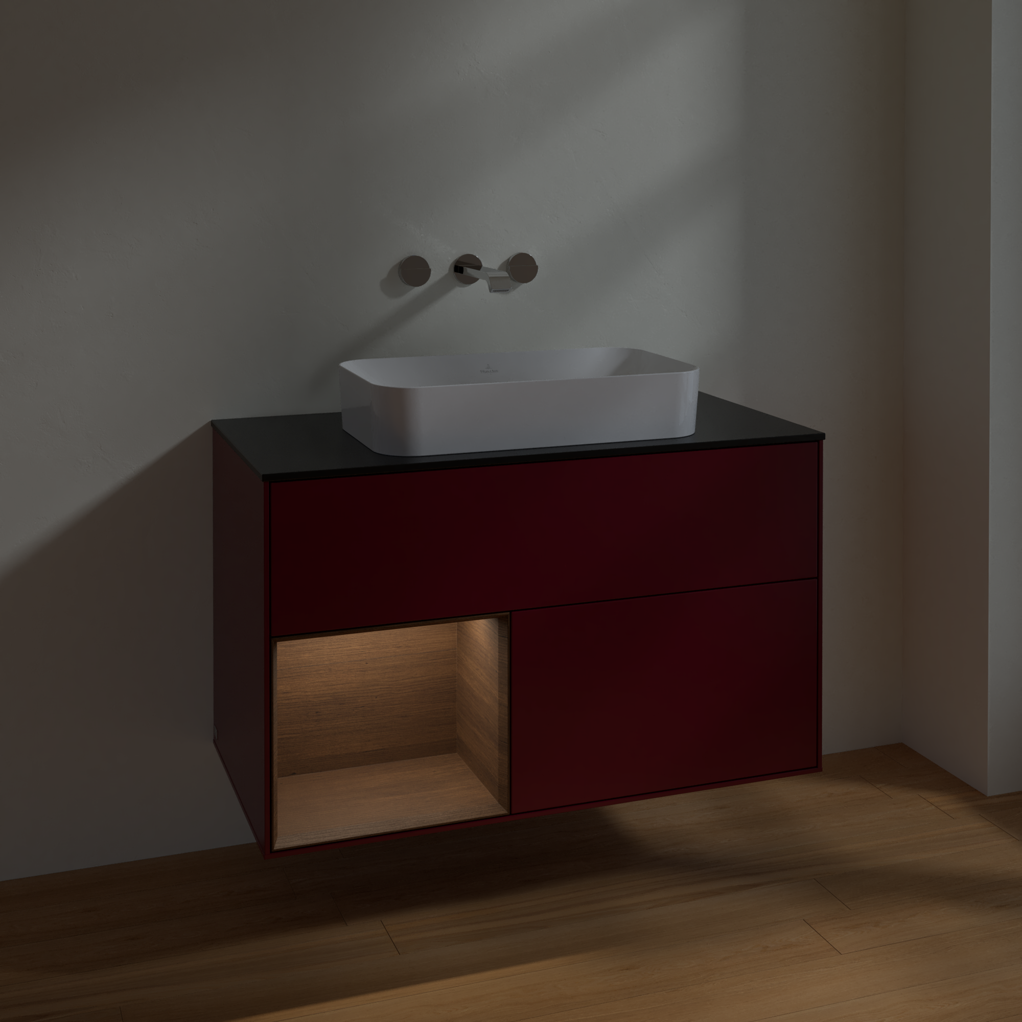 Finion Waschbeckenunterschrank, mit Beleuchtung, 2 Auszüge, 1000x603x501mm, Korpus: Peony Matt Lacquer, Front: Peony Matt Lacquer, Regalelement: Walnut Veneer, Abdeckplatte: Glass Black Matt