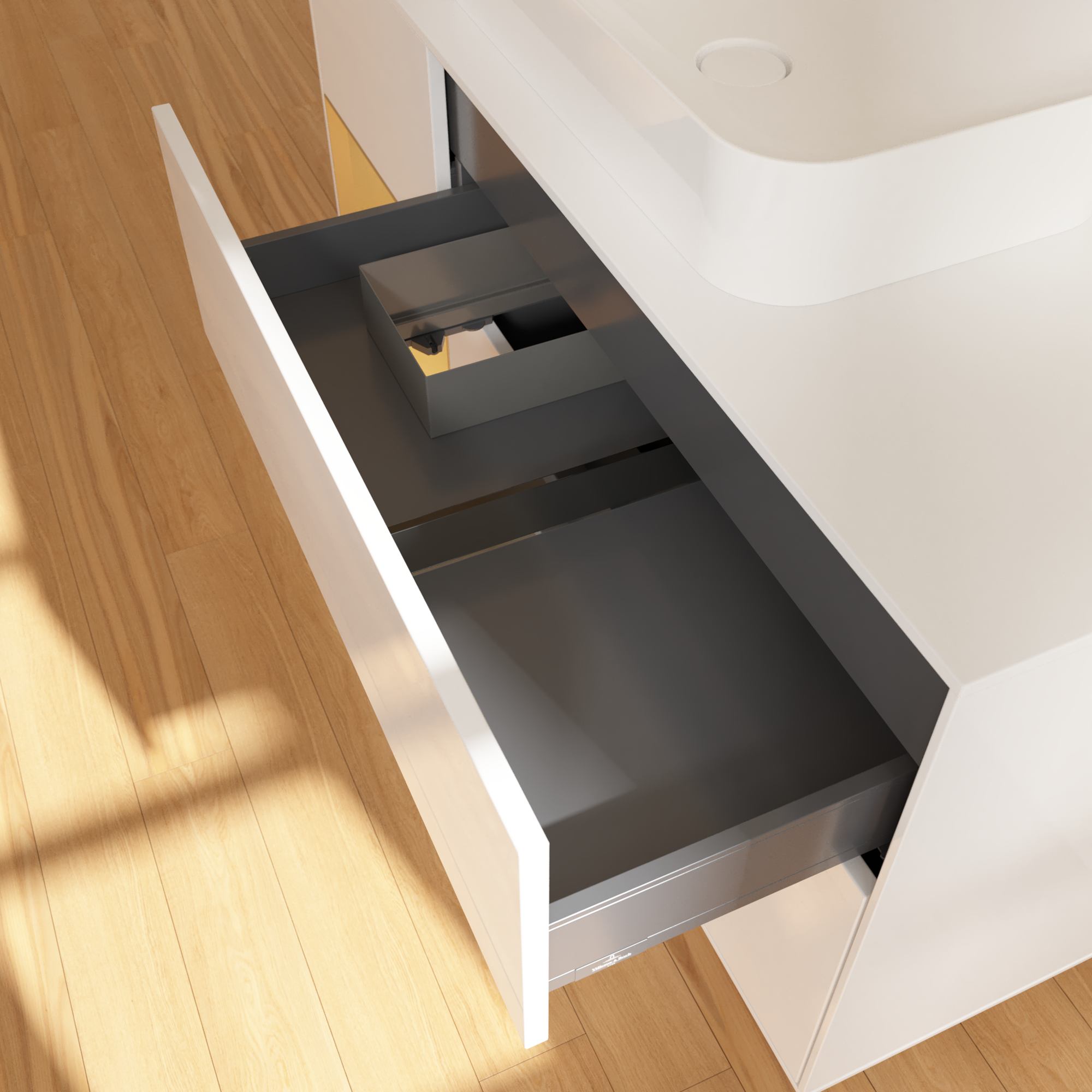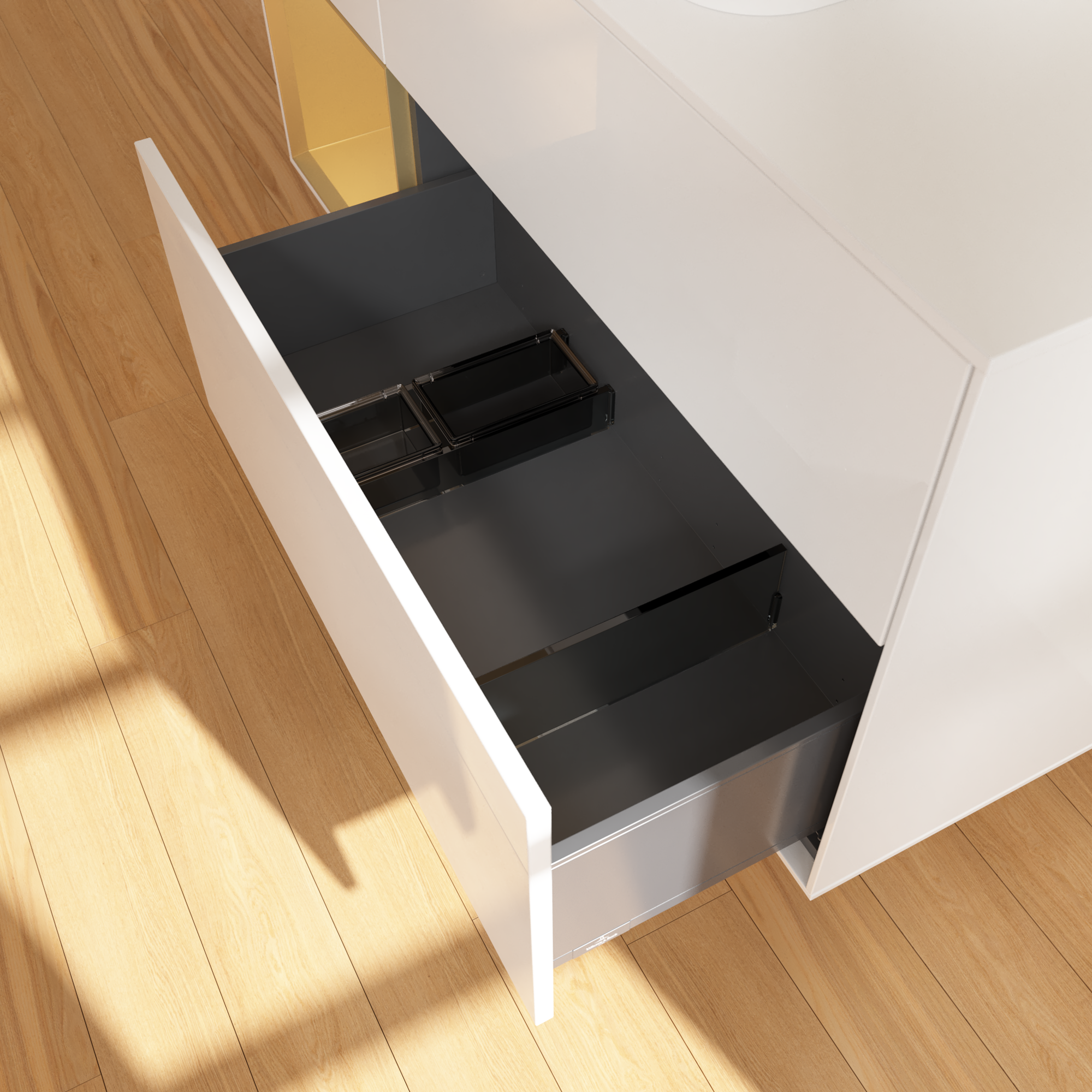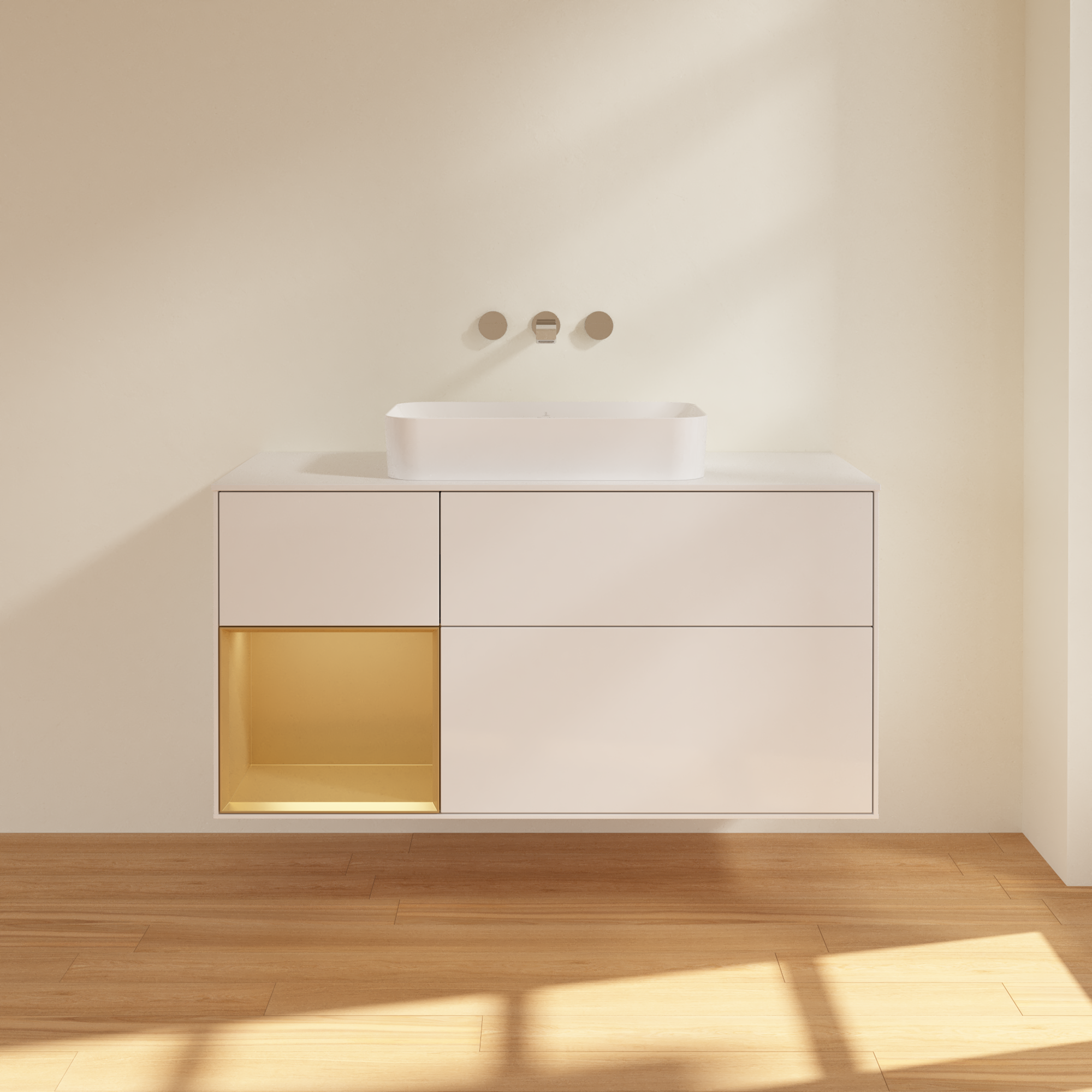 Finion Waschbeckenunterschrank, mit Beleuchtung, 3 Auszüge, 1200x603x501mm, Korpus: Glossy White Lacquer, Front: Glossy White Lacquer, Regalelement: Gold Matt Lacquer, Abdeckplatte: Glass White Matt