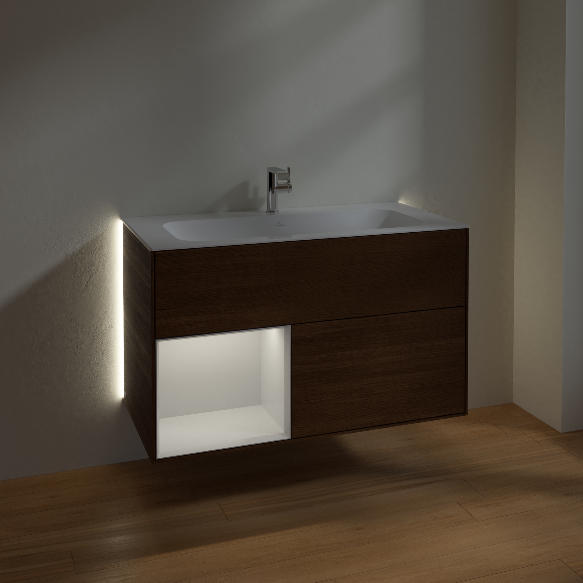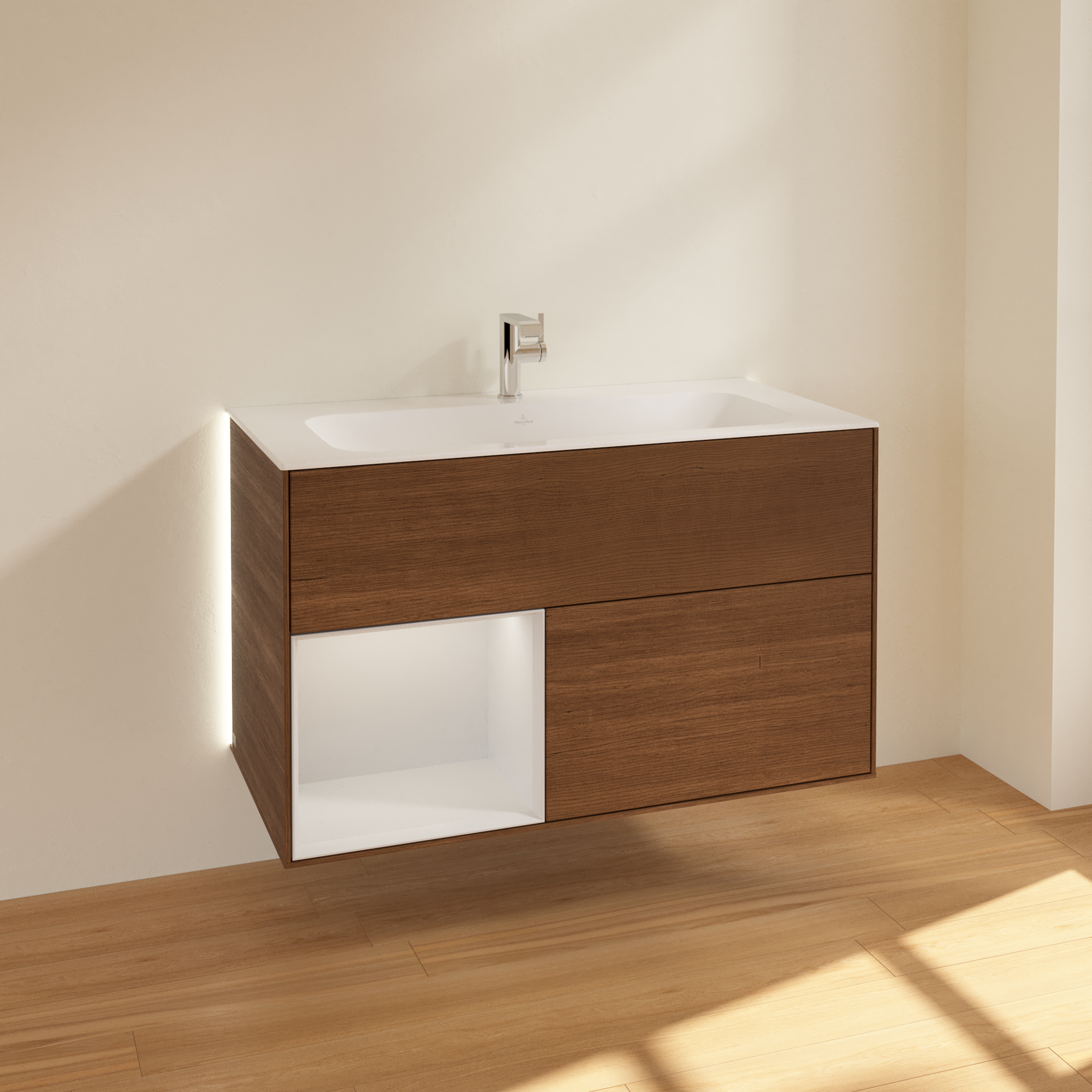 Finion Waschbeckenunterschrank, mit Beleuchtung, 2 Auszüge, 996x591x498mm, Korpus: Walnut Veneer, Front: Walnut Veneer, Regalelement: Glossy White Lacquer