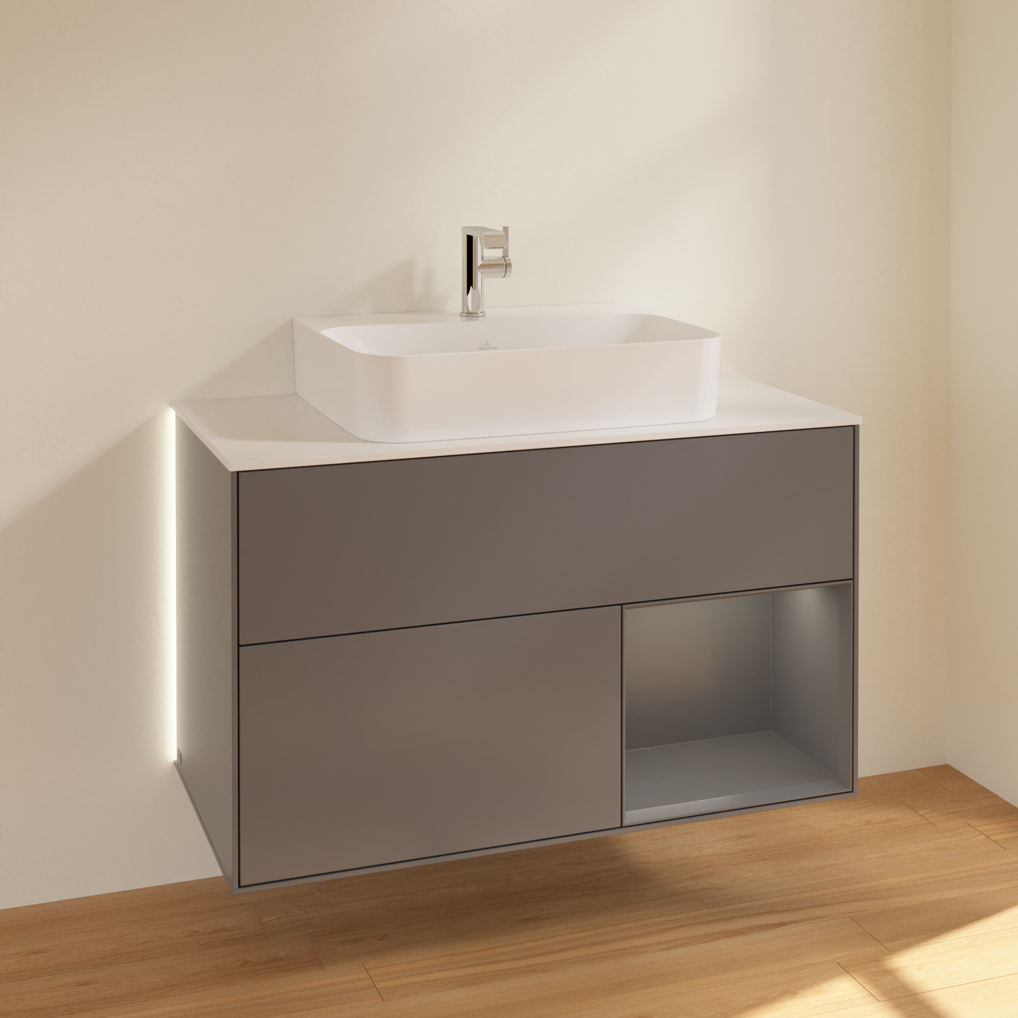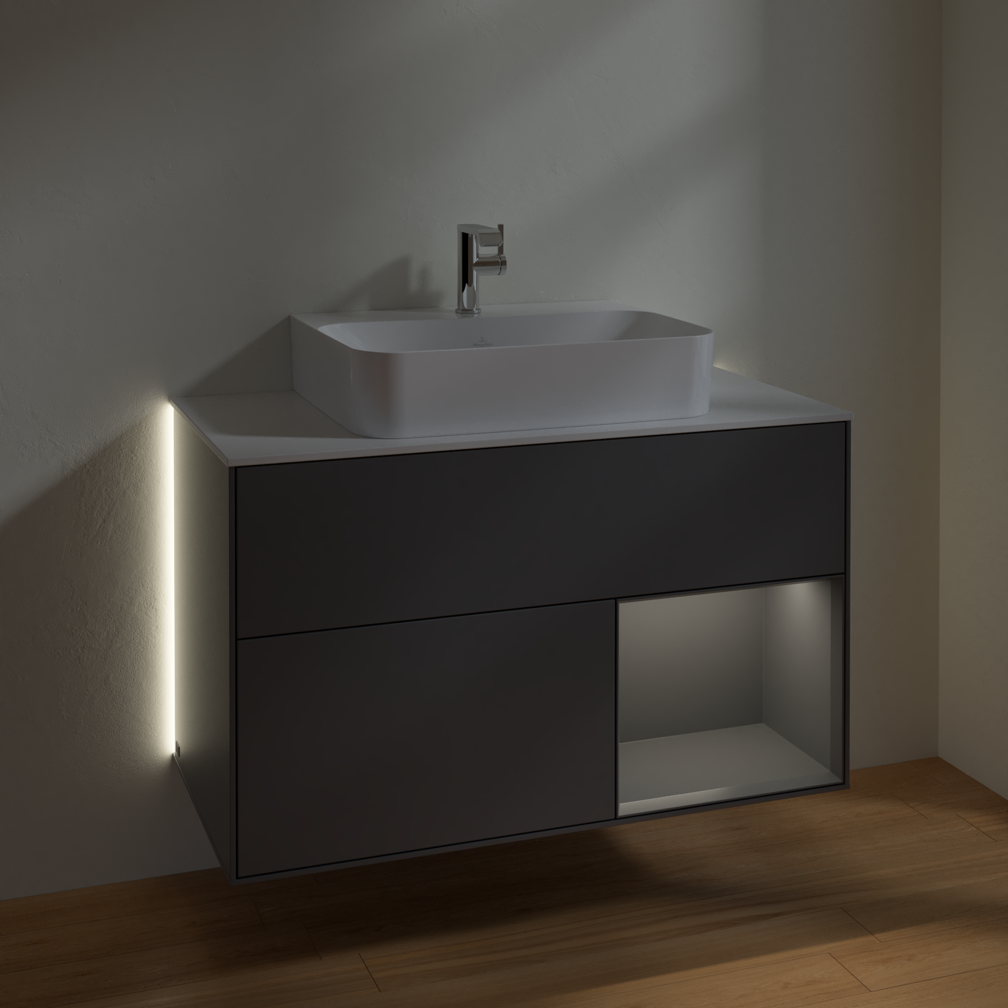 Finion Waschbeckenunterschrank, mit Beleuchtung, 2 Auszüge, 1000x603x501mm, Korpus: Anthracite Matt Lacquer, Front: Anthracite Matt Lacquer, Regalelement: Anthracite Matt Lacquer, Abdeckplatte: Glass White Matt