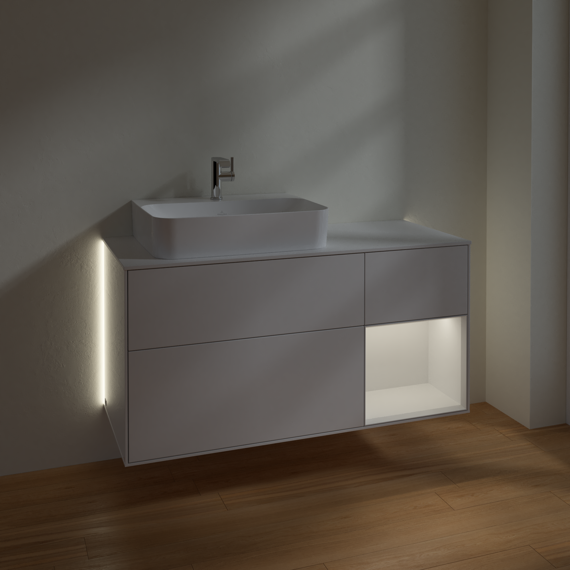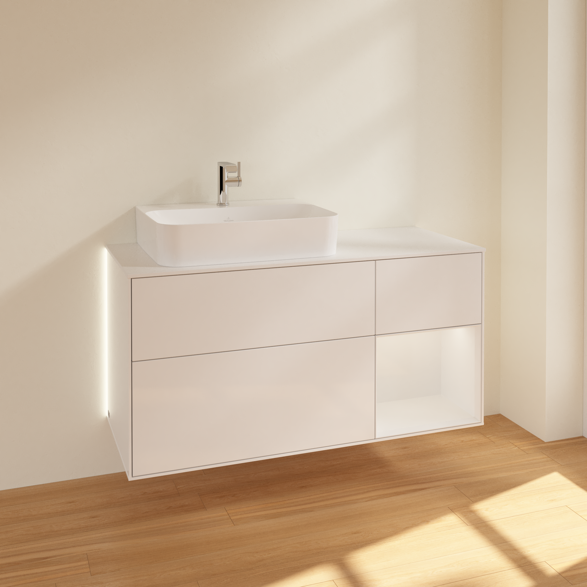 Finion Waschbeckenunterschrank, mit Beleuchtung, 3 Auszüge, 1200x603x501mm, Korpus: Glossy White Lacquer, Front: Glossy White Lacquer, Regalelement: Glossy White Lacquer, Abdeckplatte: Glass White Matt