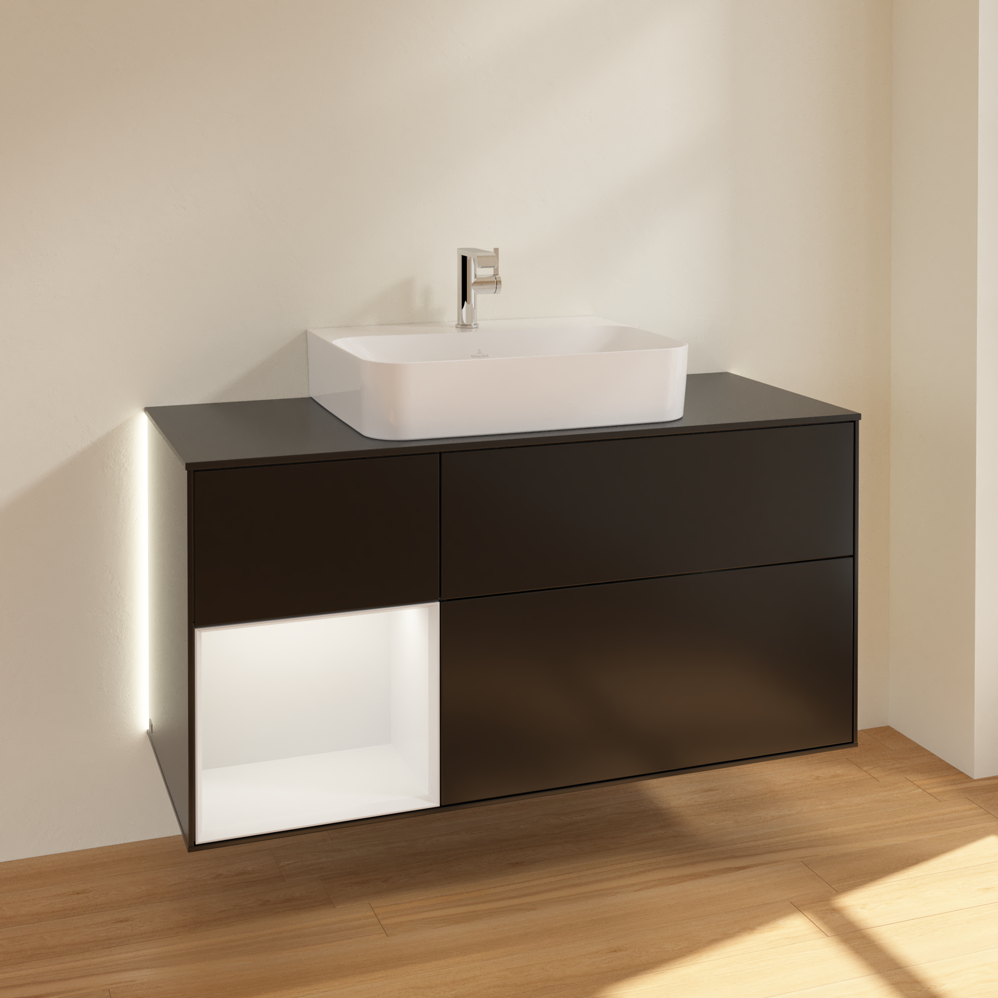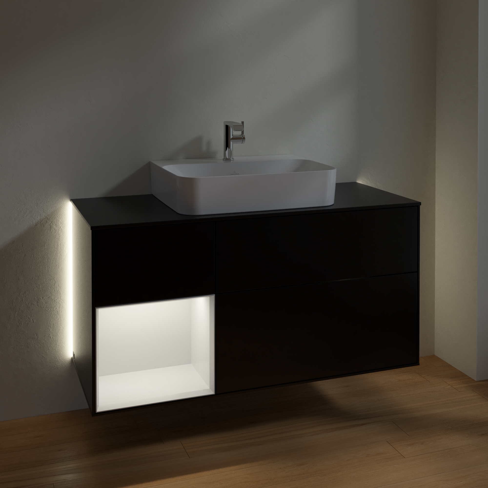 Finion Waschbeckenunterschrank, mit Beleuchtung, 3 Auszüge, 1200x603x501mm, Korpus: Black Matt Lacquer, Front: Black Matt Lacquer, Regalelement: Gold Matt Lacquer, Abdeckplatte: Glass Black Matt