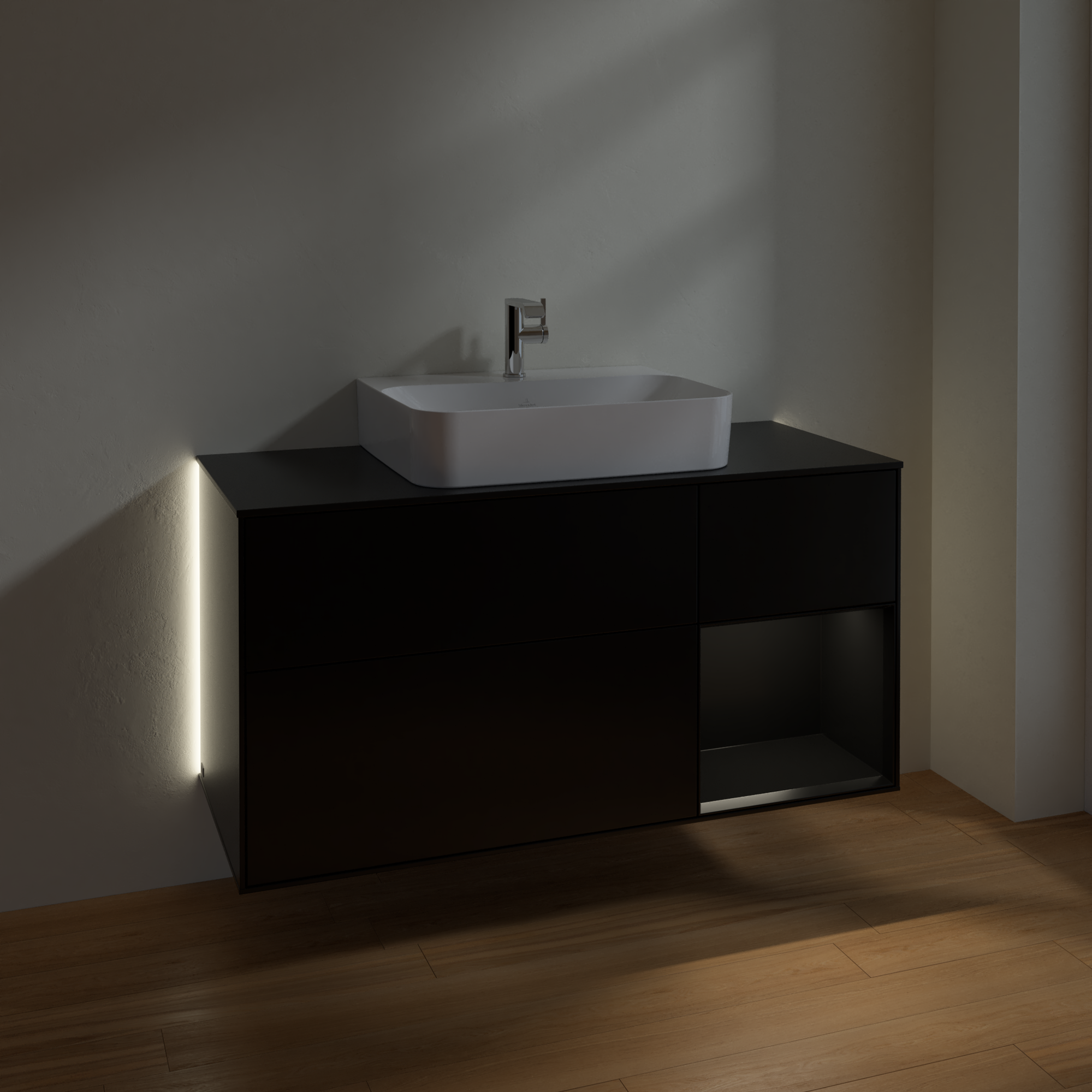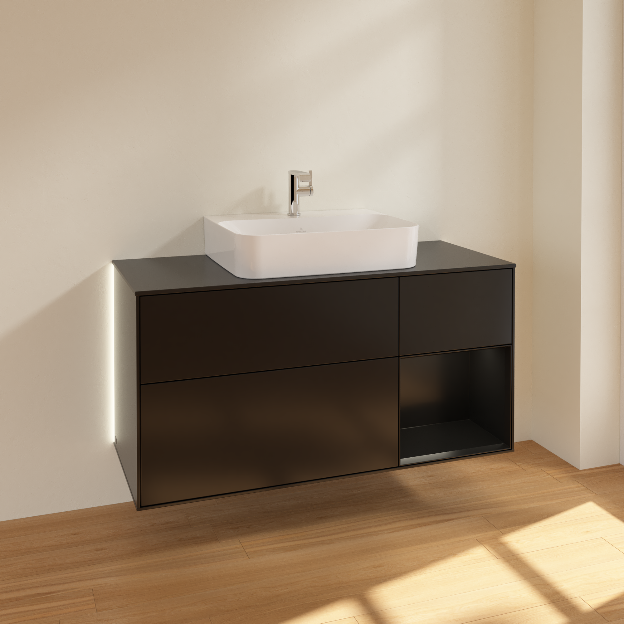 Finion Waschbeckenunterschrank, mit Beleuchtung, 3 Auszüge, 1200x603x501mm, Korpus: Black Matt Lacquer, Front: Black Matt Lacquer, Regalelement: Black Matt Lacquer, Abdeckplatte: Glass Black Matt