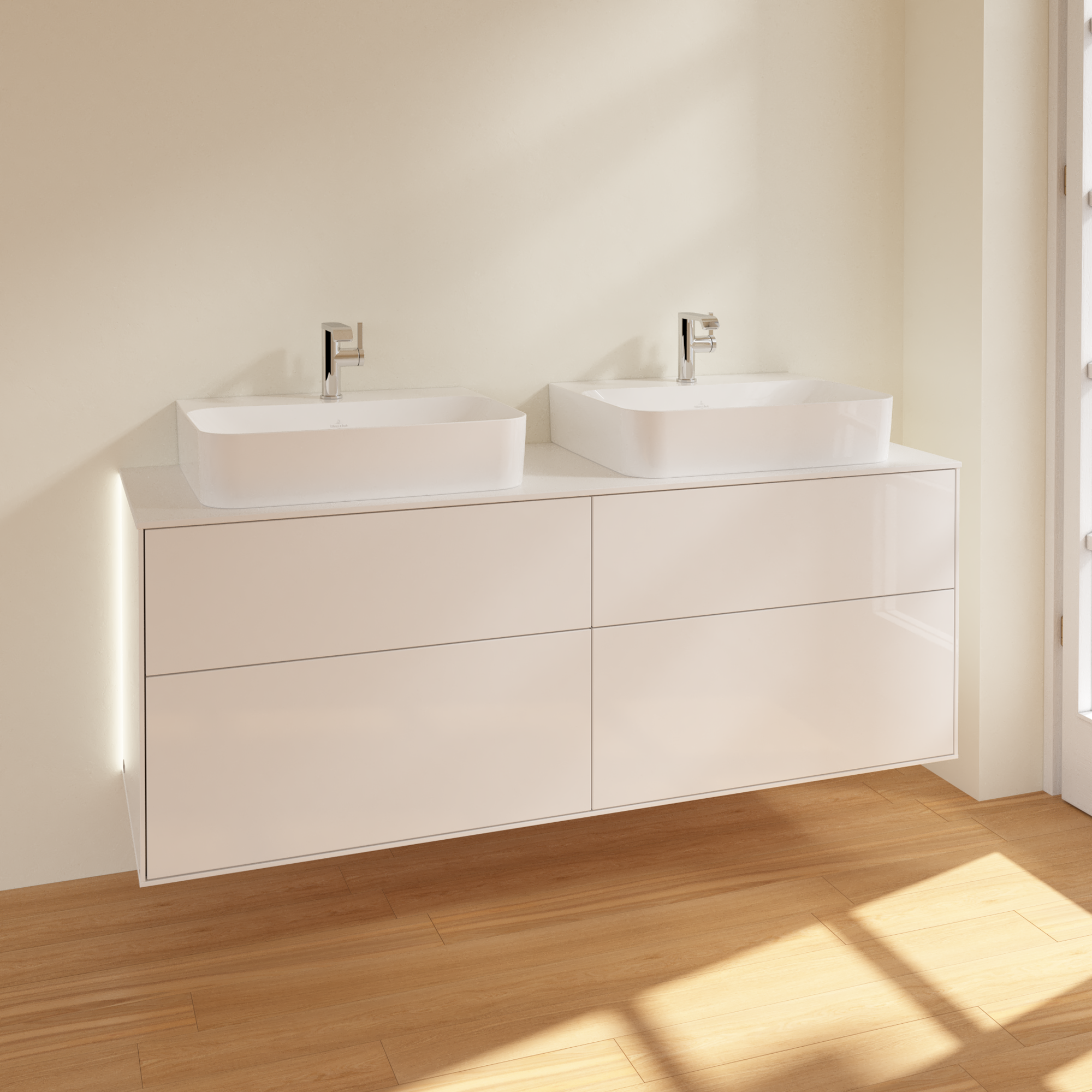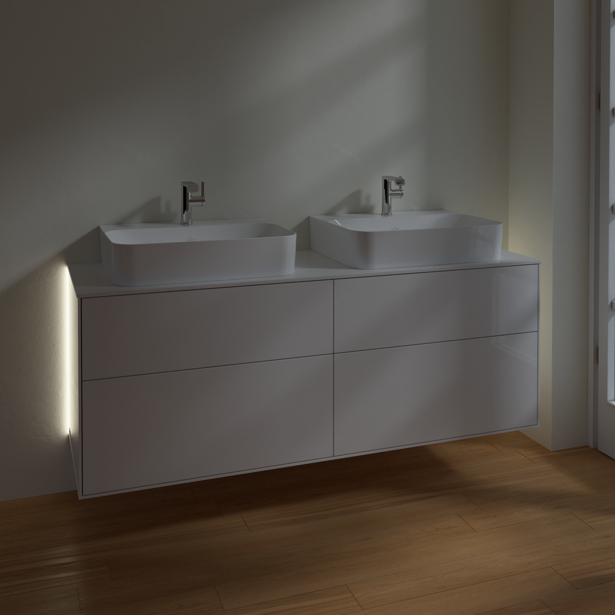 Finion Waschbeckenunterschrank, mit Beleuchtung, 4 Auszüge, 1600x603x501mm, Korpus: Glossy White Lacquer, Front: Glossy White Lacquer, Abdeckplatte: Glass White Matt