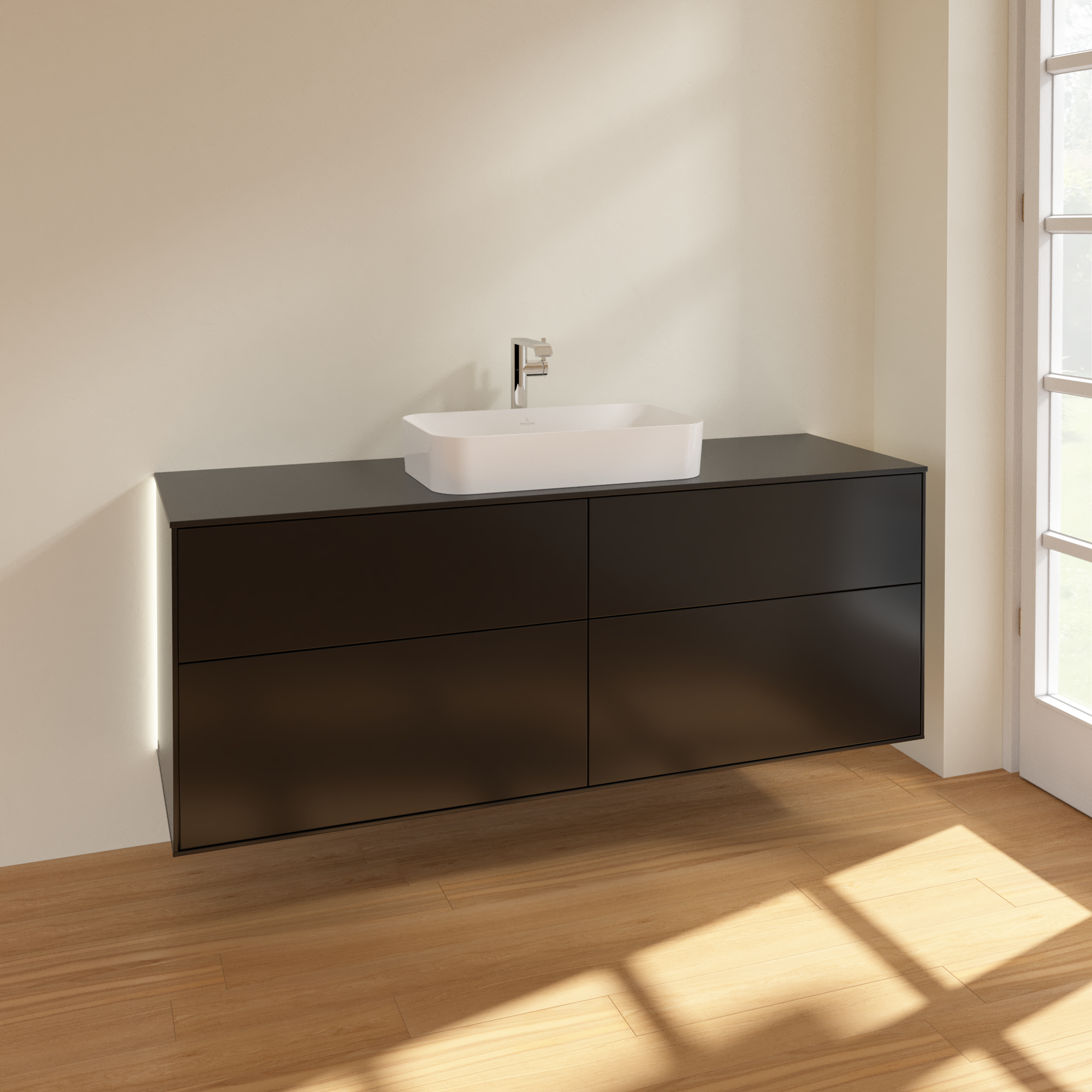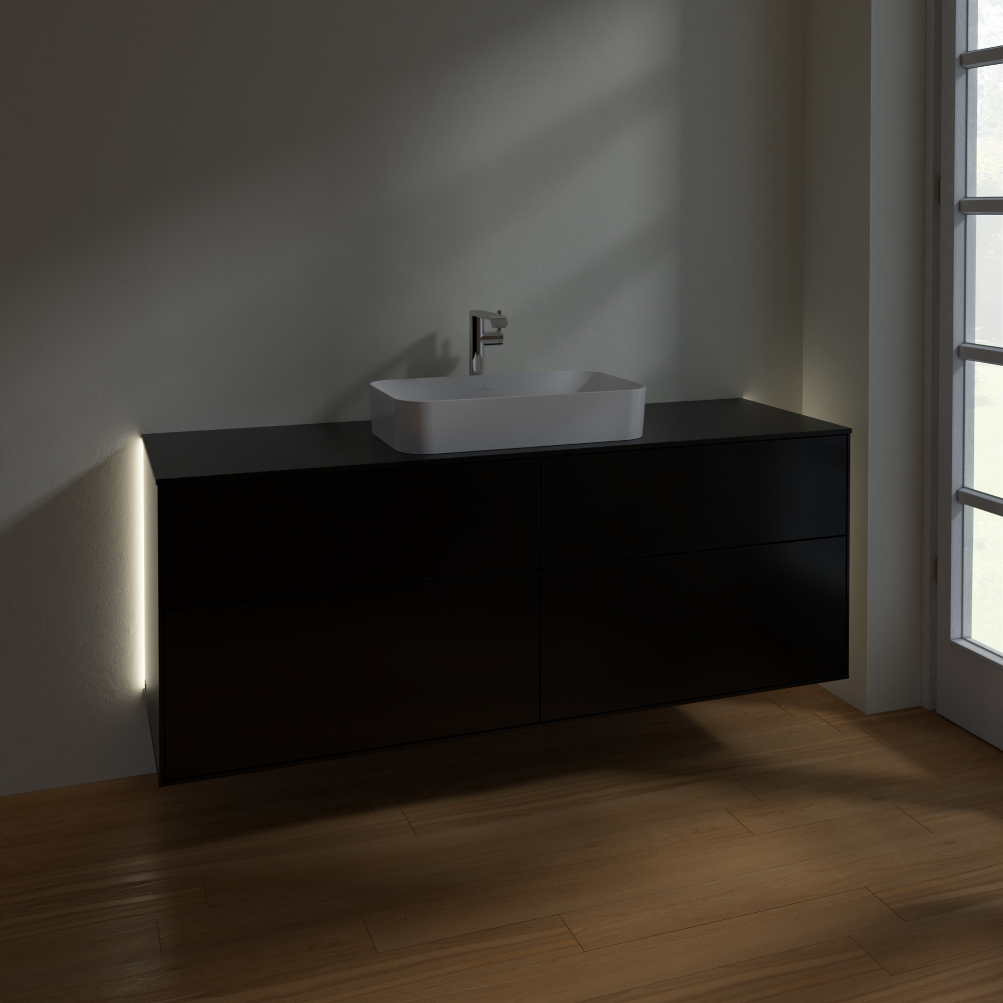 Finion Waschbeckenunterschrank, mit Beleuchtung, 4 Auszüge, 1600x603x501mm, Korpus: Black Matt Lacquer, Front: Black Matt Lacquer, Abdeckplatte: Glass Black Matt