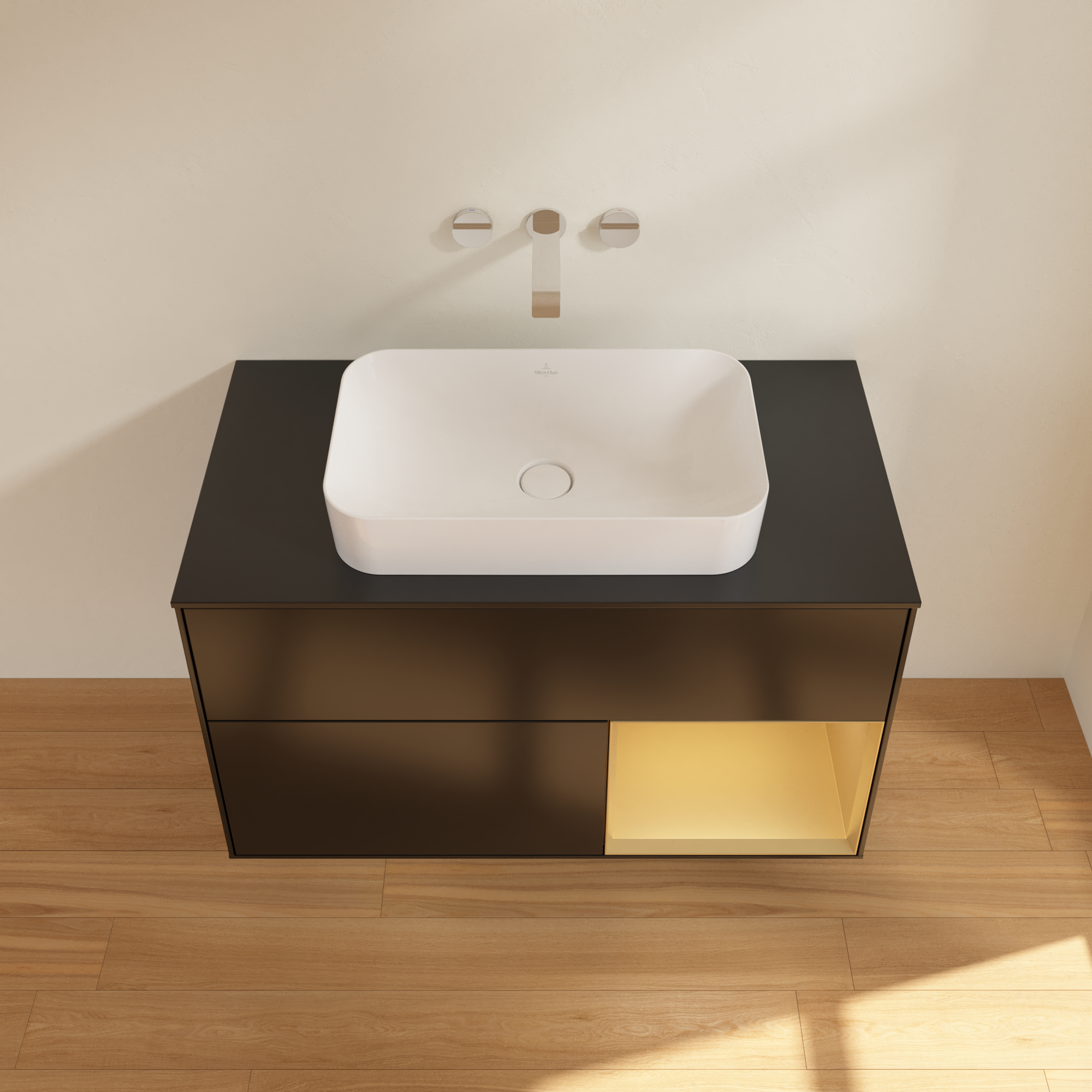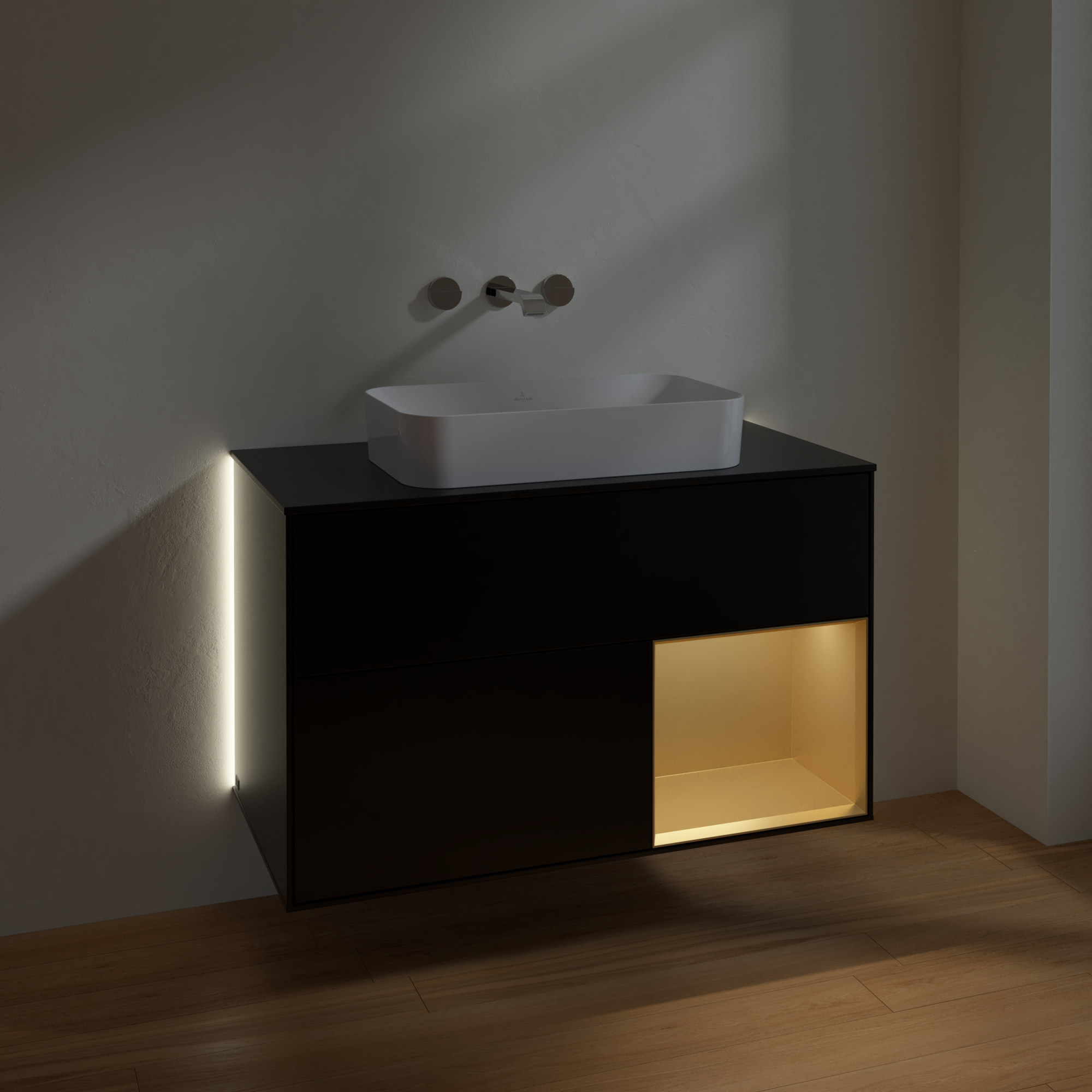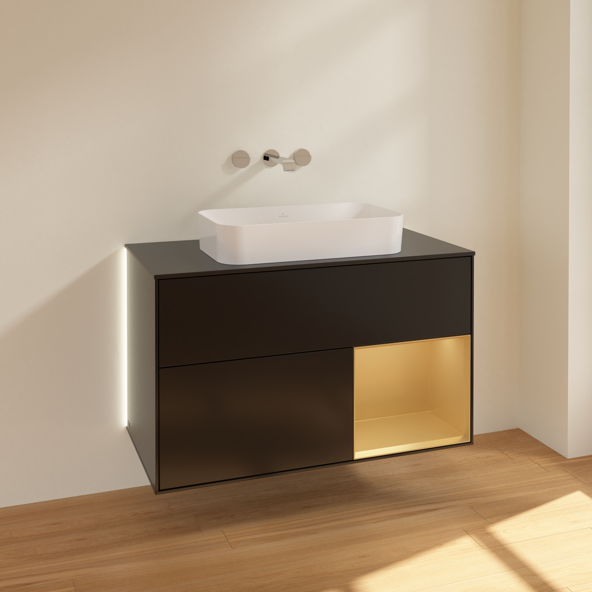 Finion Waschbeckenunterschrank, mit Beleuchtung, 2 Auszüge, 1000x603x501mm, Korpus: Black Matt Lacquer, Front: Black Matt Lacquer, Regalelement: Gold Matt Lacquer, Abdeckplatte: Glass Black Matt