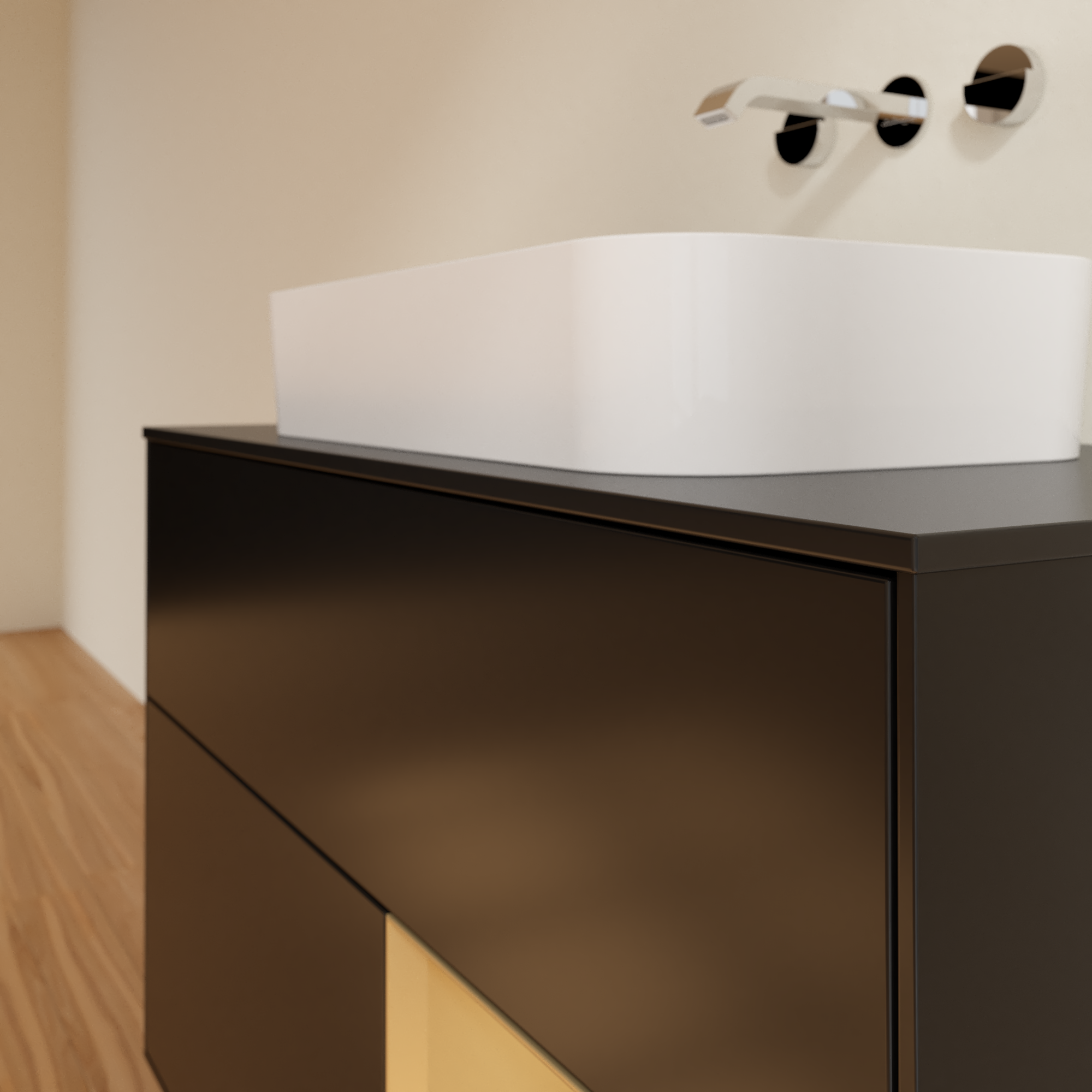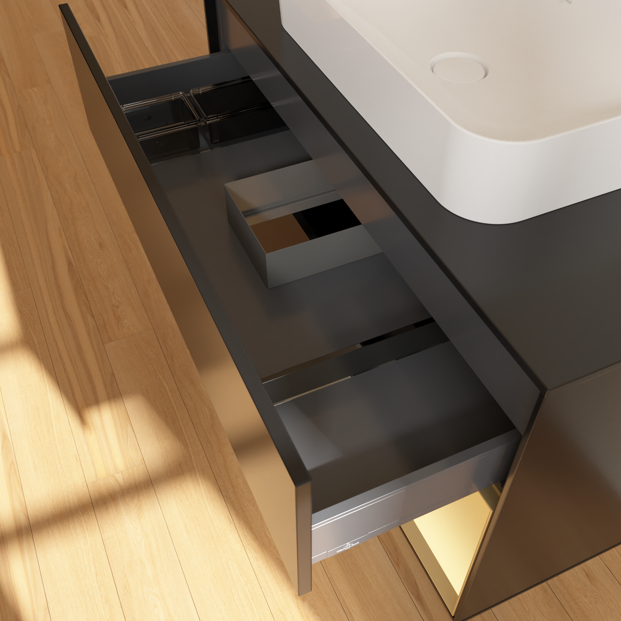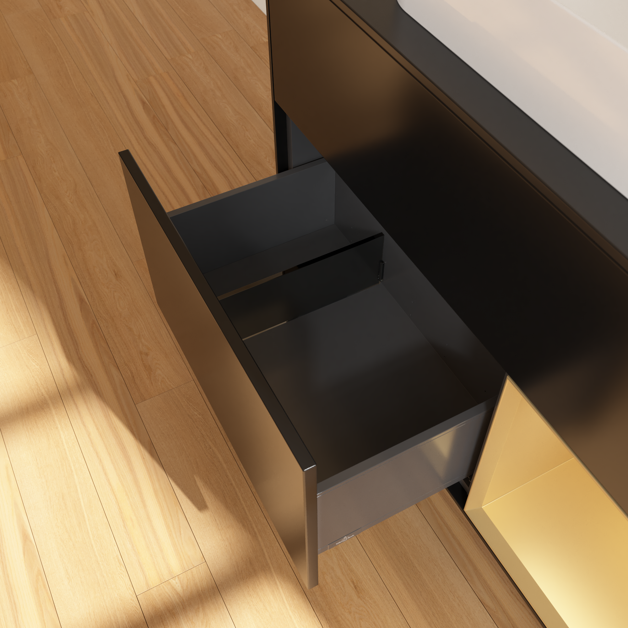 Finion Waschbeckenunterschrank, mit Beleuchtung, 2 Auszüge, 1000x603x501mm, Korpus: Black Matt Lacquer, Front: Black Matt Lacquer, Regalelement: Gold Matt Lacquer, Abdeckplatte: Glass Black Matt