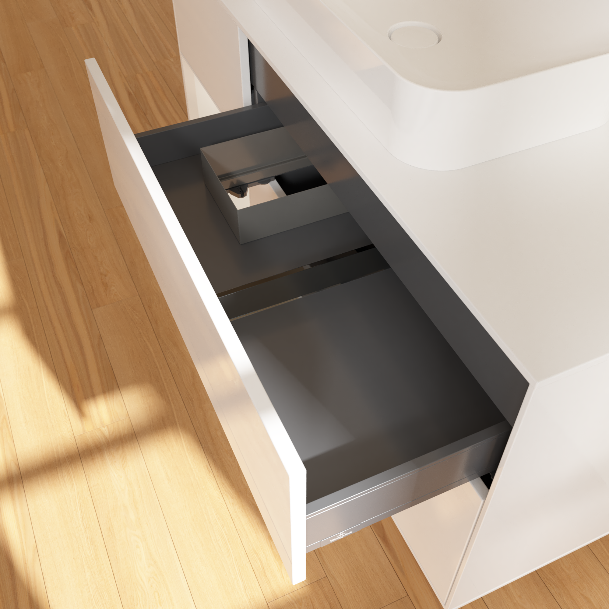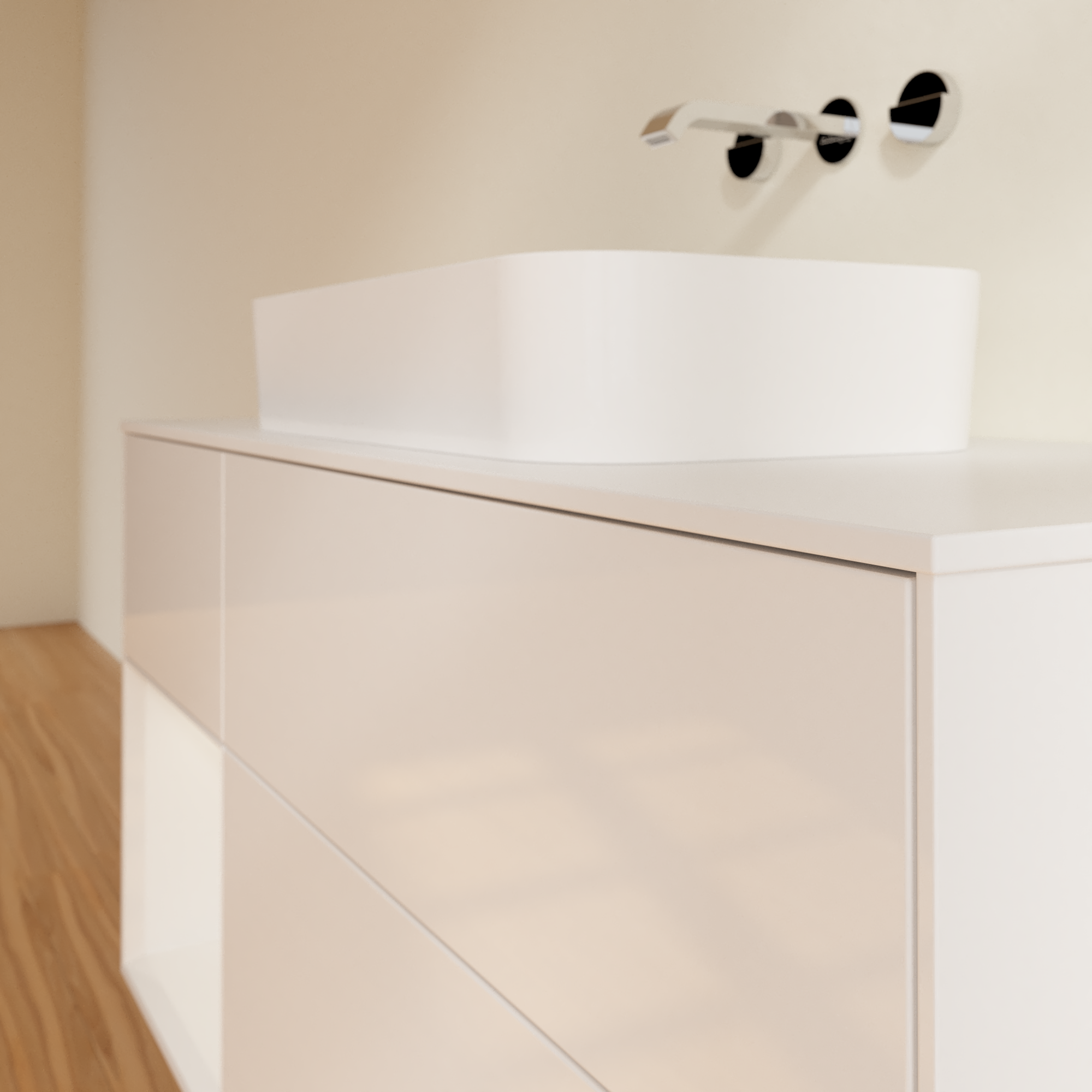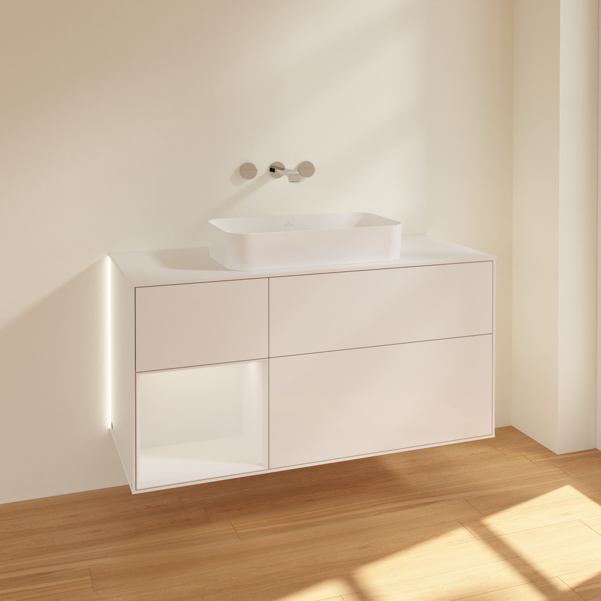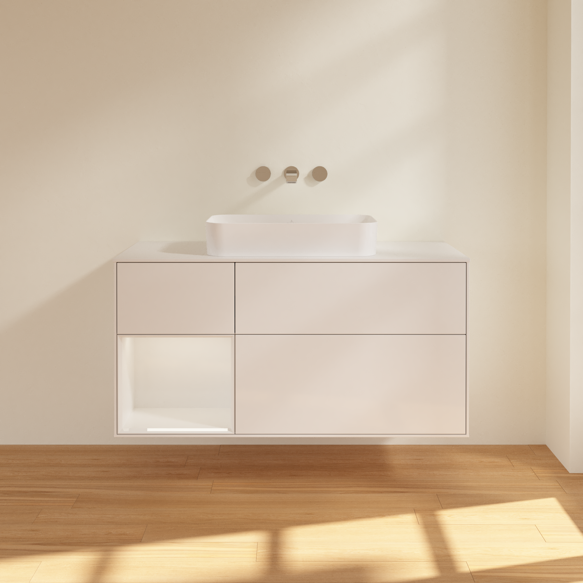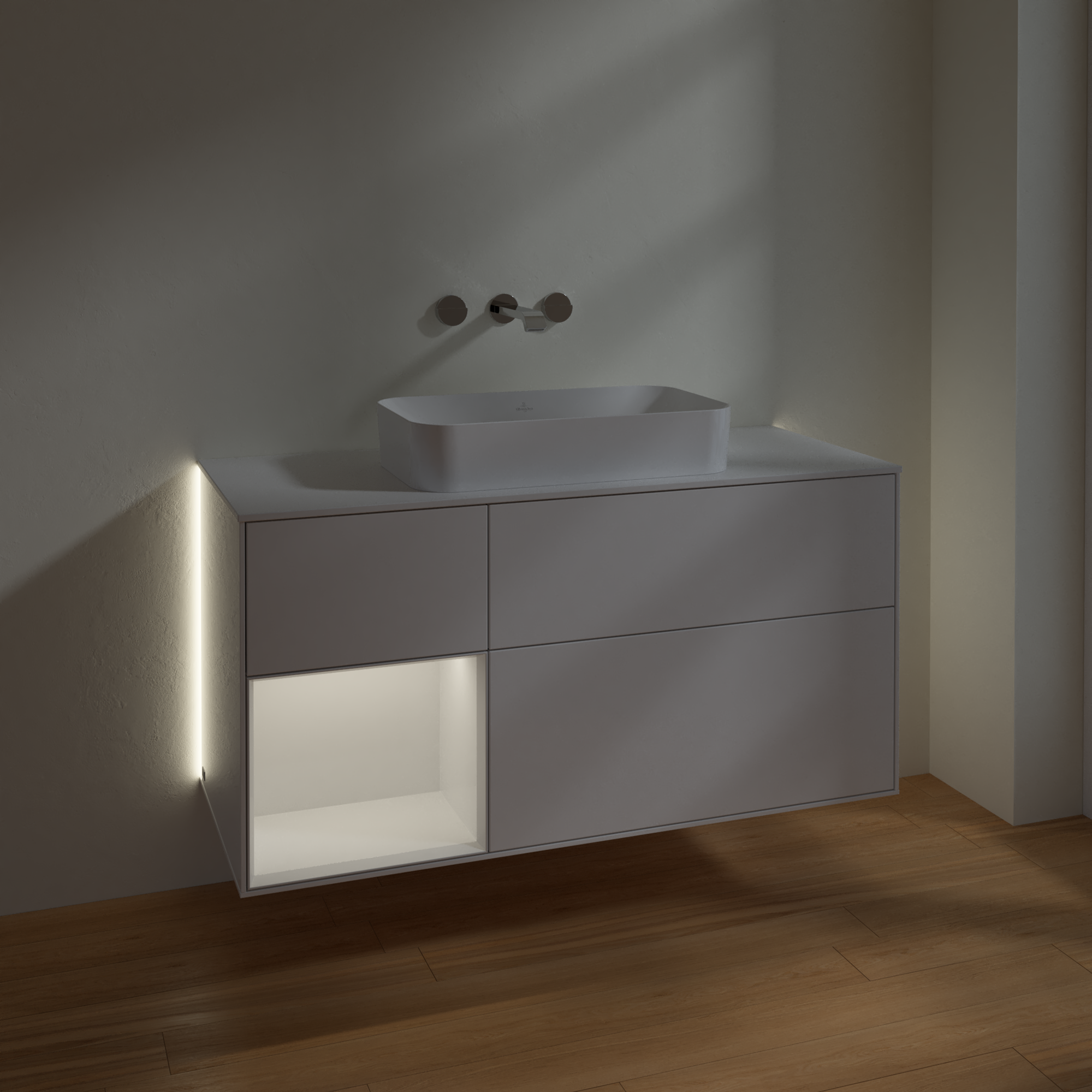 Finion Waschbeckenunterschrank, mit Beleuchtung, 3 Auszüge, 1200x603x501mm, Korpus: Glossy White Lacquer, Front: Glossy White Lacquer, Regalelement: Glossy White Lacquer, Abdeckplatte: Glass White Matt