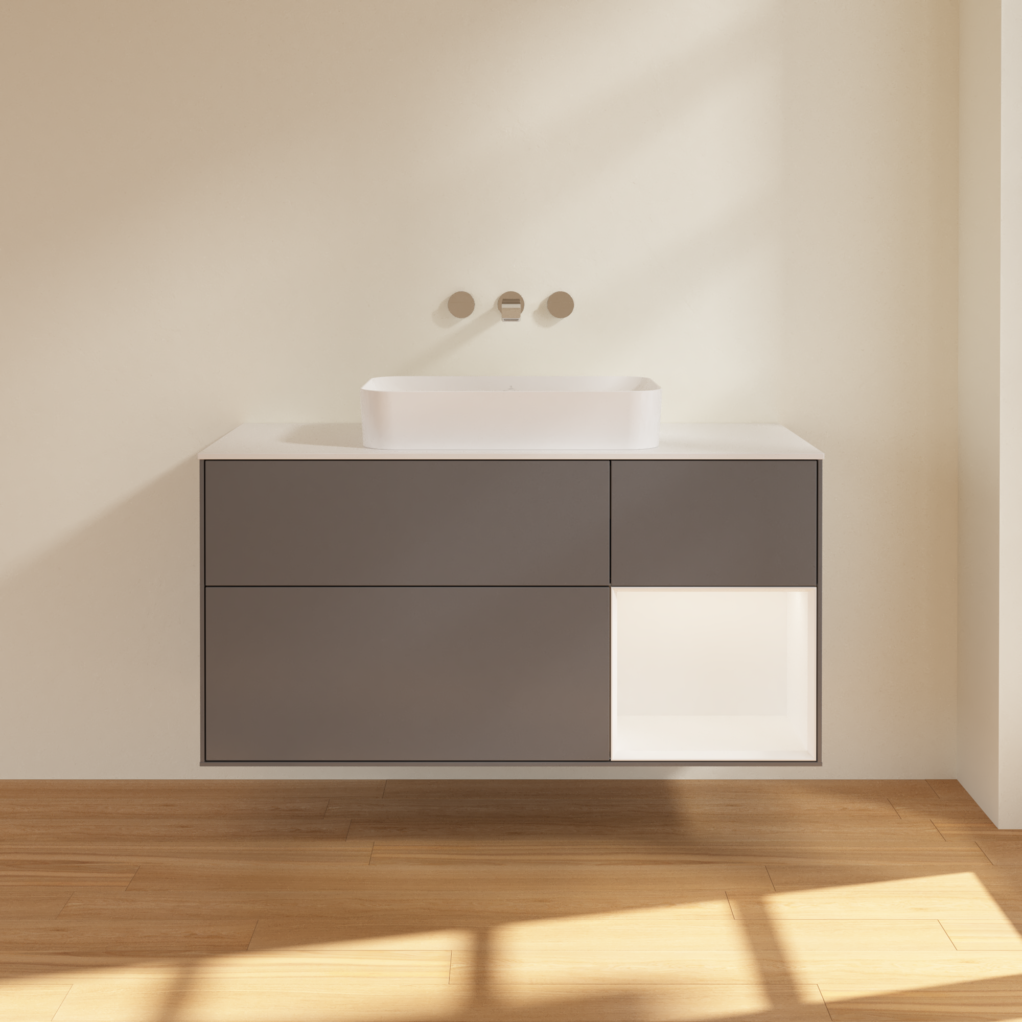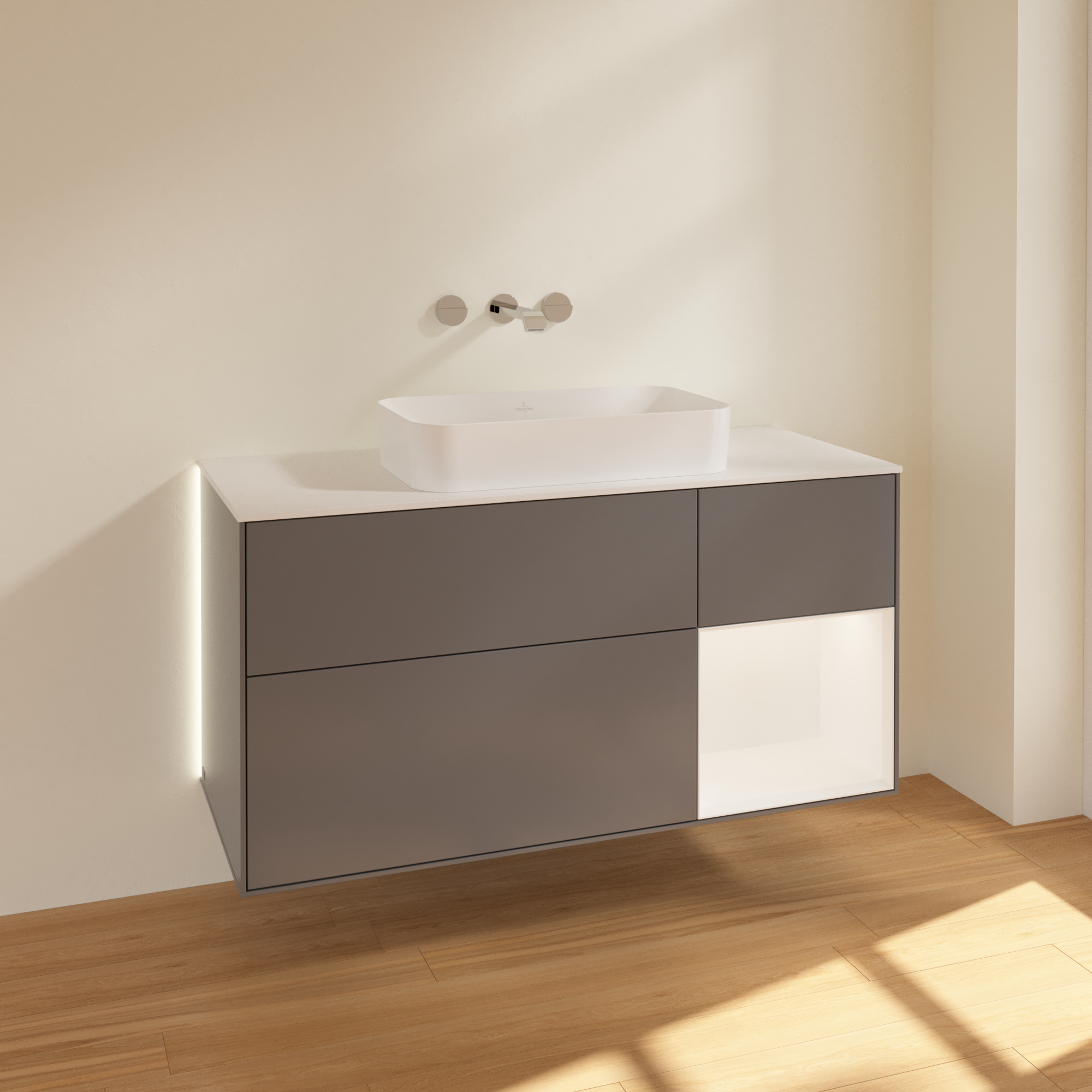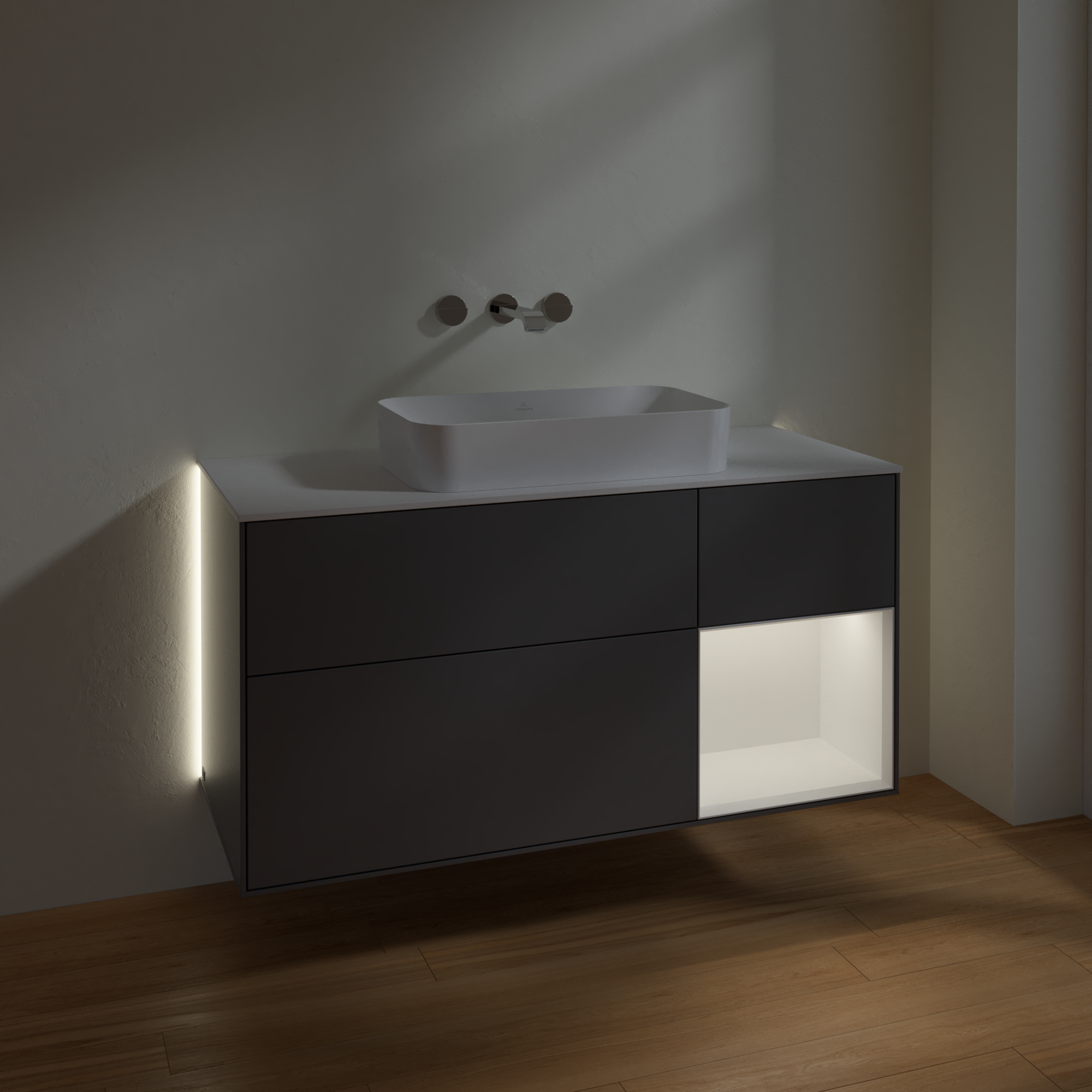 Finion Waschbeckenunterschrank, mit Beleuchtung, 3 Auszüge, 1200x603x501mm, Korpus: Anthracite Matt Lacquer, Front: Anthracite Matt Lacquer, Regalelement: White Matt Lacquer, Abdeckplatte: Glass White Matt
