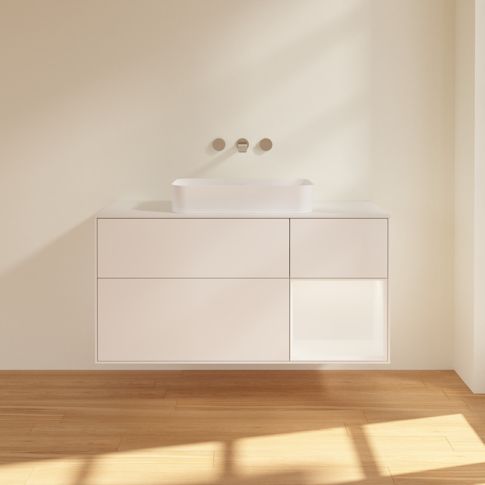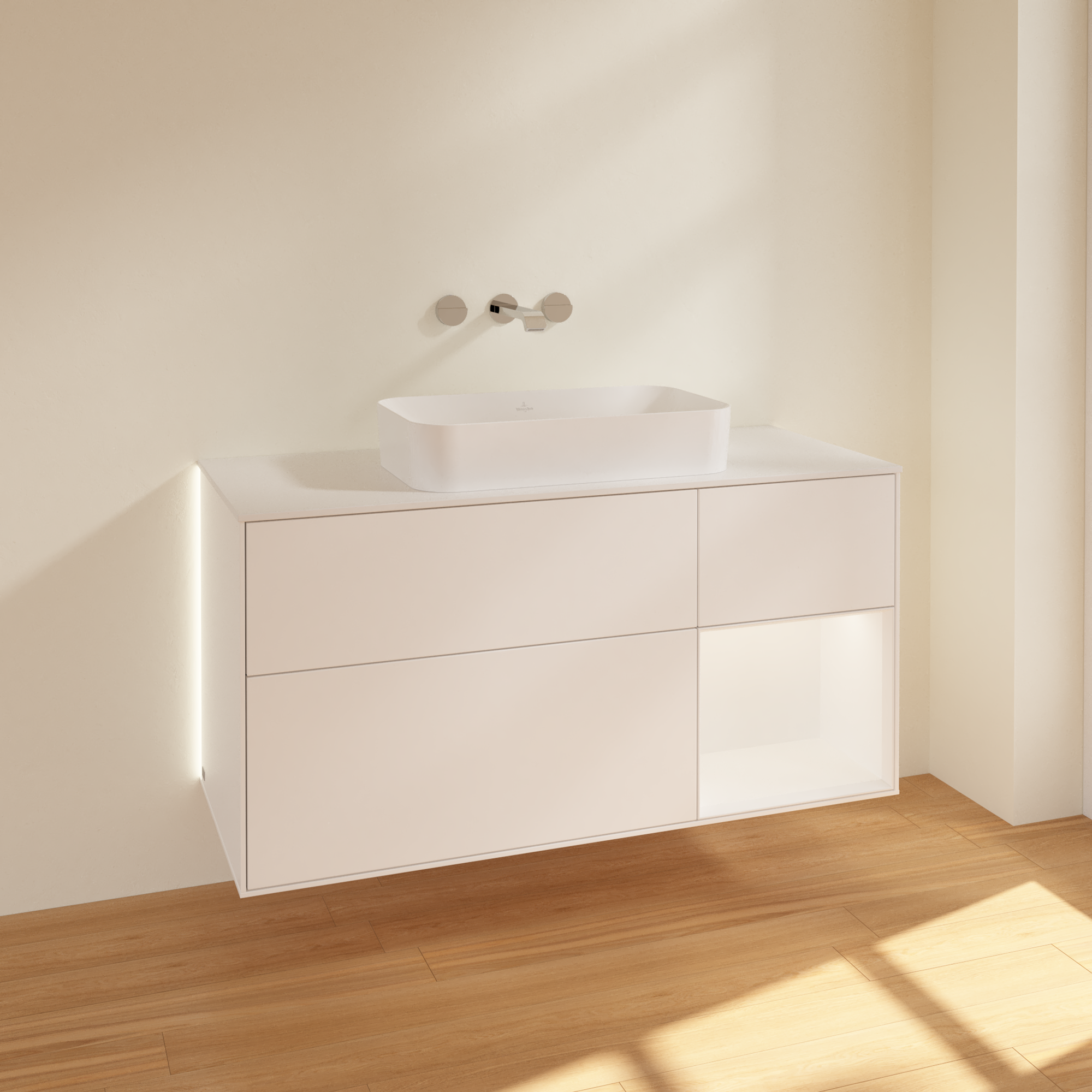 Finion Waschbeckenunterschrank, mit Beleuchtung, 3 Auszüge, 1200x603x501mm, Korpus: White Matt Lacquer, Front: White Matt Lacquer, Regalelement: White Matt Lacquer, Abdeckplatte: Glass White Matt