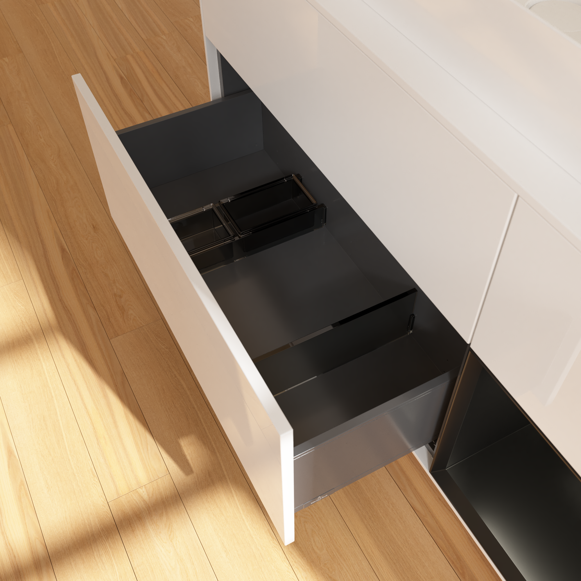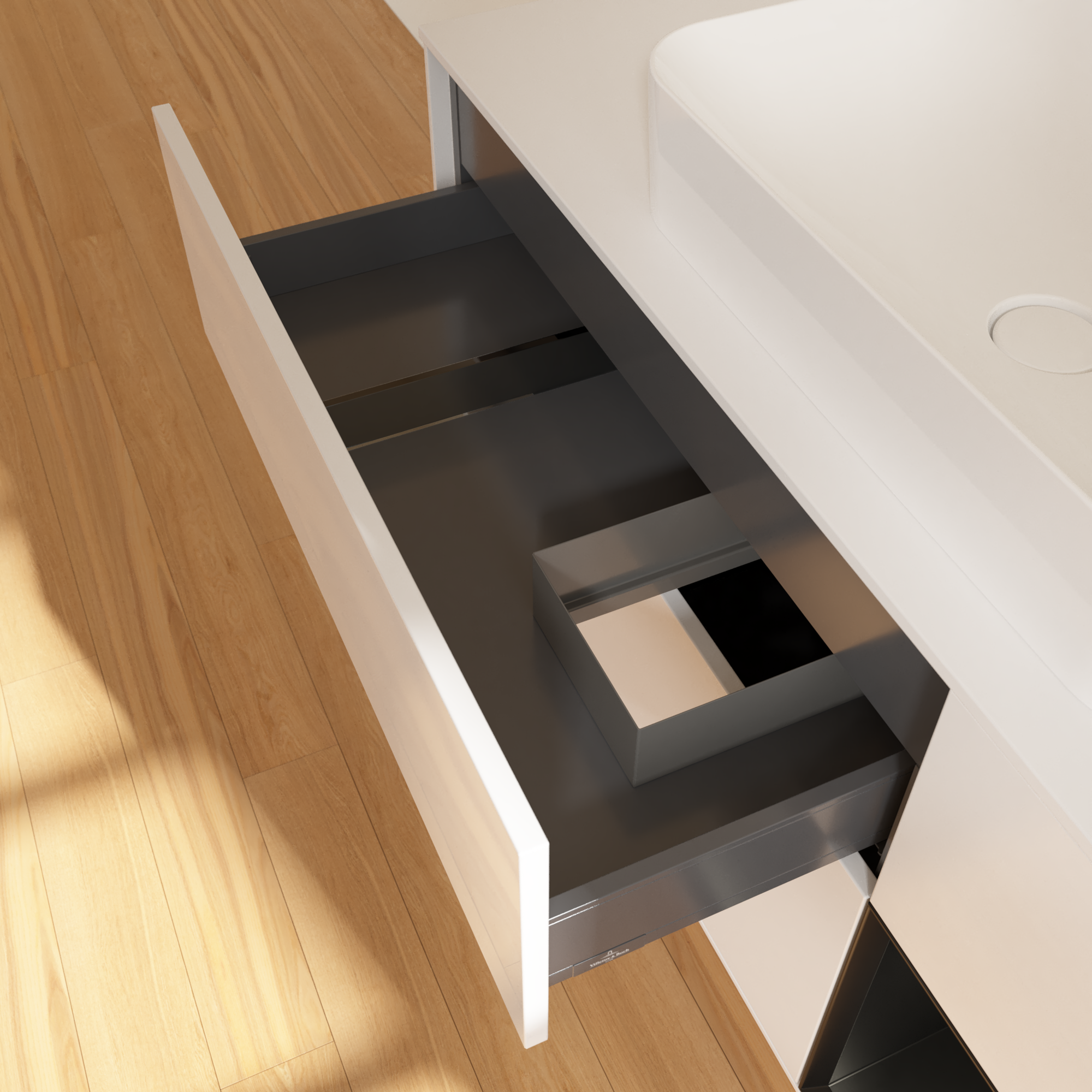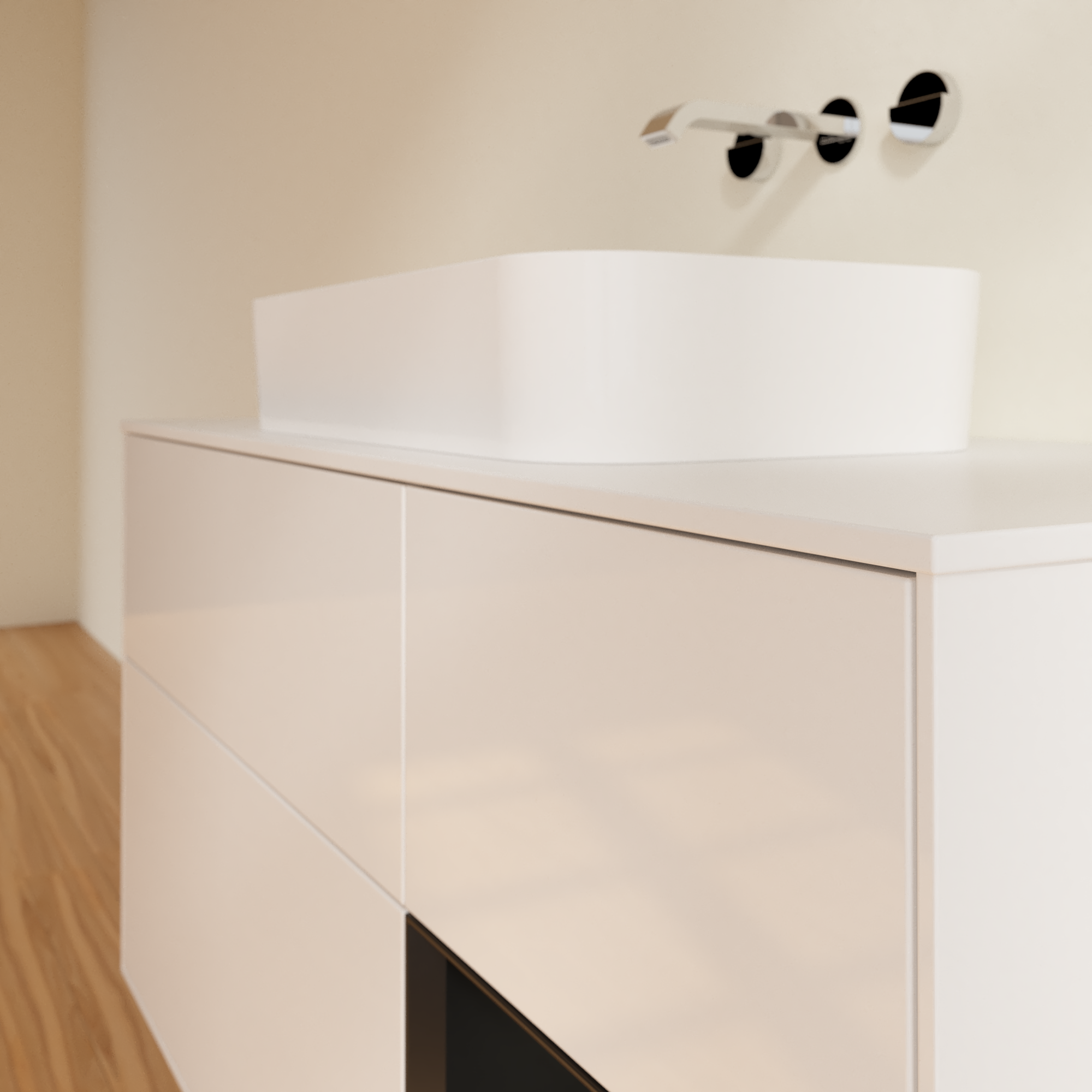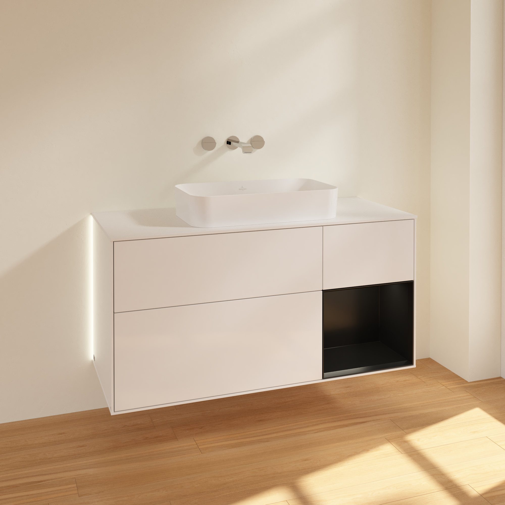 Finion Waschbeckenunterschrank, mit Beleuchtung, 3 Auszüge, 1200x603x501mm, Korpus: Glossy White Lacquer, Front: Glossy White Lacquer, Regalelement: Black Matt Lacquer, Abdeckplatte: Glass White Matt