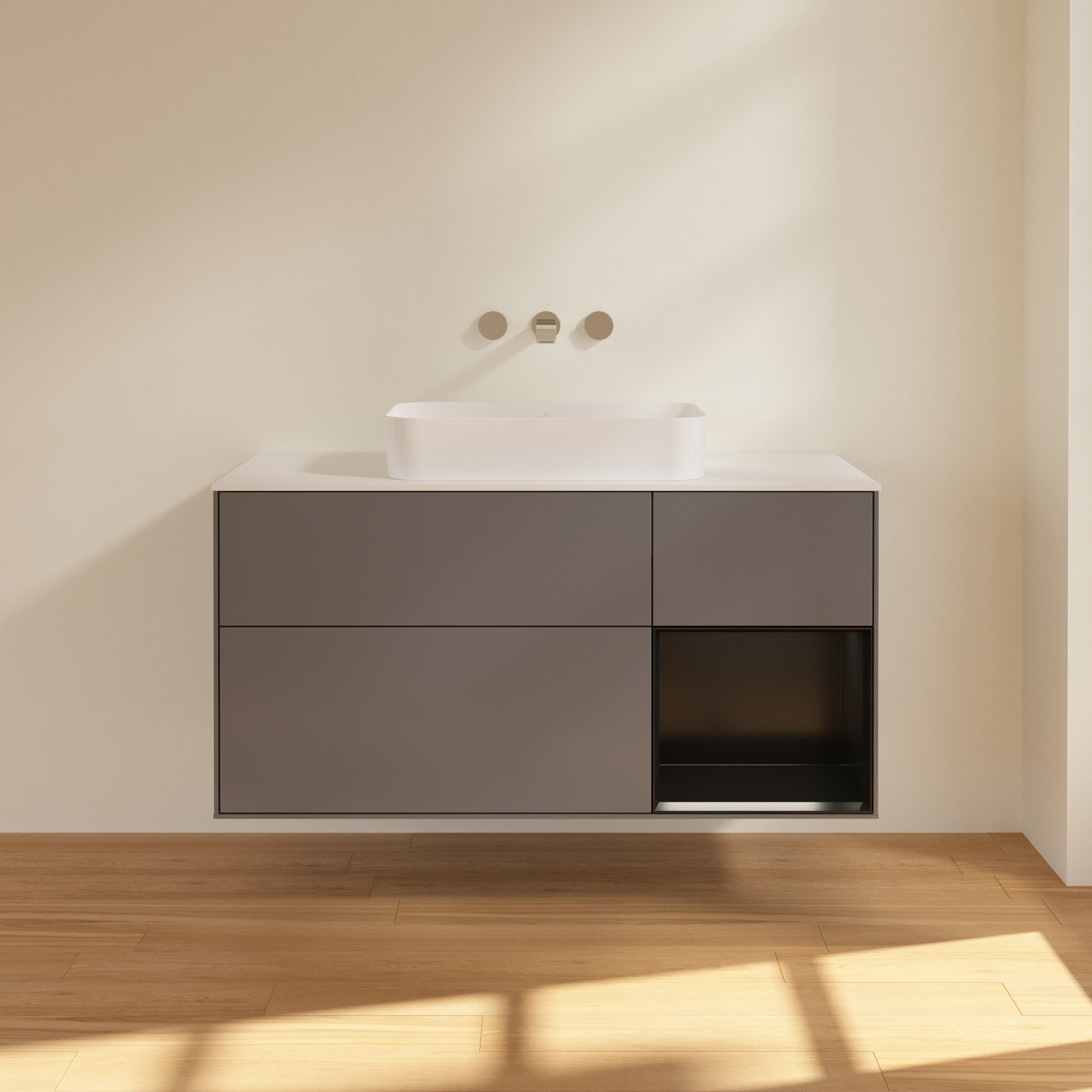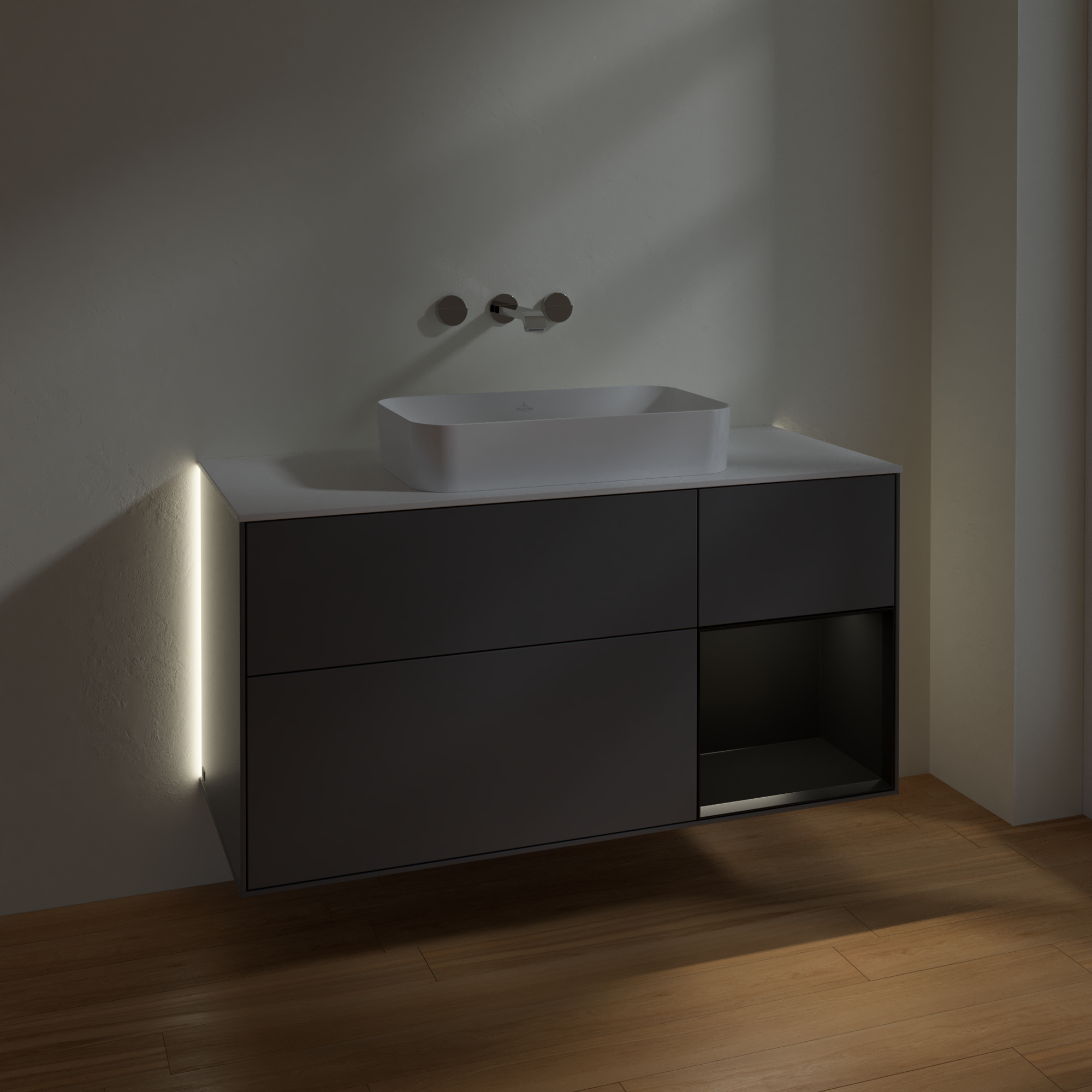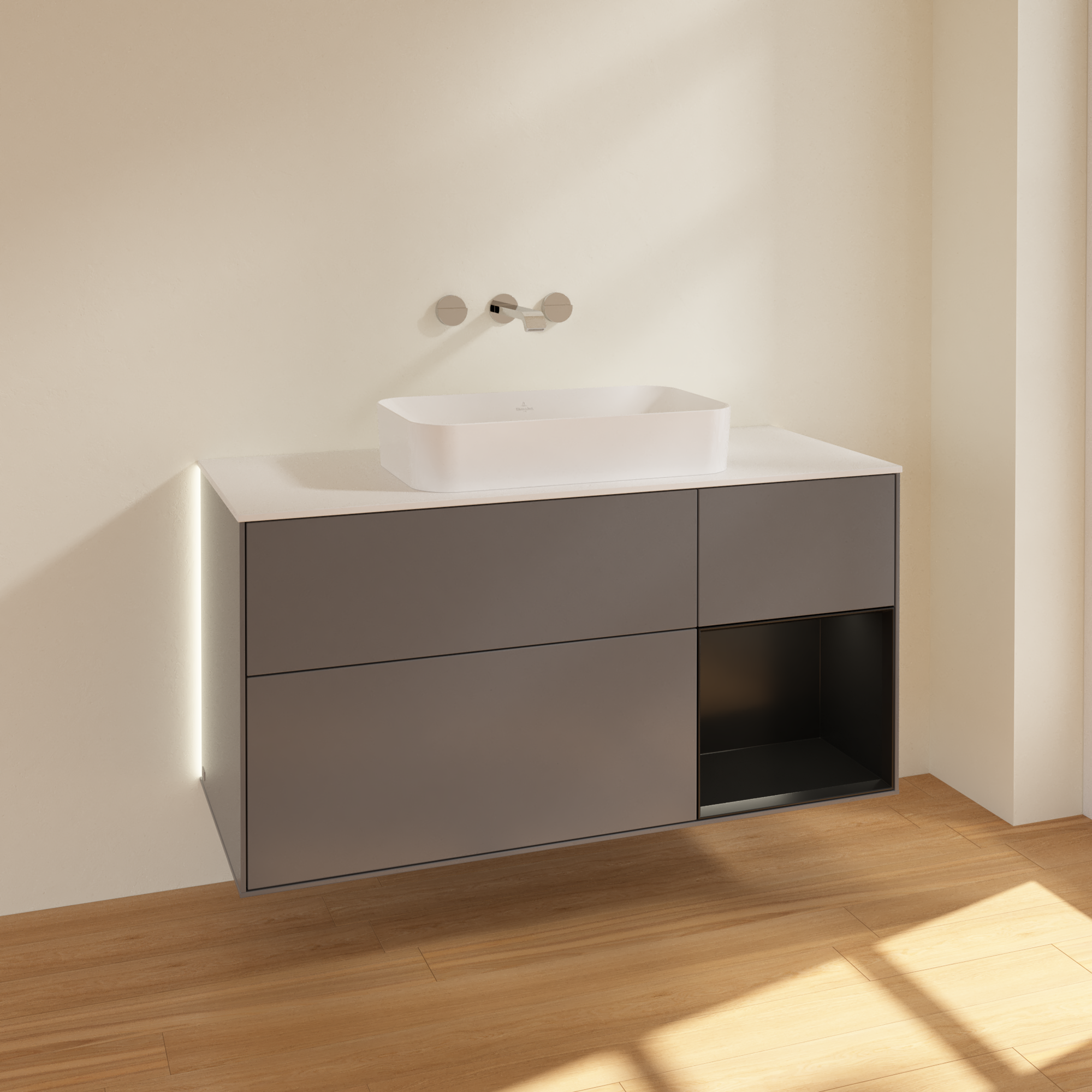 Finion Waschbeckenunterschrank, mit Beleuchtung, 3 Auszüge, 1200x603x501mm, Korpus: Anthracite Matt Lacquer, Front: Anthracite Matt Lacquer, Regalelement: Black Matt Lacquer, Abdeckplatte: Glass White Matt