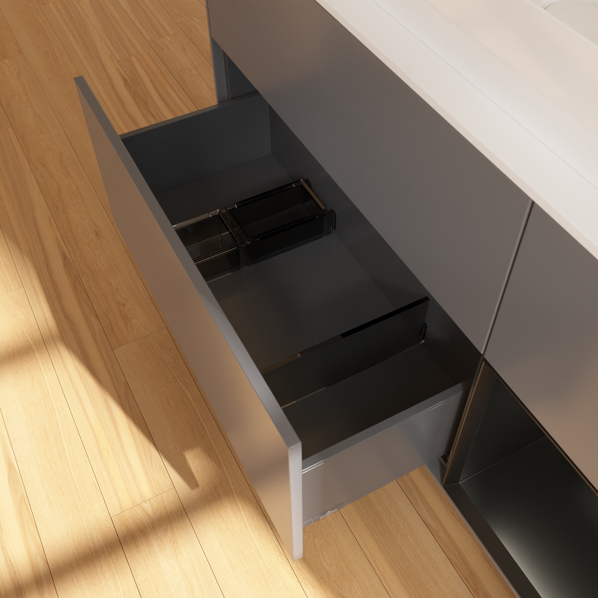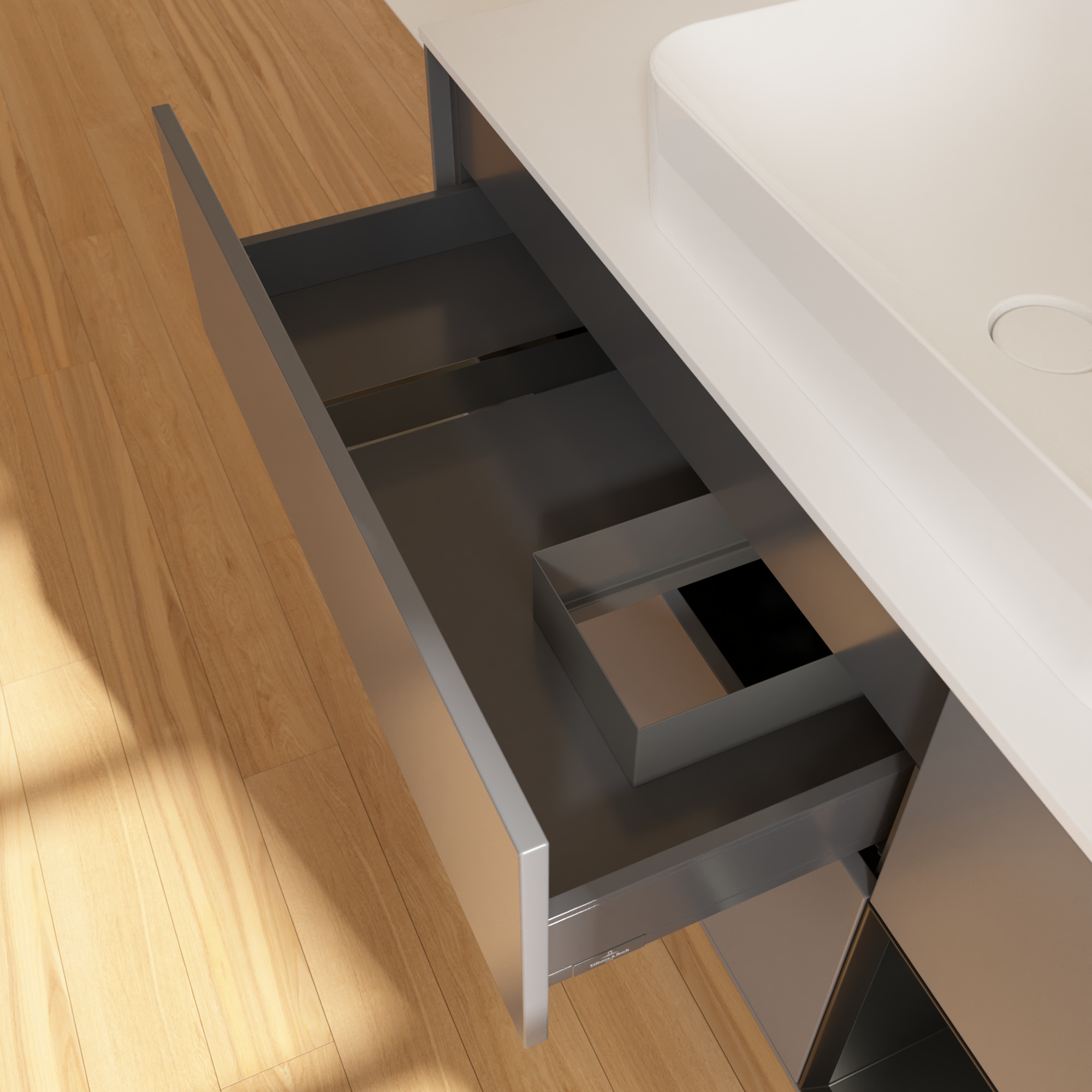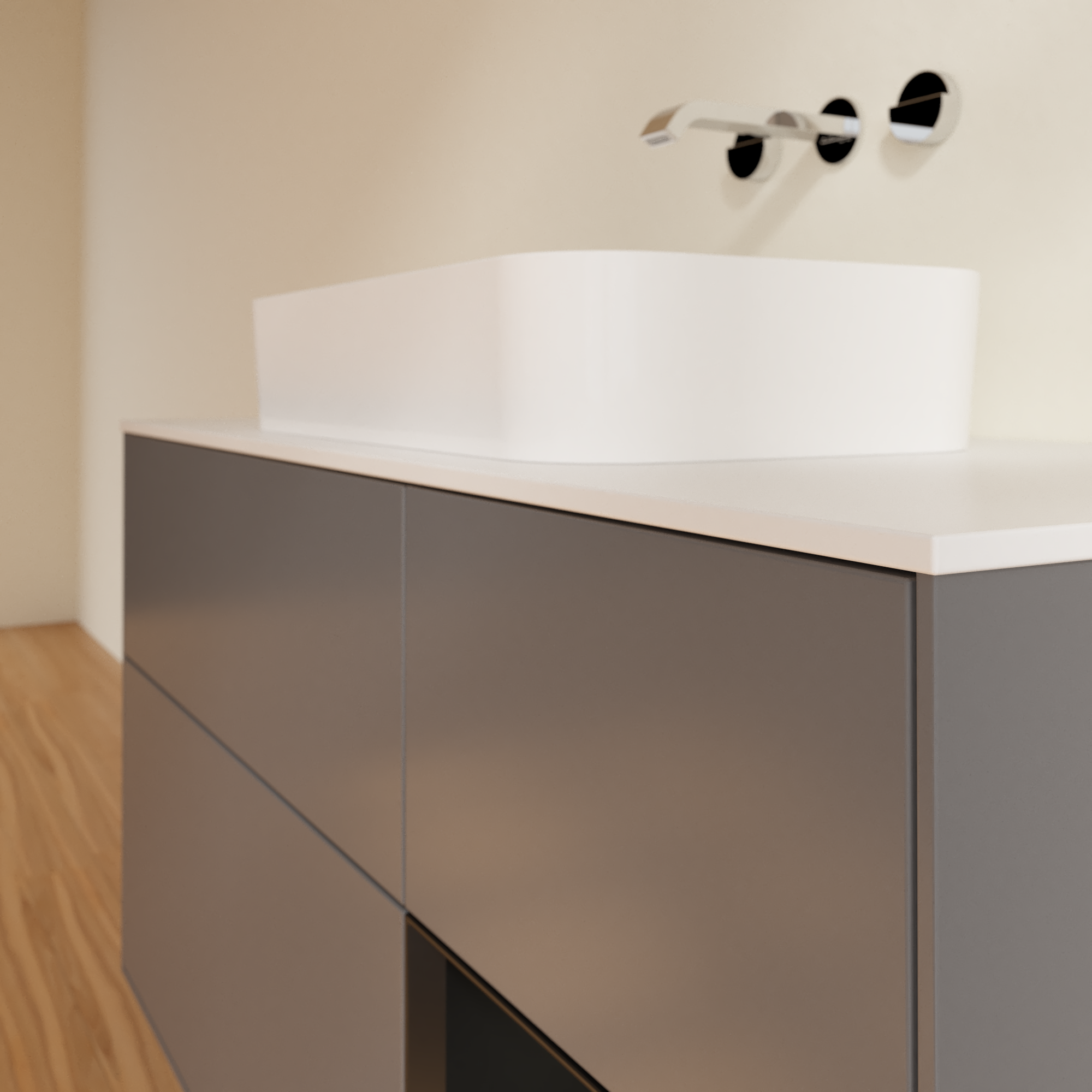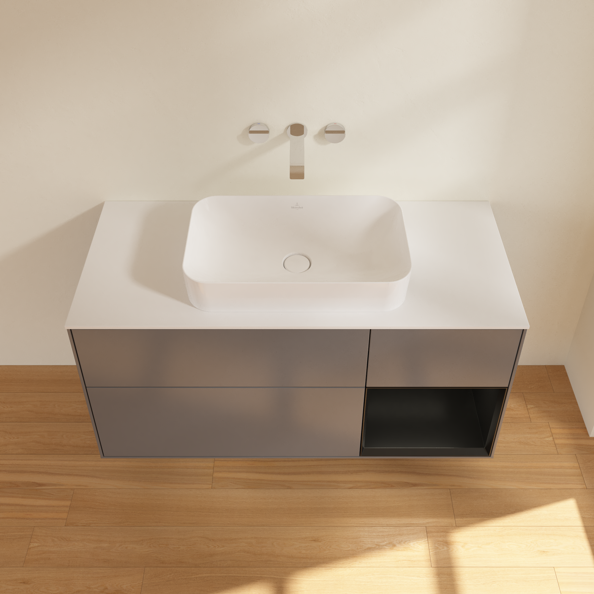 Finion Waschbeckenunterschrank, mit Beleuchtung, 3 Auszüge, 1200x603x501mm, Korpus: Anthracite Matt Lacquer, Front: Anthracite Matt Lacquer, Regalelement: Black Matt Lacquer, Abdeckplatte: Glass White Matt