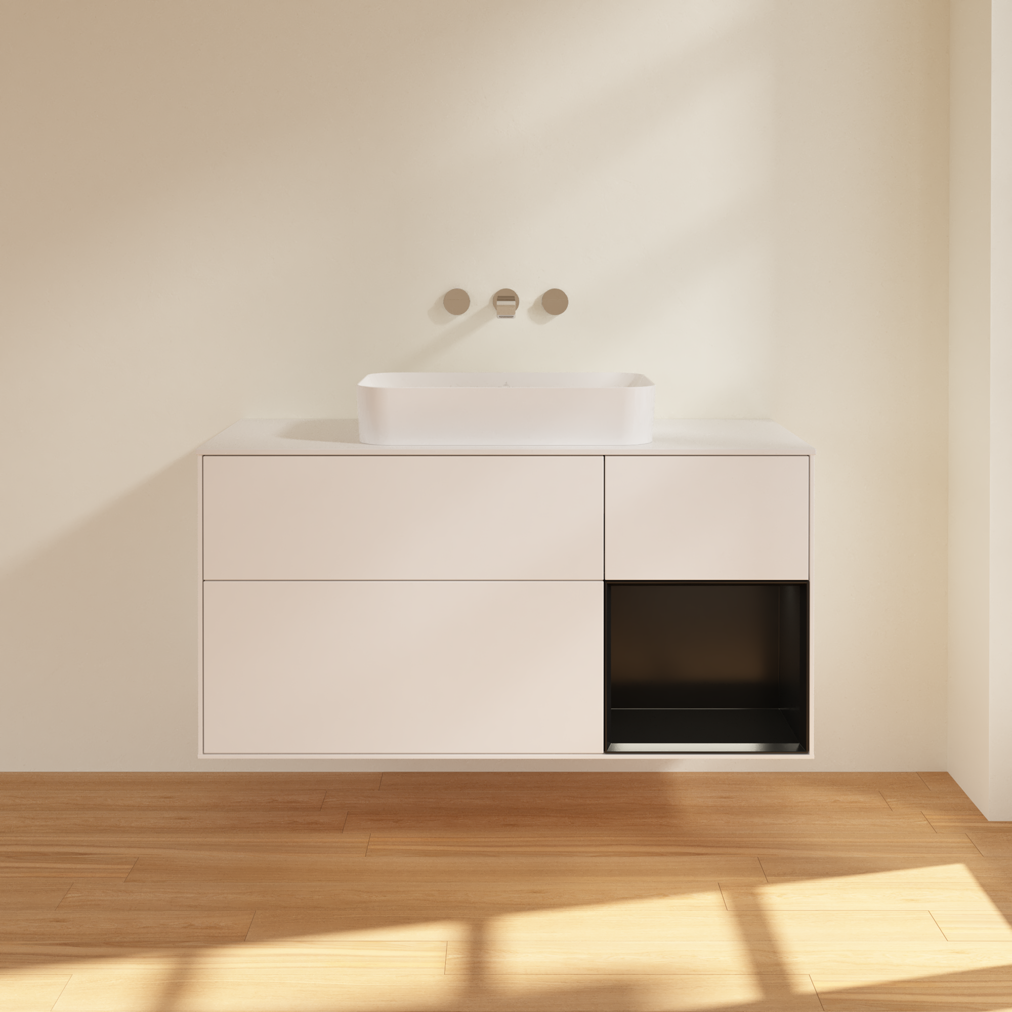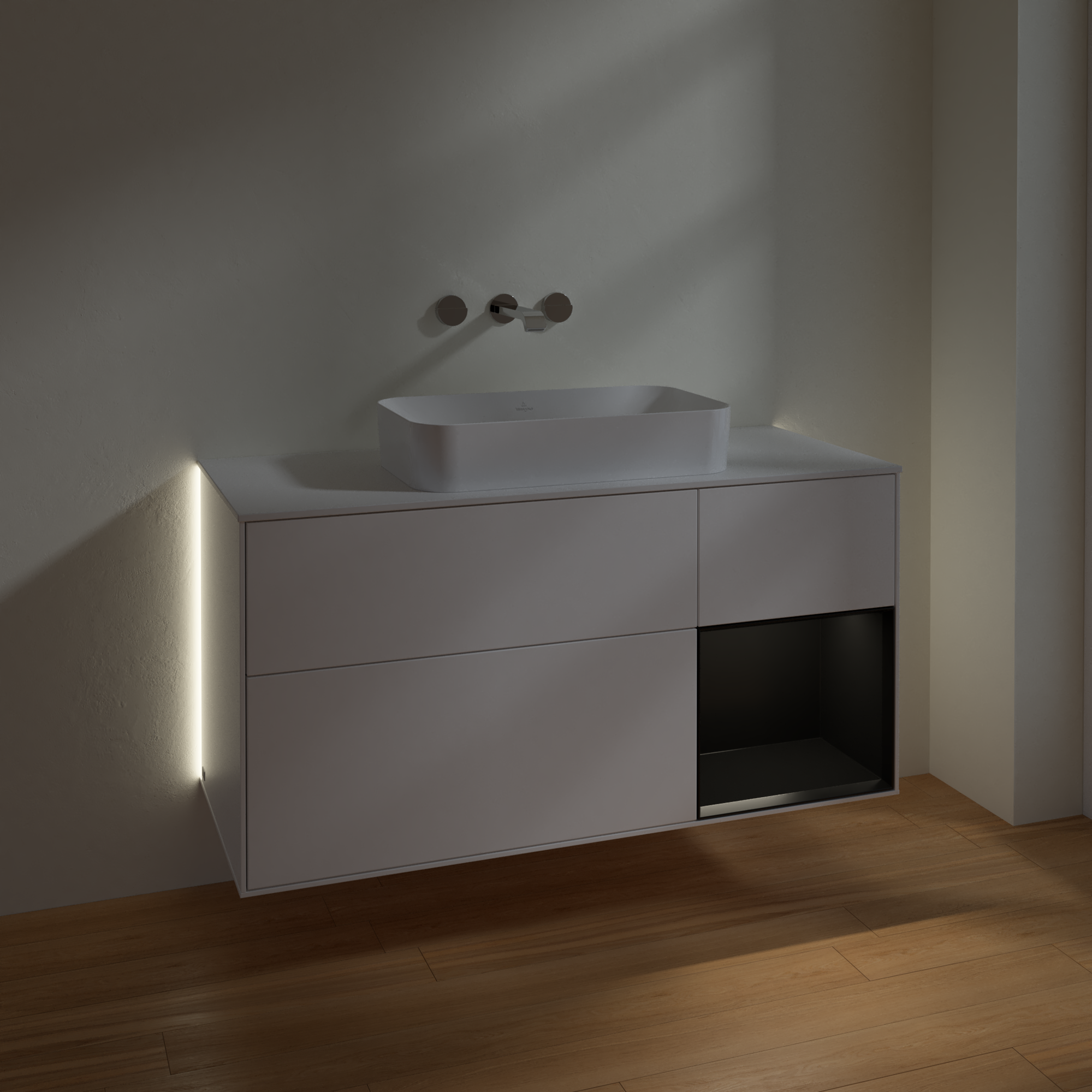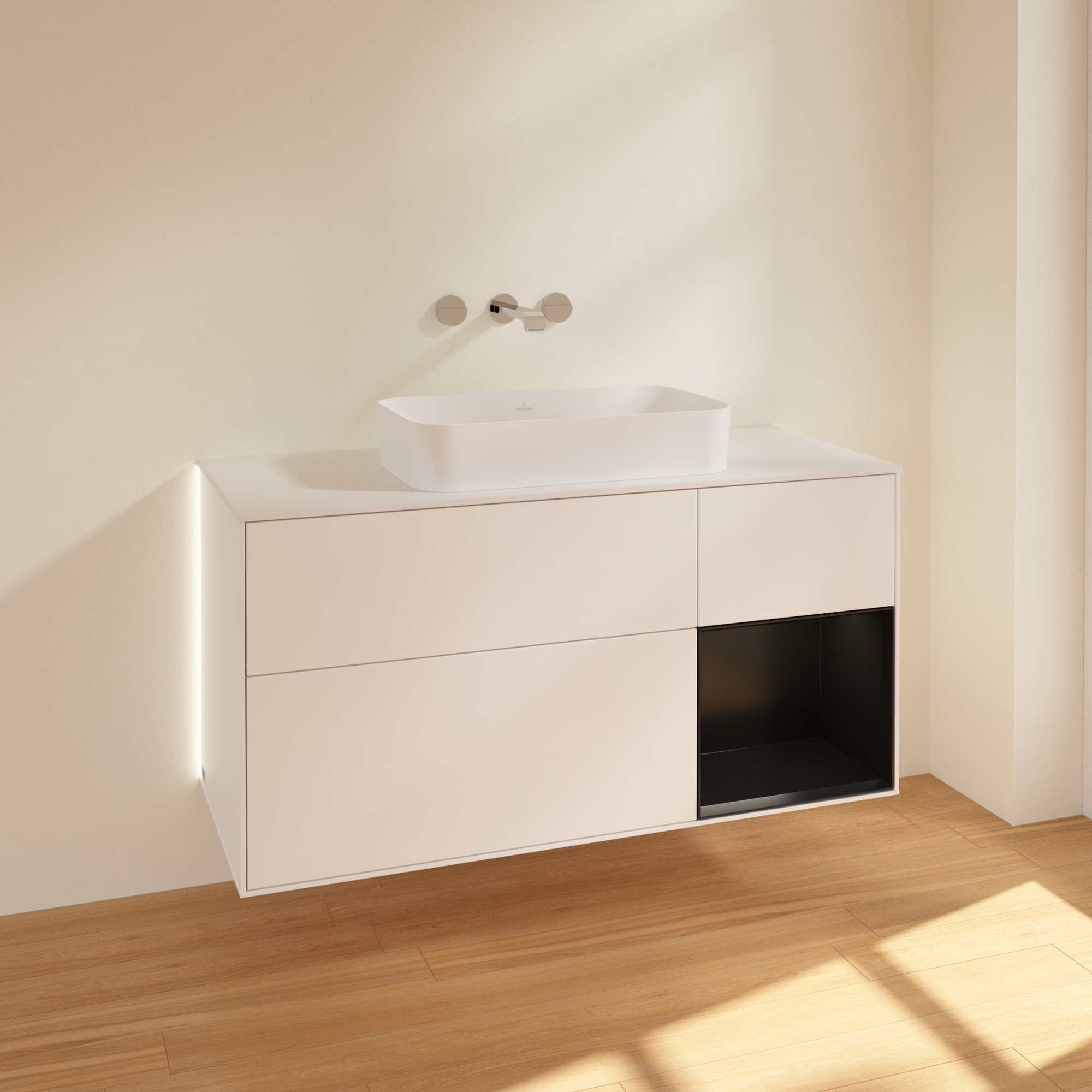 Finion Waschbeckenunterschrank, mit Beleuchtung, 3 Auszüge, 1200x603x501mm, Korpus: White Matt Lacquer, Front: White Matt Lacquer, Regalelement: Black Matt Lacquer, Abdeckplatte: Glass White Matt