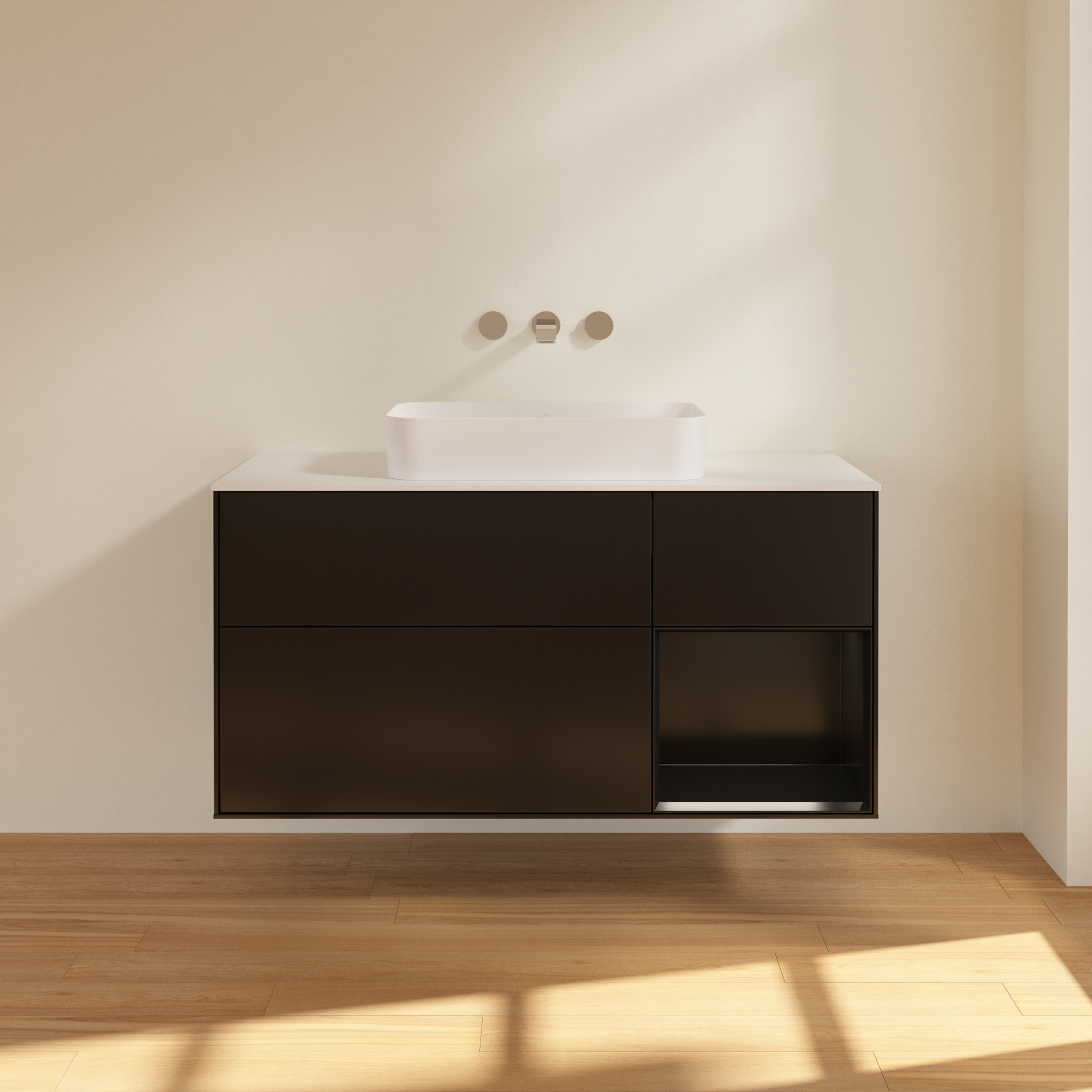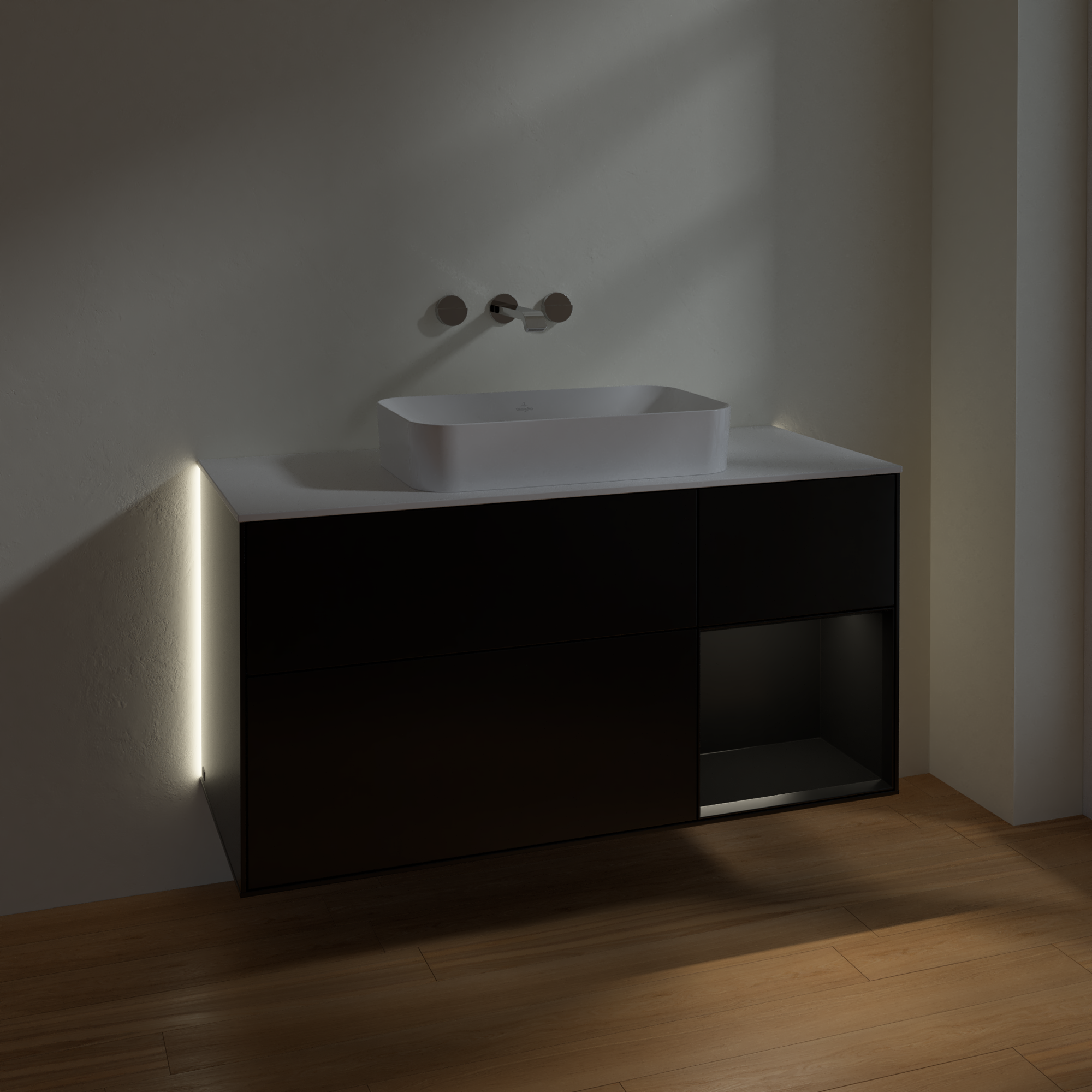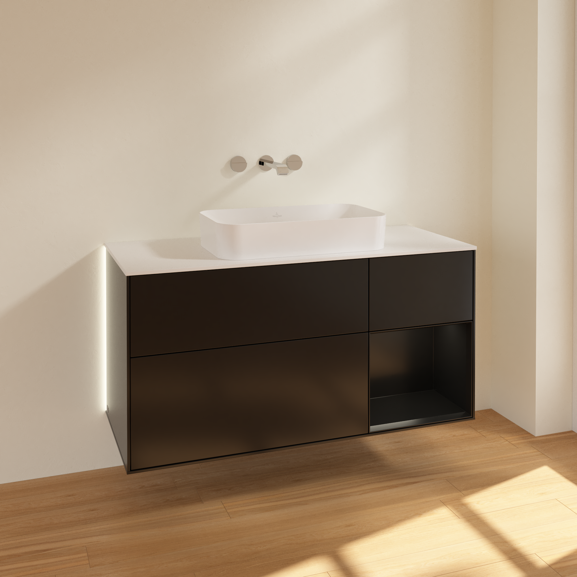 Finion Waschbeckenunterschrank, mit Beleuchtung, 3 Auszüge, 1200x603x501mm, Korpus: Black Matt Lacquer, Front: Black Matt Lacquer, Regalelement: Black Matt Lacquer, Abdeckplatte: Glass White Matt