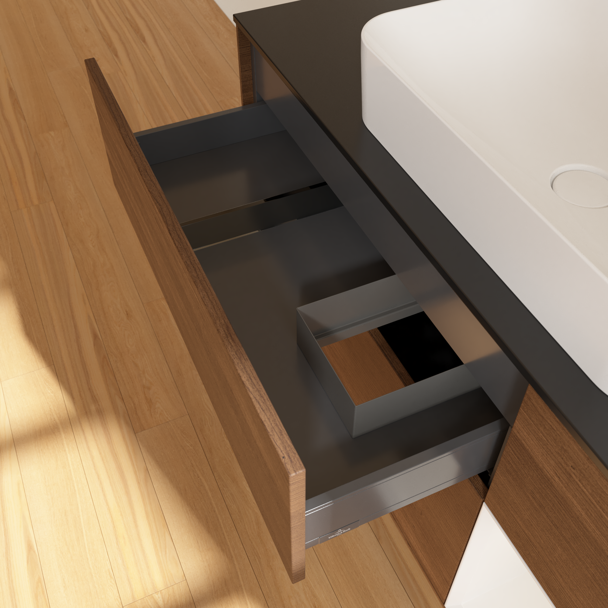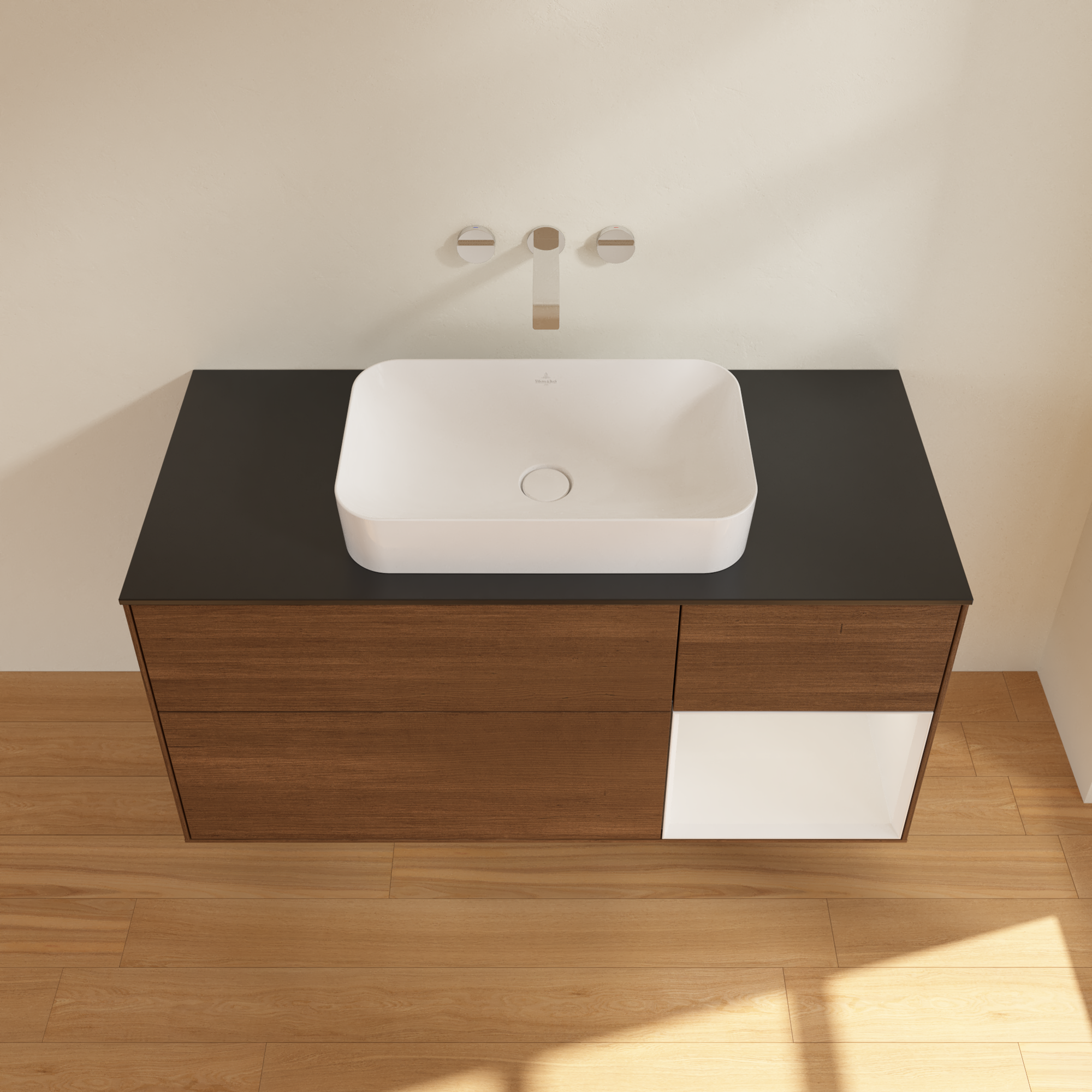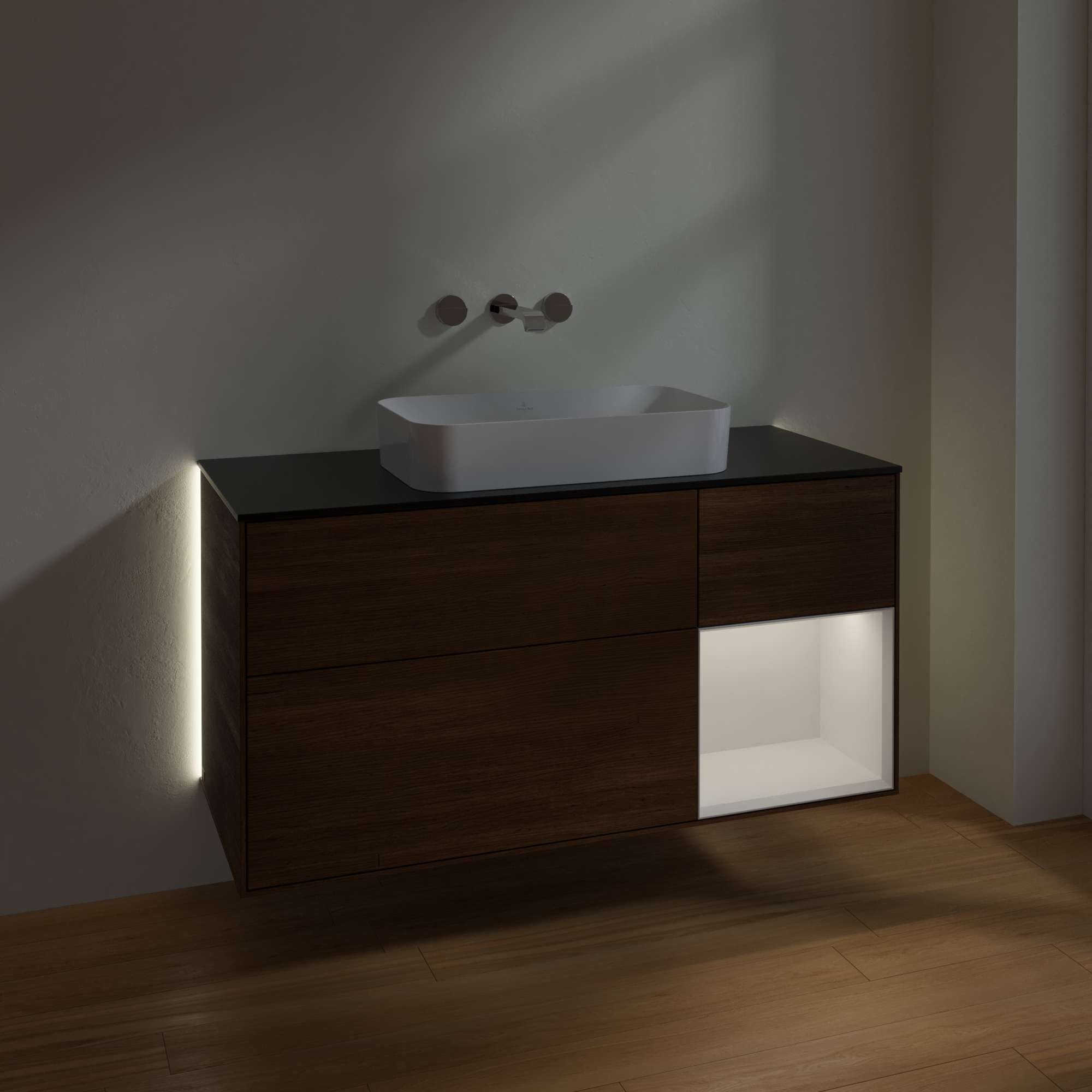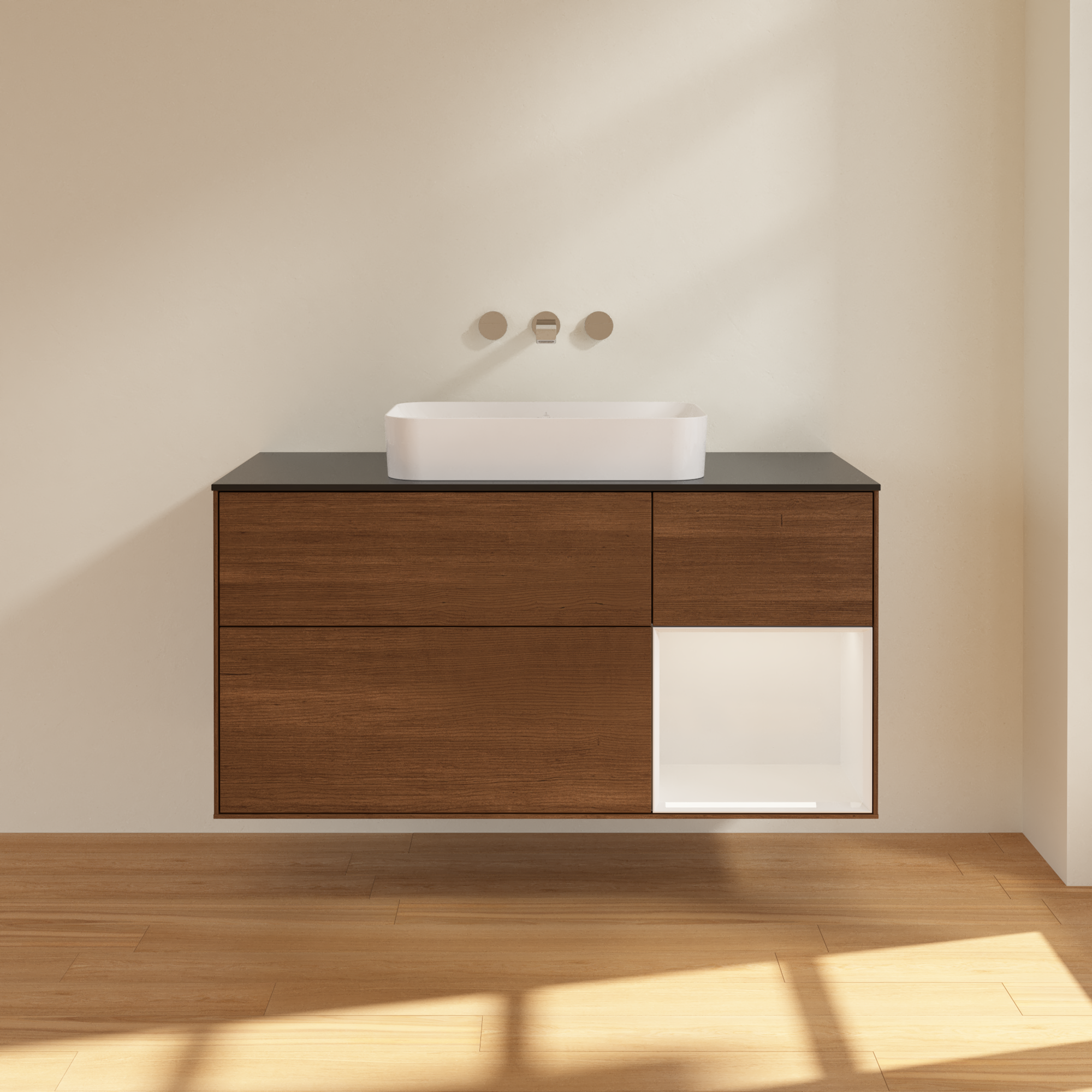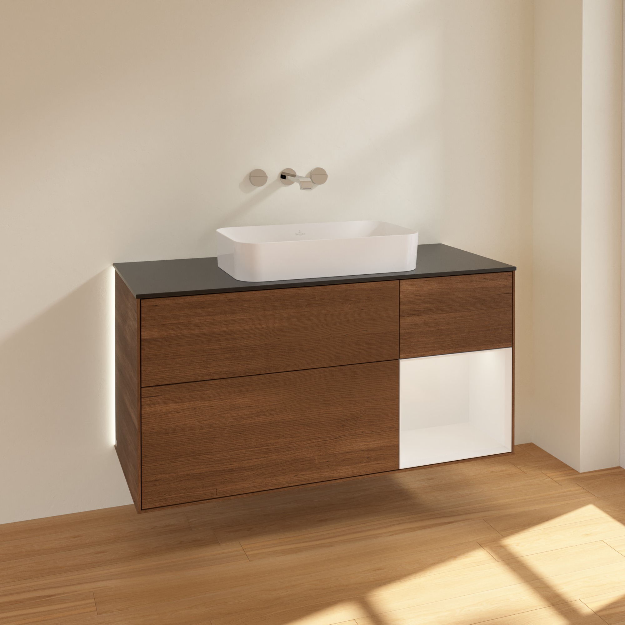 Finion Waschbeckenunterschrank, mit Beleuchtung, 3 Auszüge, 1200x603x501mm, Korpus: Walnut Veneer, Front: Walnut Veneer, Regalelement: Glossy White Lacquer, Abdeckplatte: Glass Black Matt