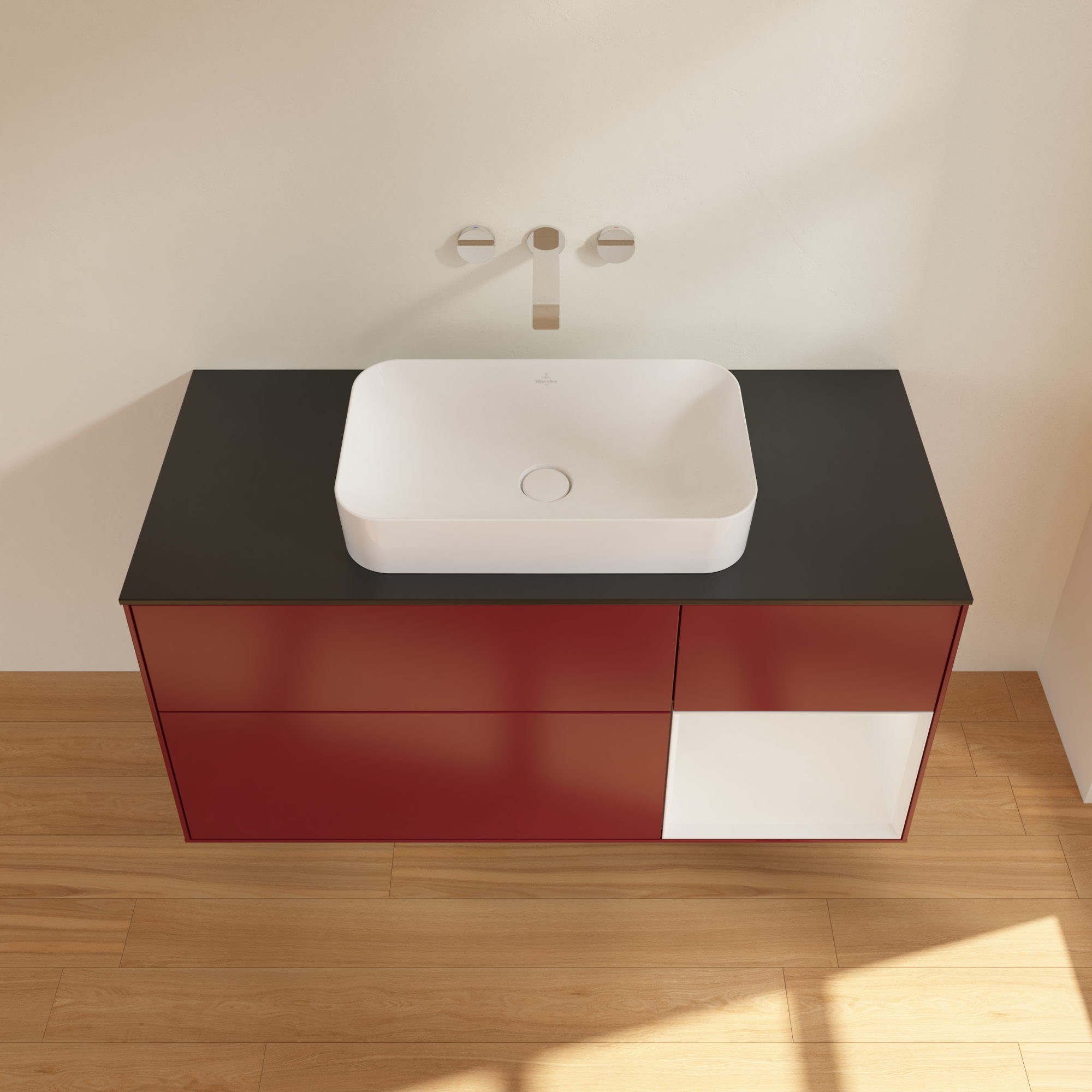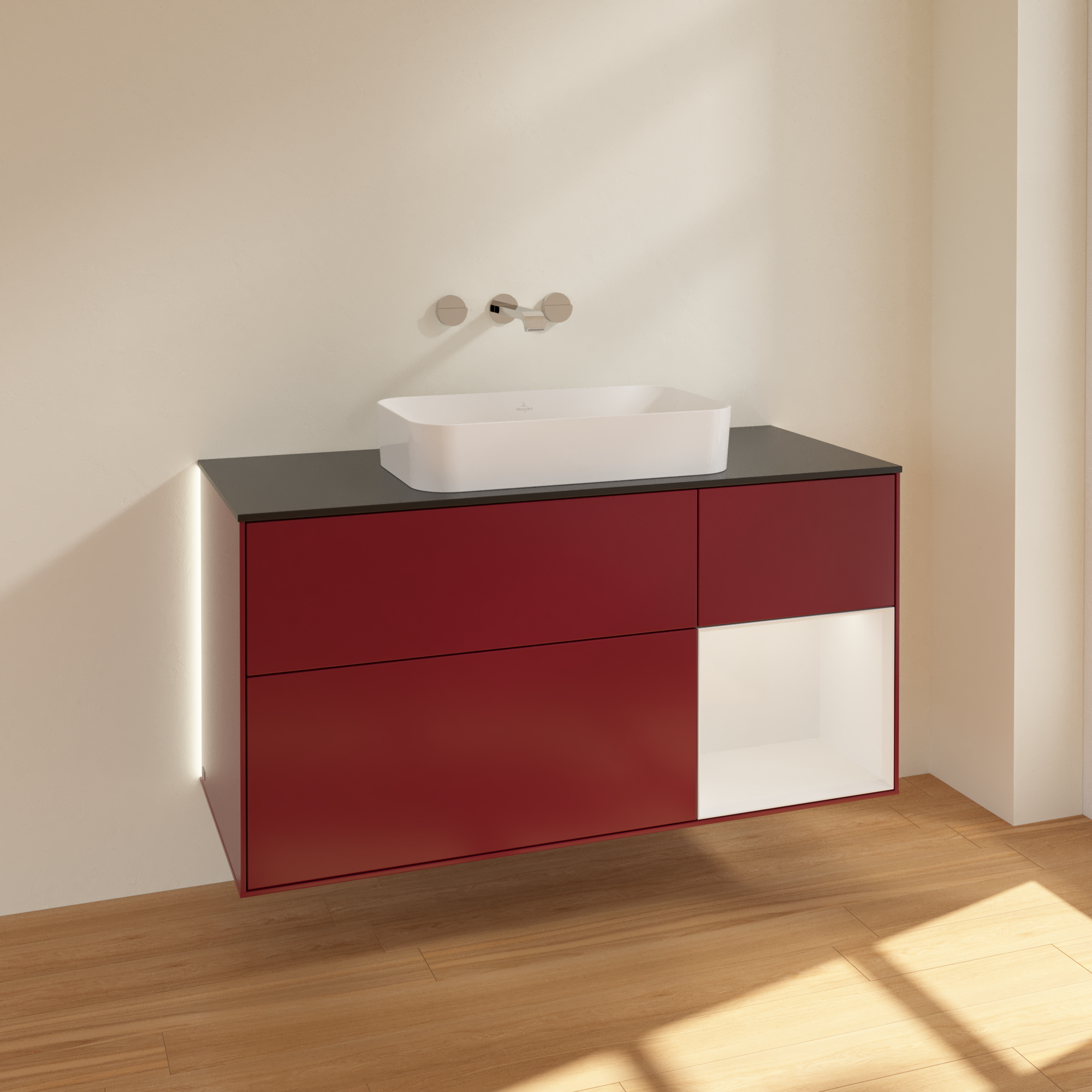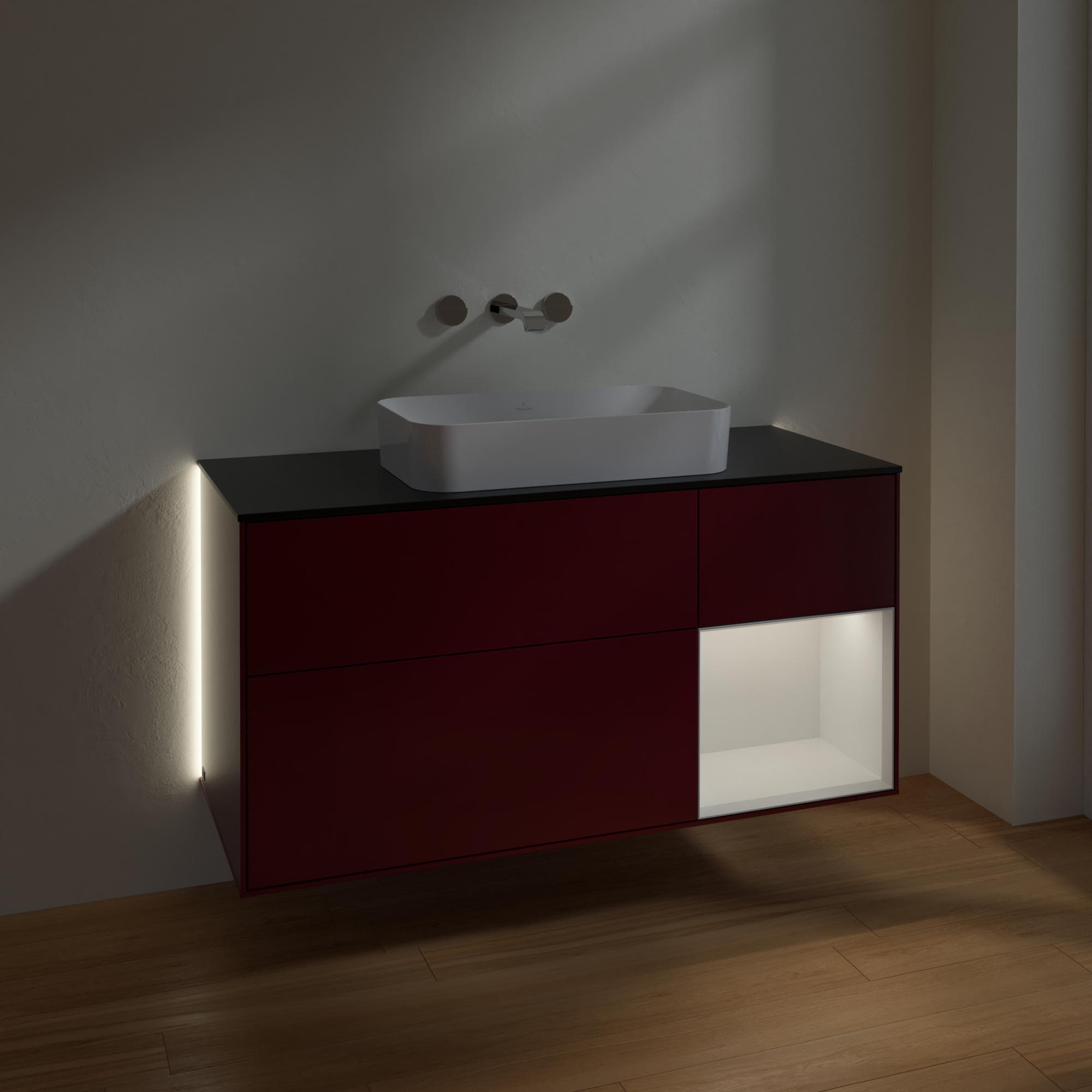 Finion Waschbeckenunterschrank, mit Beleuchtung, 3 Auszüge, 1200x603x501mm, Korpus: Peony Matt Lacquer, Front: Peony Matt Lacquer, Regalelement: Glossy White Lacquer, Abdeckplatte: Glass Black Matt