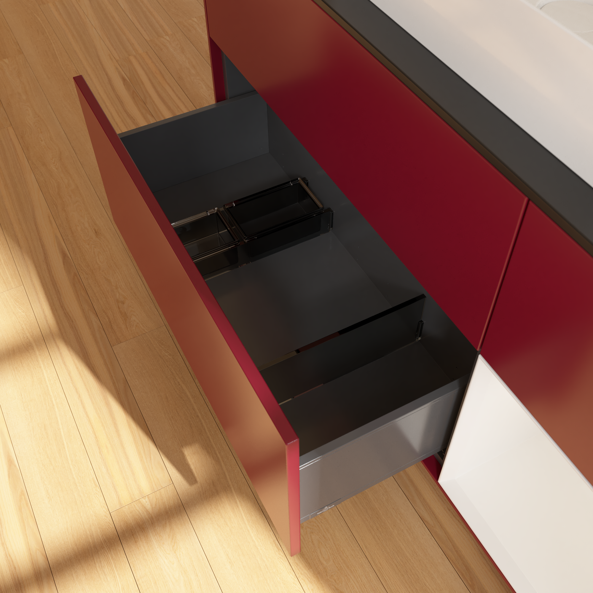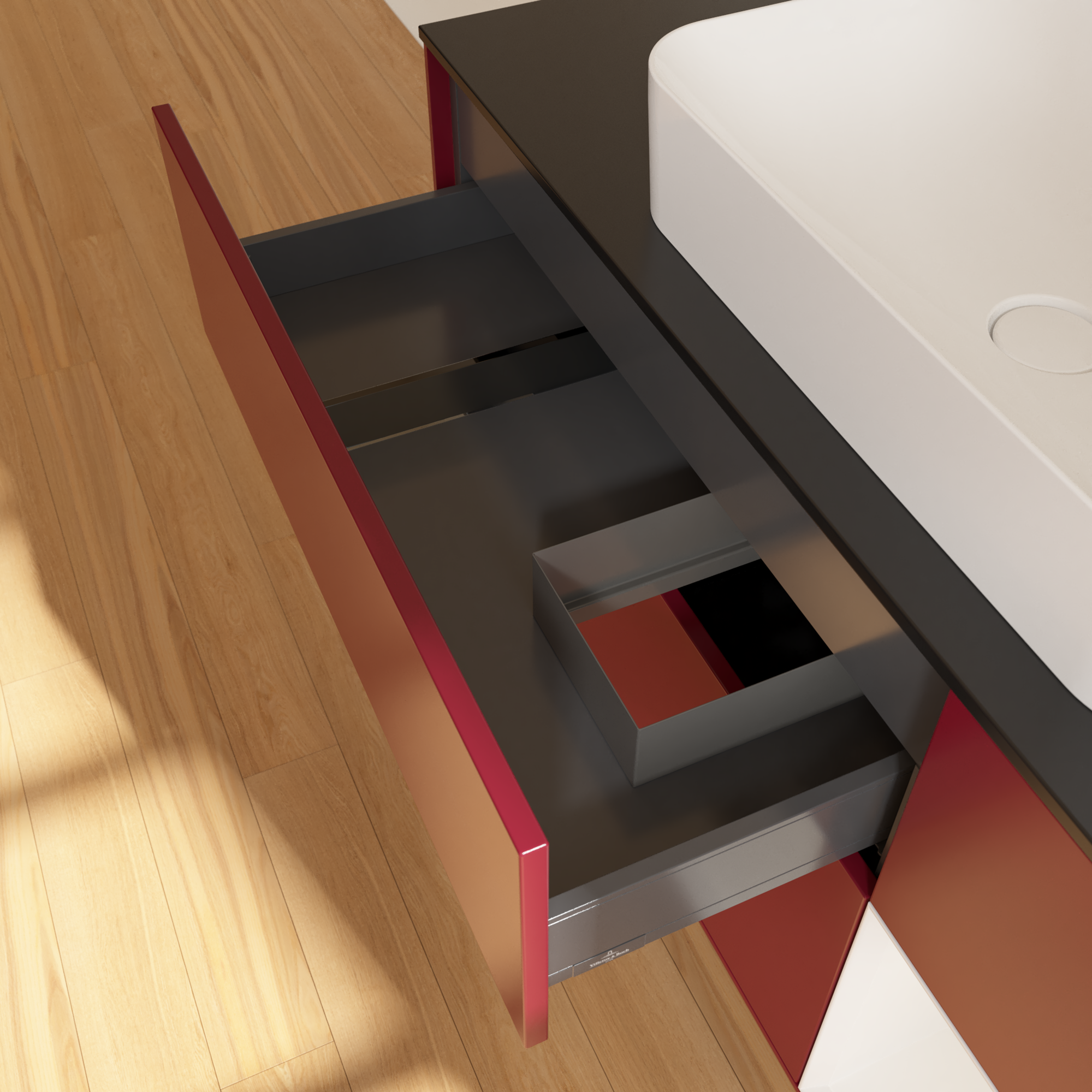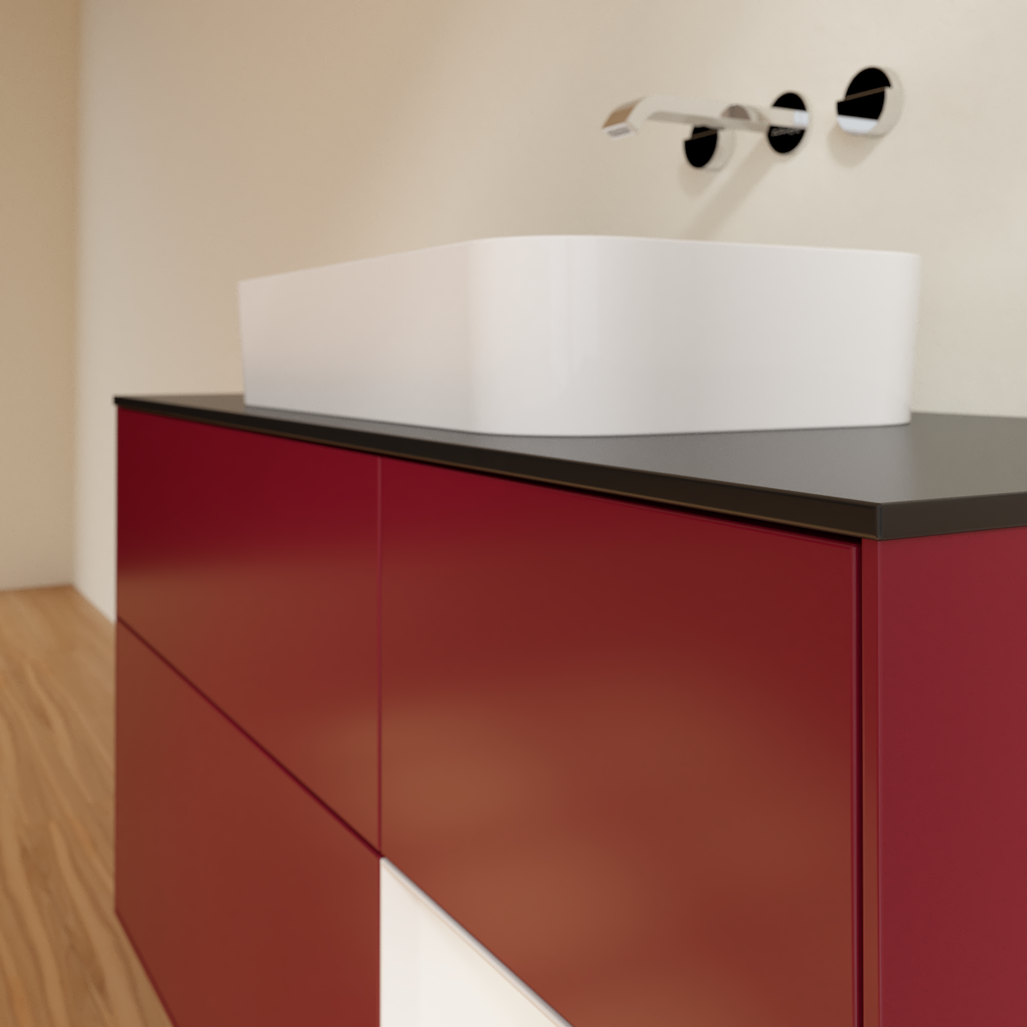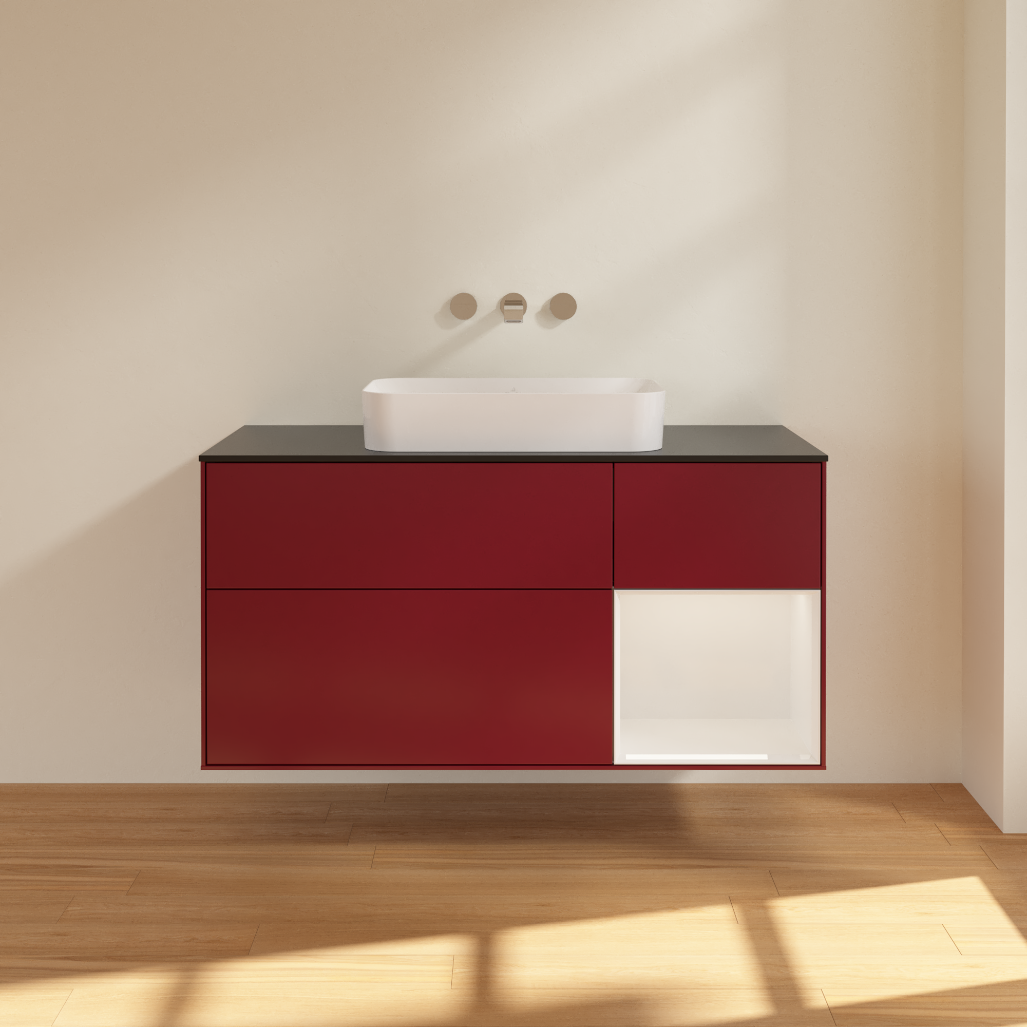 Finion Waschbeckenunterschrank, mit Beleuchtung, 3 Auszüge, 1200x603x501mm, Korpus: Peony Matt Lacquer, Front: Peony Matt Lacquer, Regalelement: Glossy White Lacquer, Abdeckplatte: Glass Black Matt