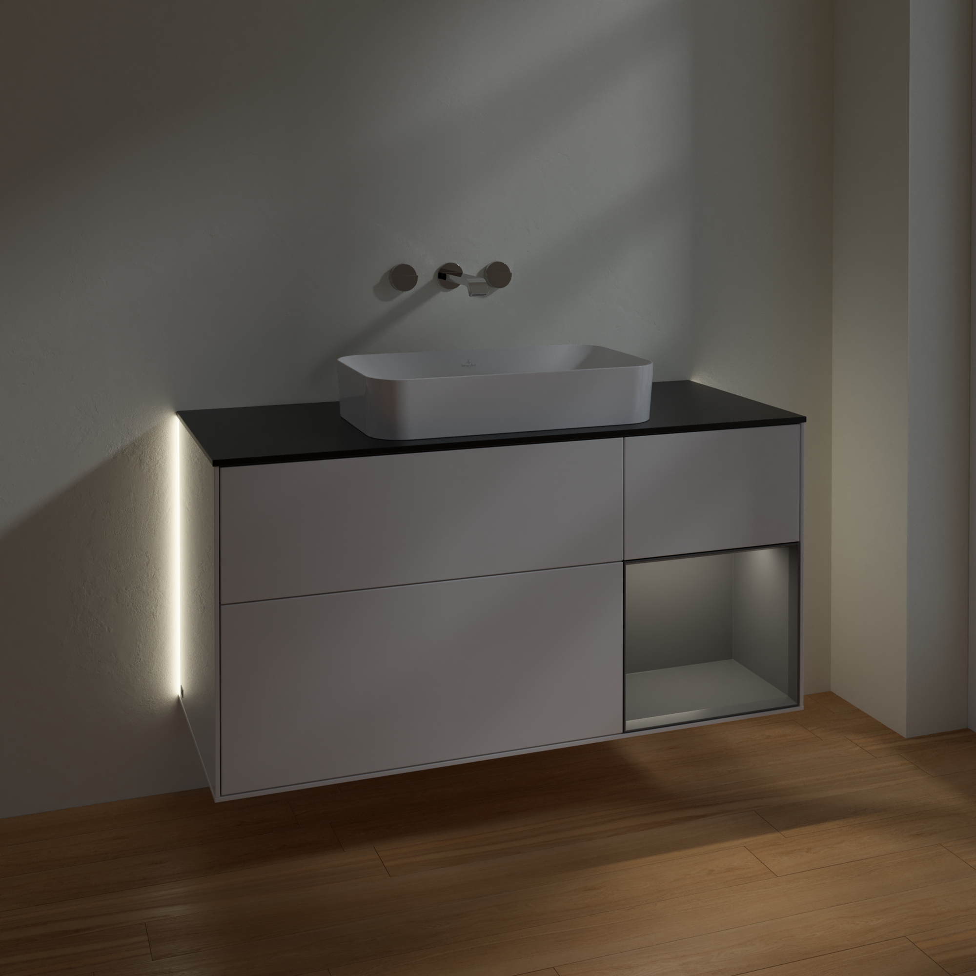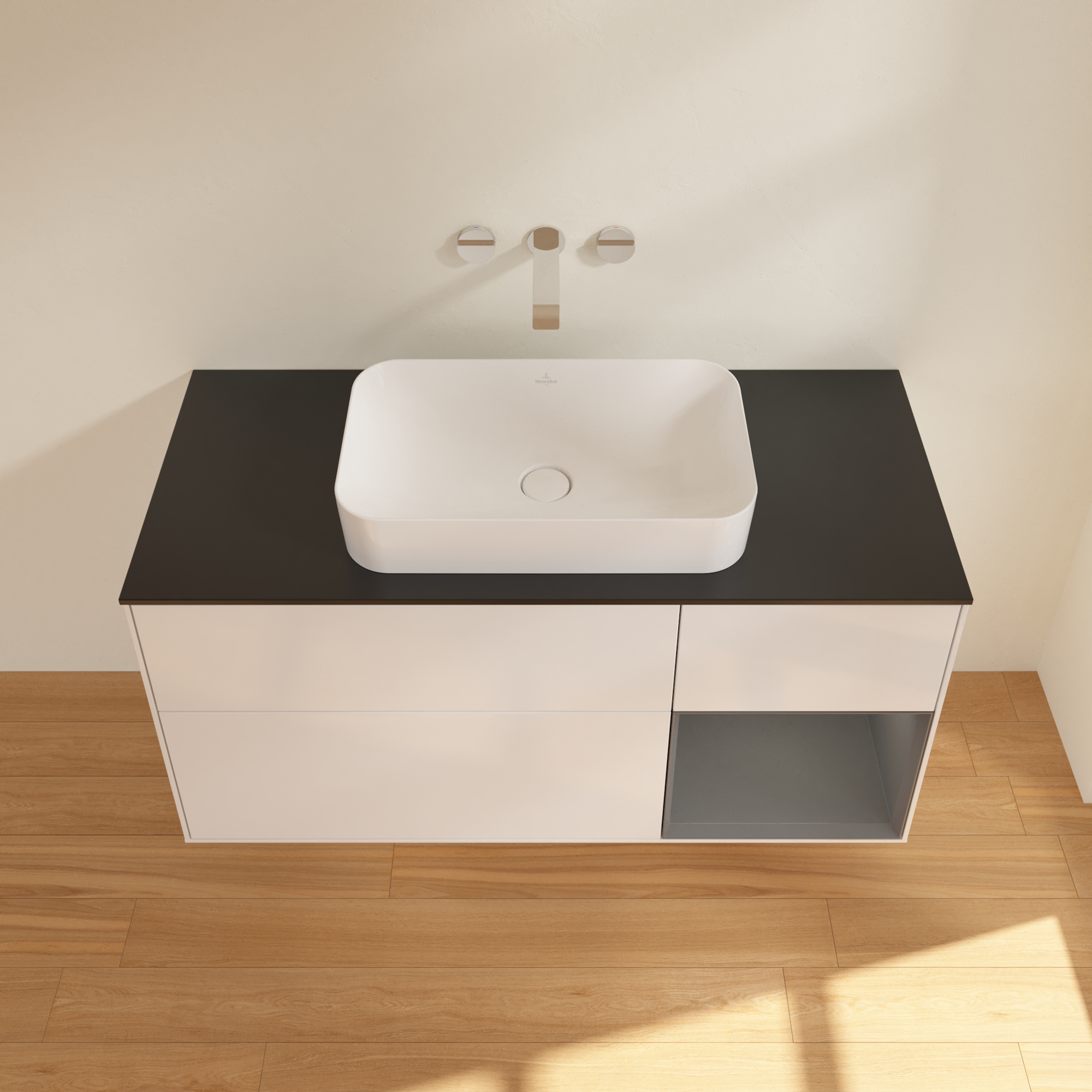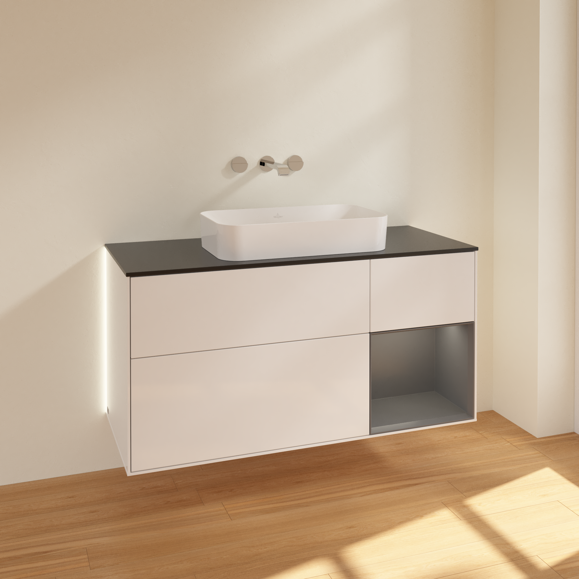 Finion Waschbeckenunterschrank, mit Beleuchtung, 3 Auszüge, 1200x603x501mm, Korpus: Glossy White Lacquer, Front: Glossy White Lacquer, Regalelement: Anthracite Matt Lacquer, Abdeckplatte: Glass Black Matt