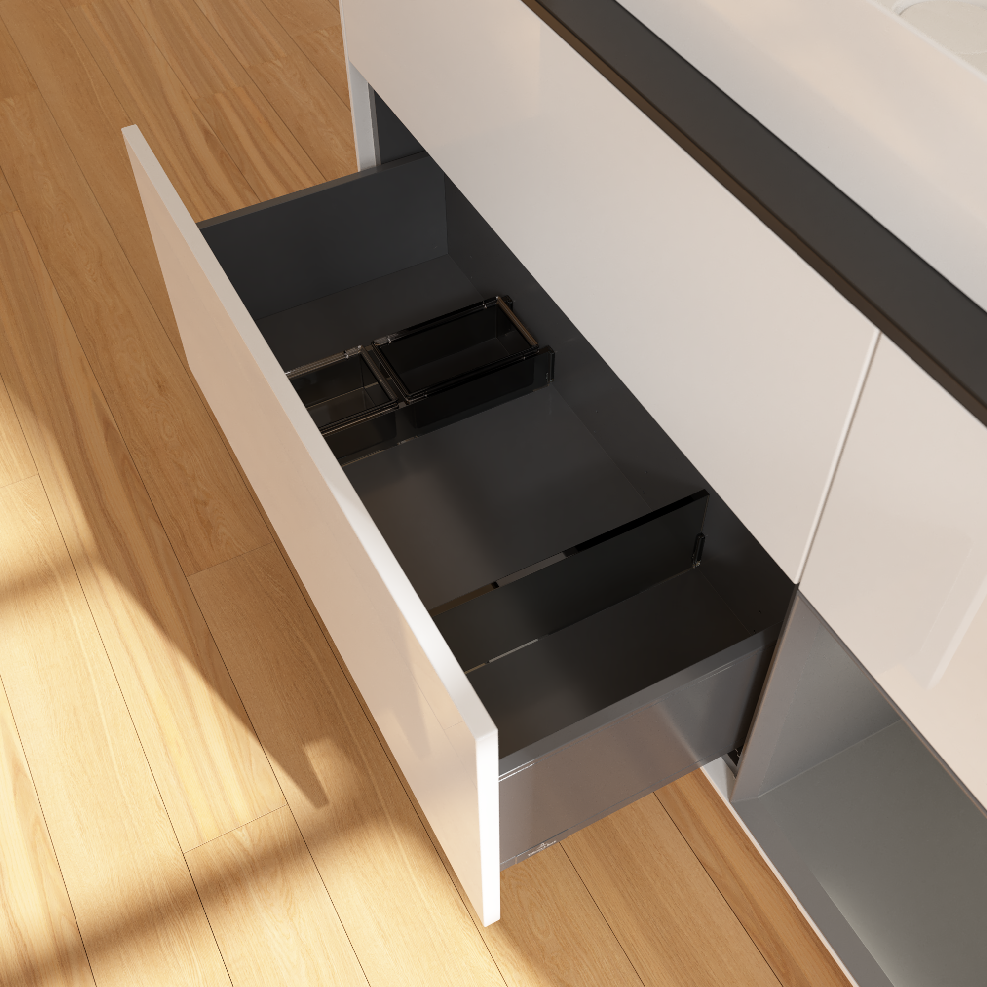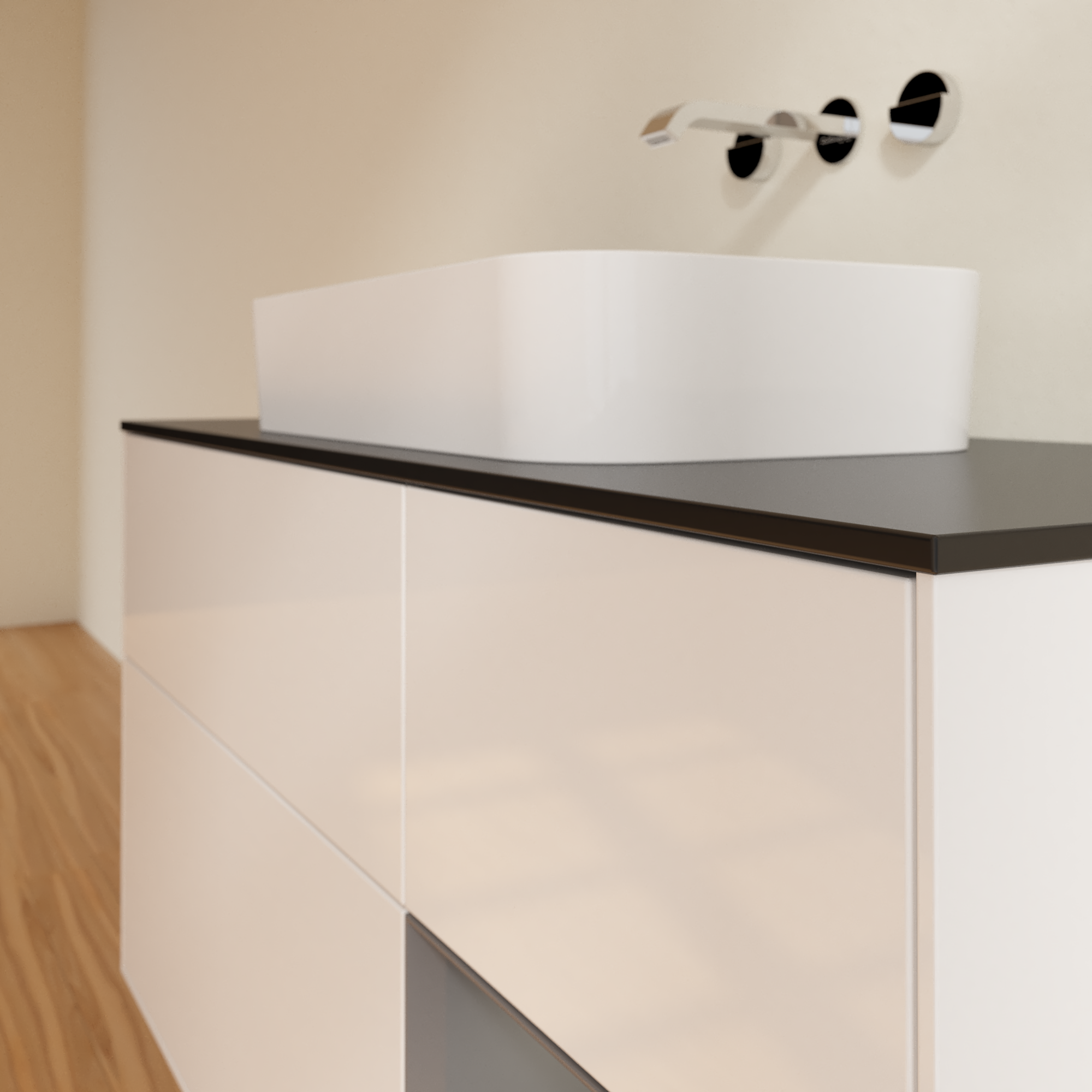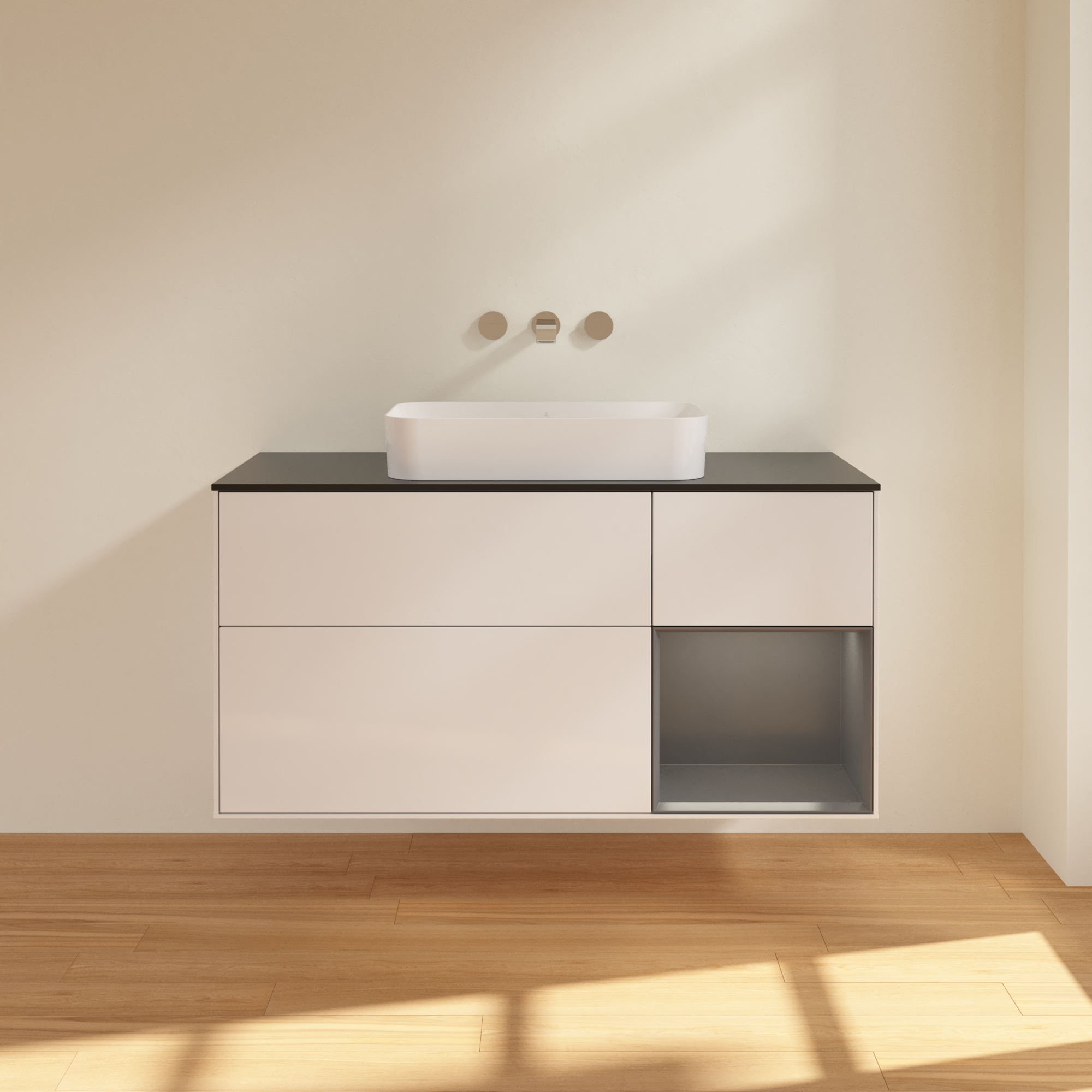 Finion Waschbeckenunterschrank, mit Beleuchtung, 3 Auszüge, 1200x603x501mm, Korpus: Glossy White Lacquer, Front: Glossy White Lacquer, Regalelement: Anthracite Matt Lacquer, Abdeckplatte: Glass Black Matt