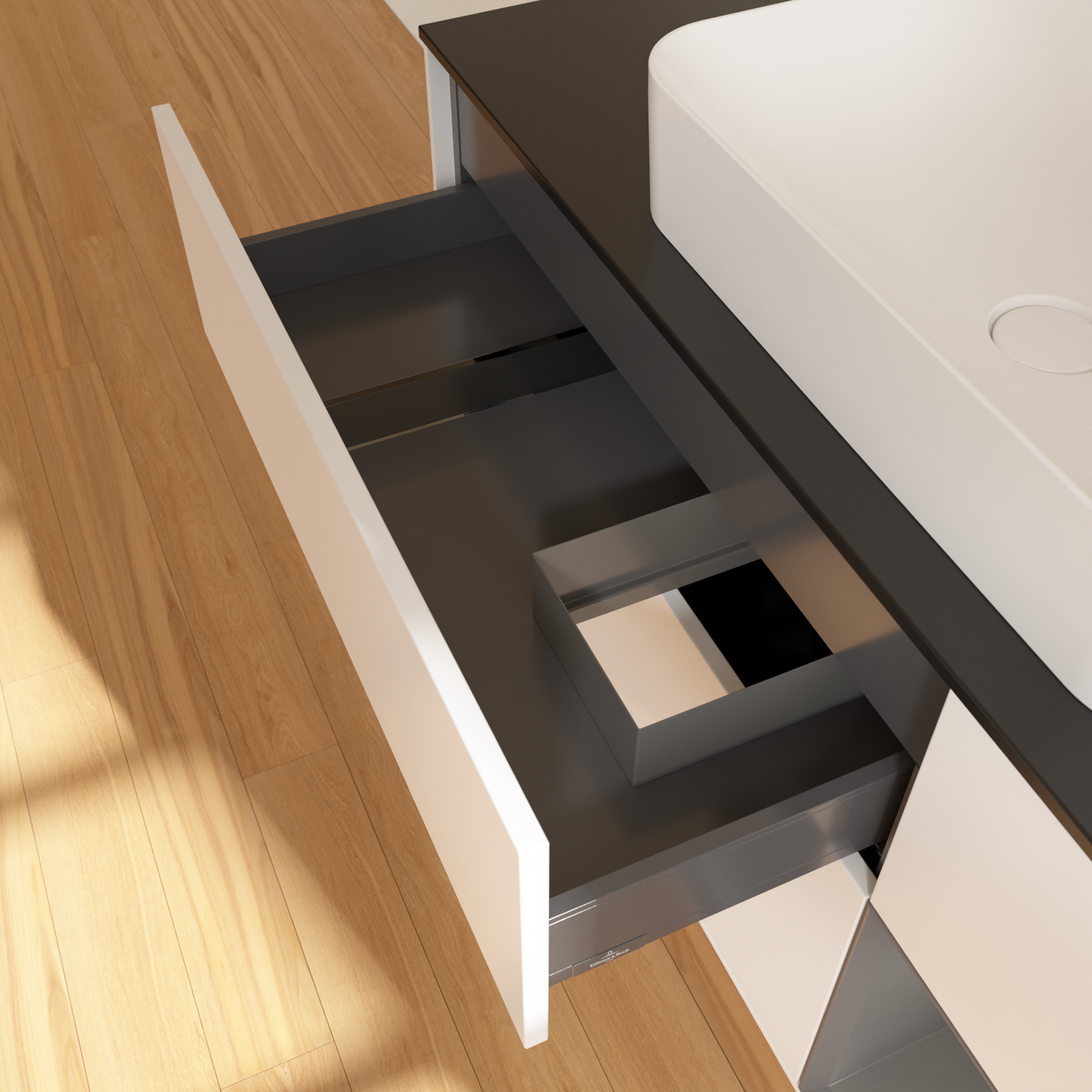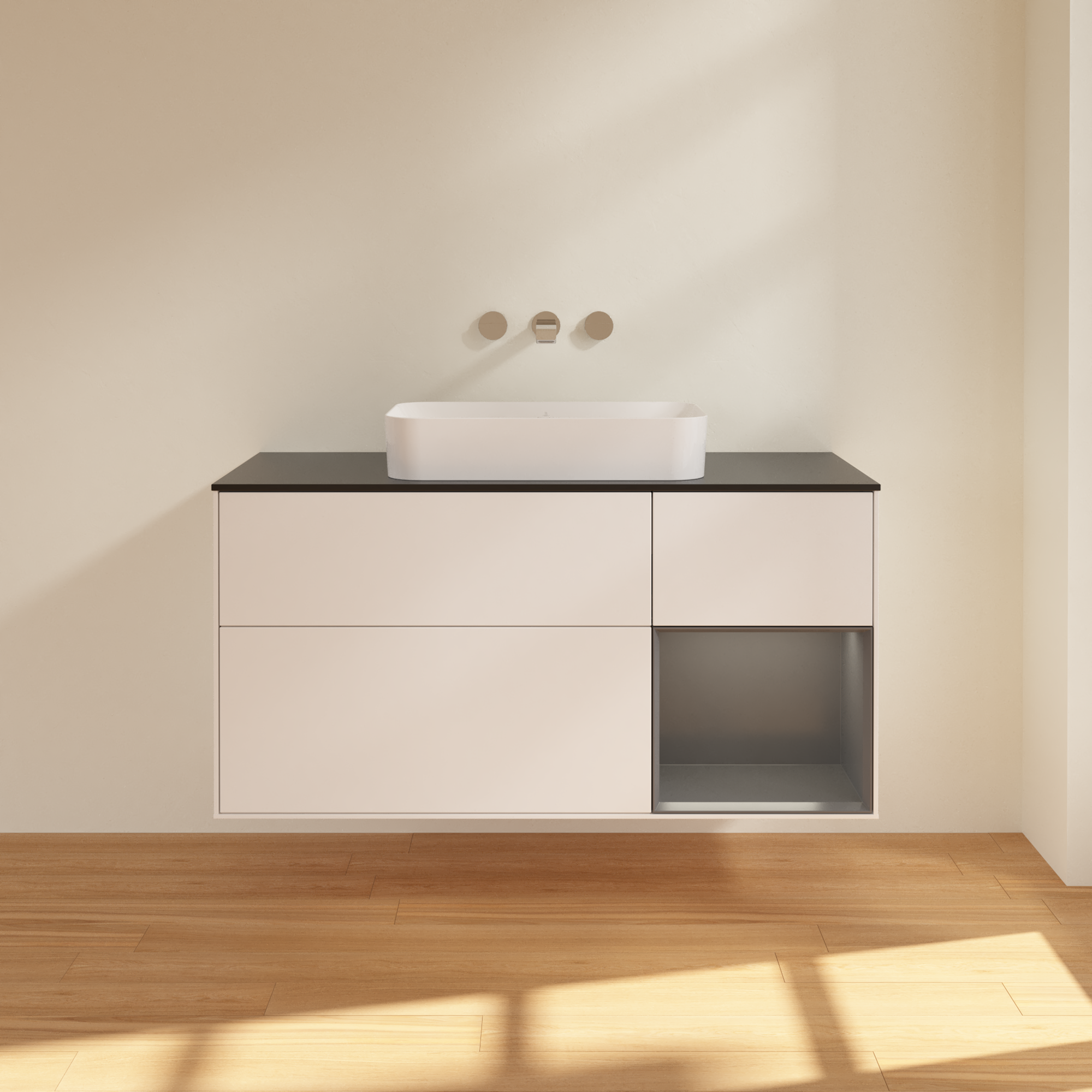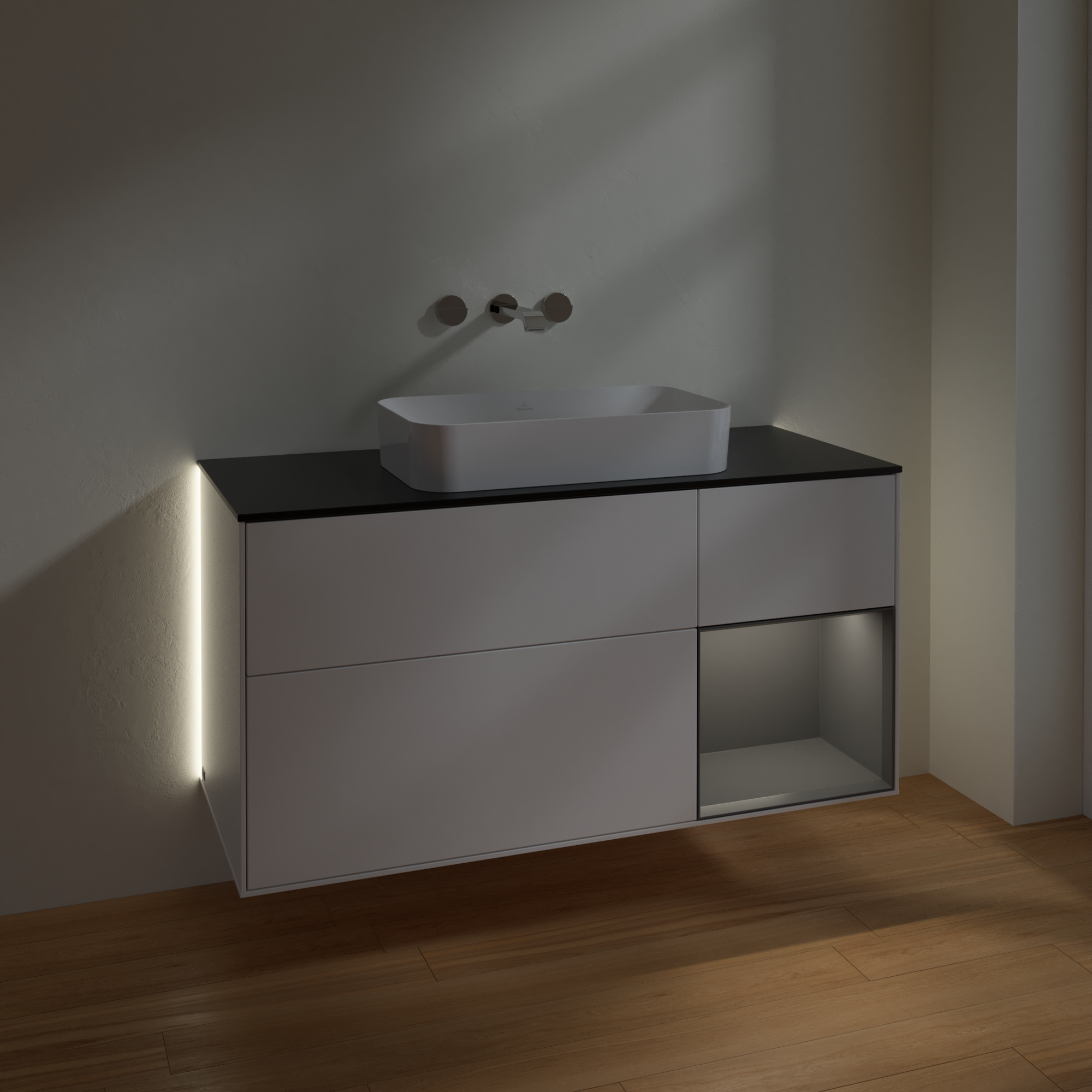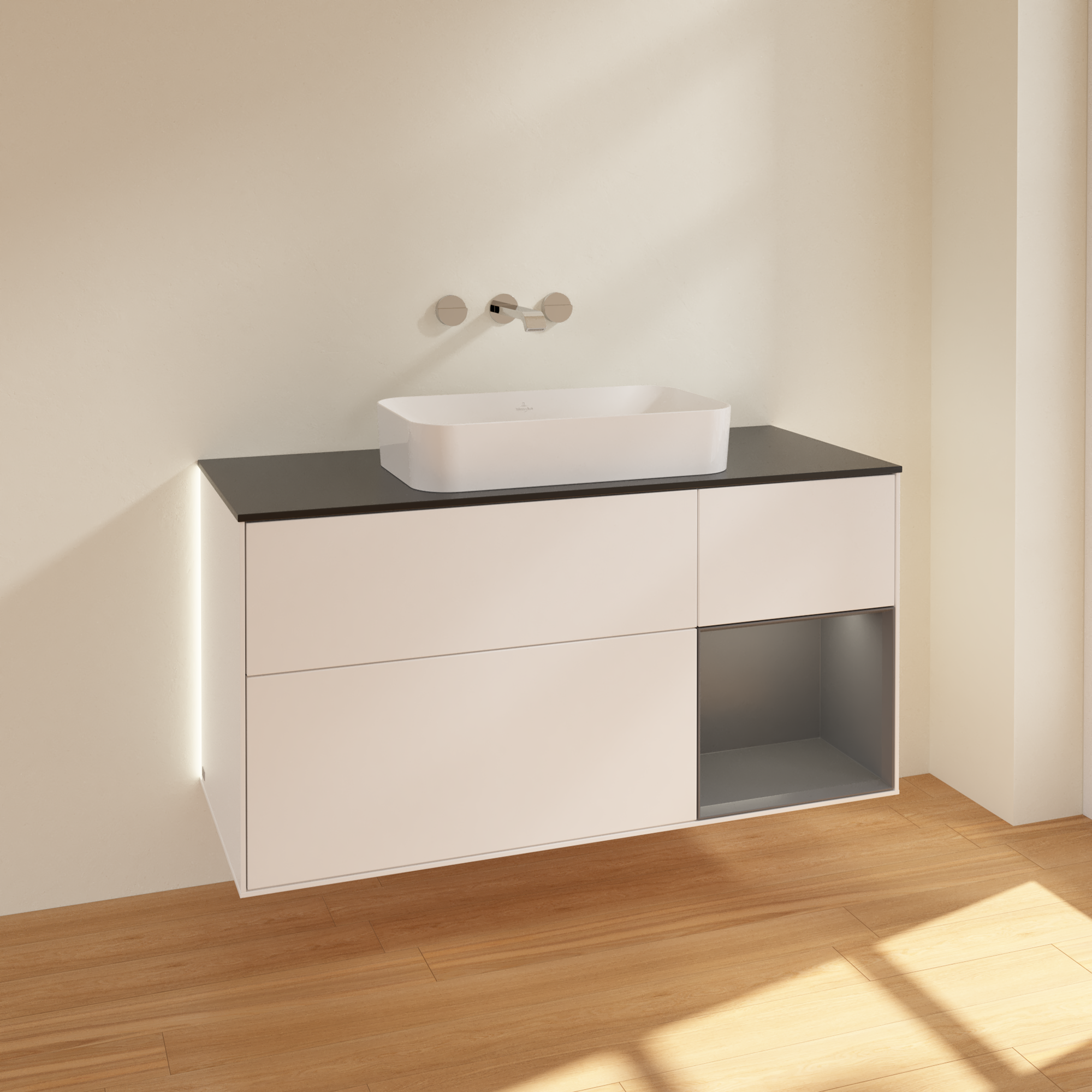 Finion Waschbeckenunterschrank, mit Beleuchtung, 3 Auszüge, 1200x603x501mm, Korpus: White Matt Lacquer, Front: White Matt Lacquer, Regalelement: Anthracite Matt Lacquer, Abdeckplatte: Glass Black Matt