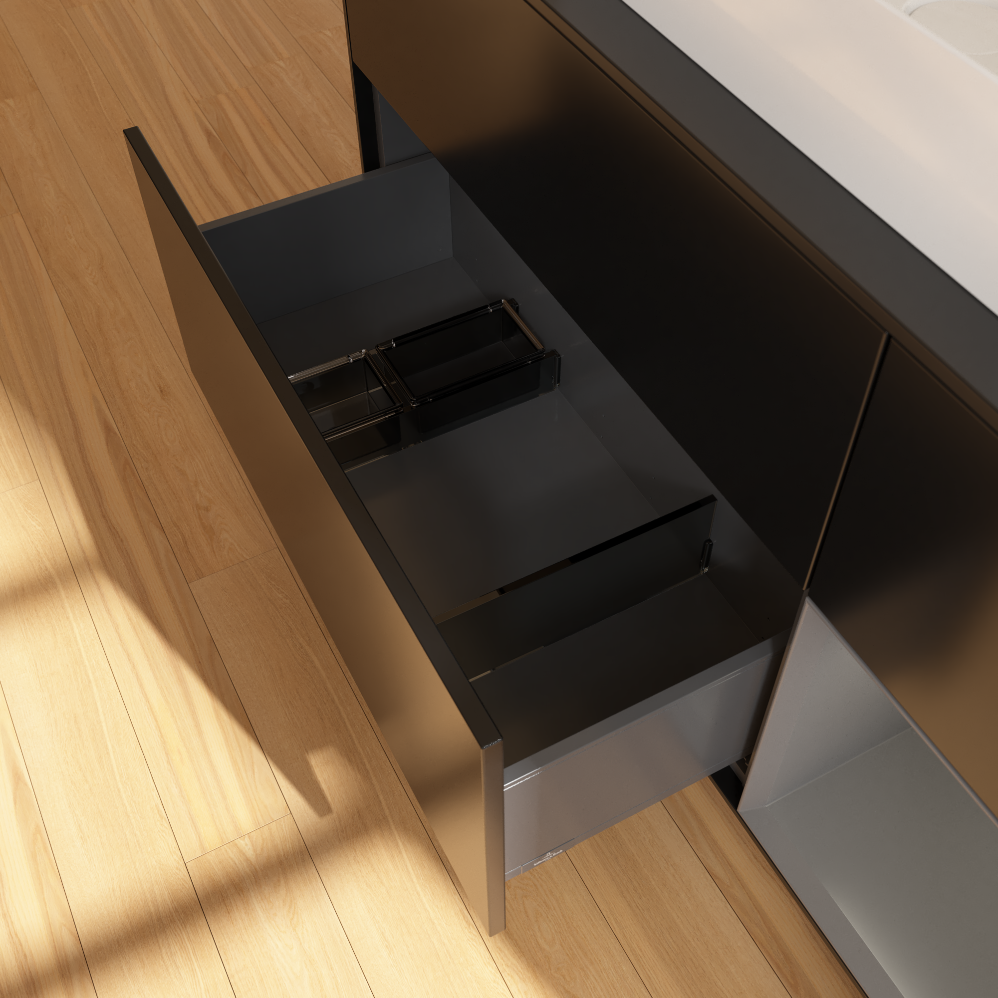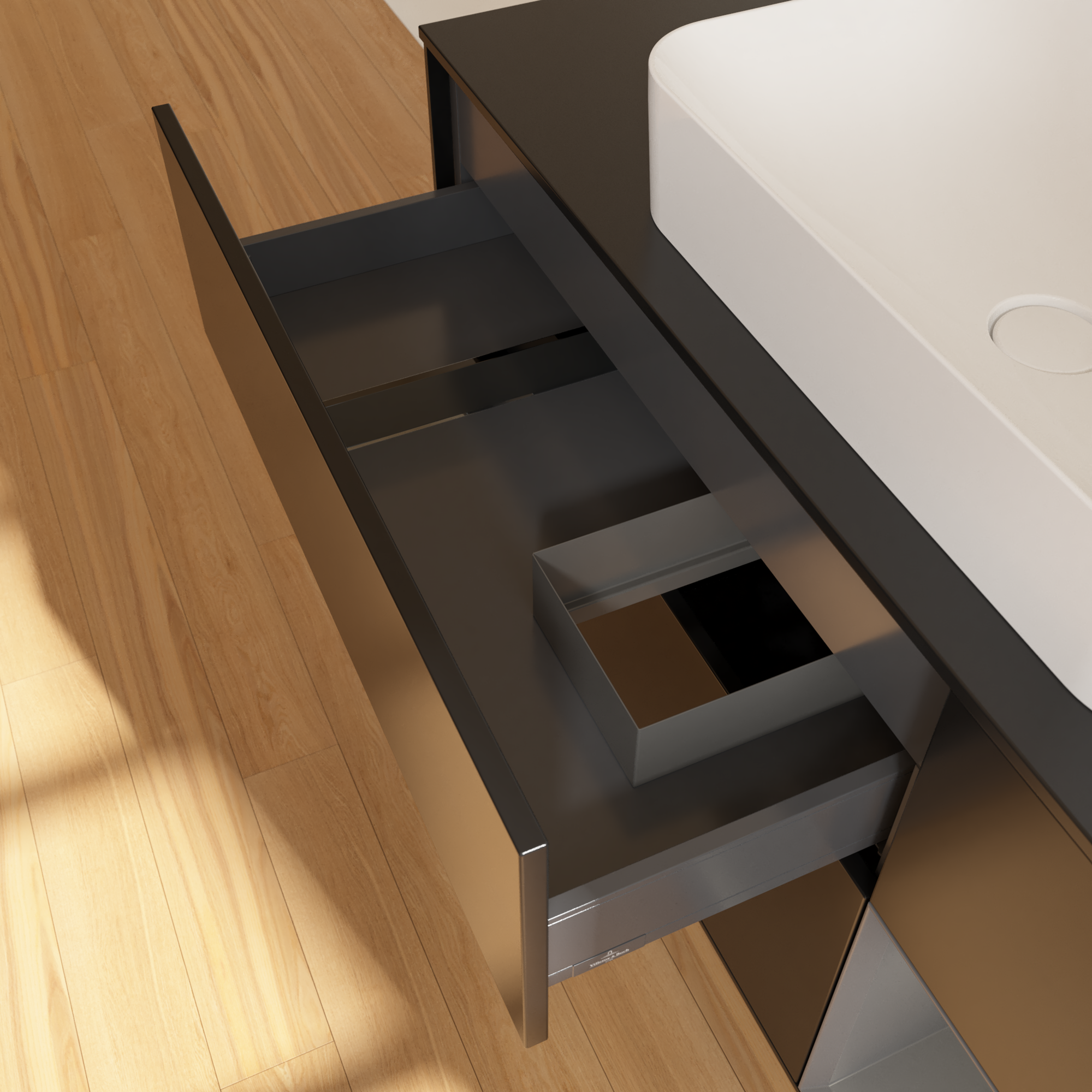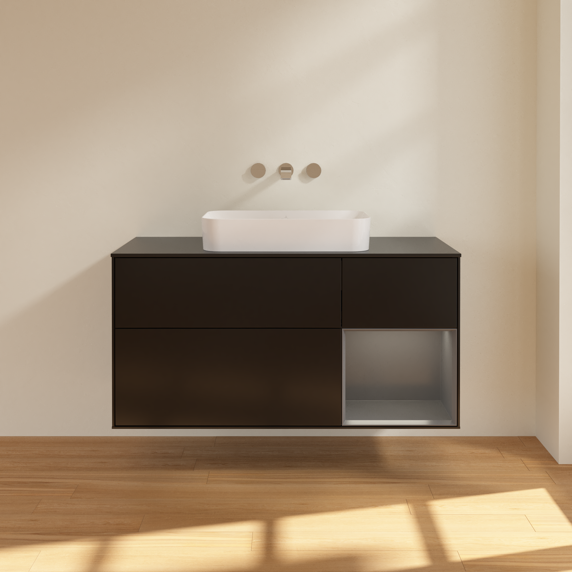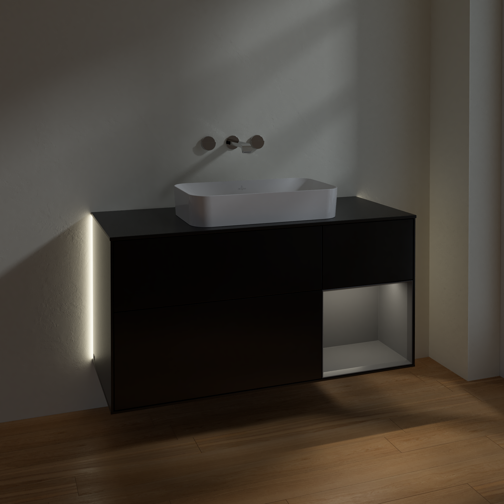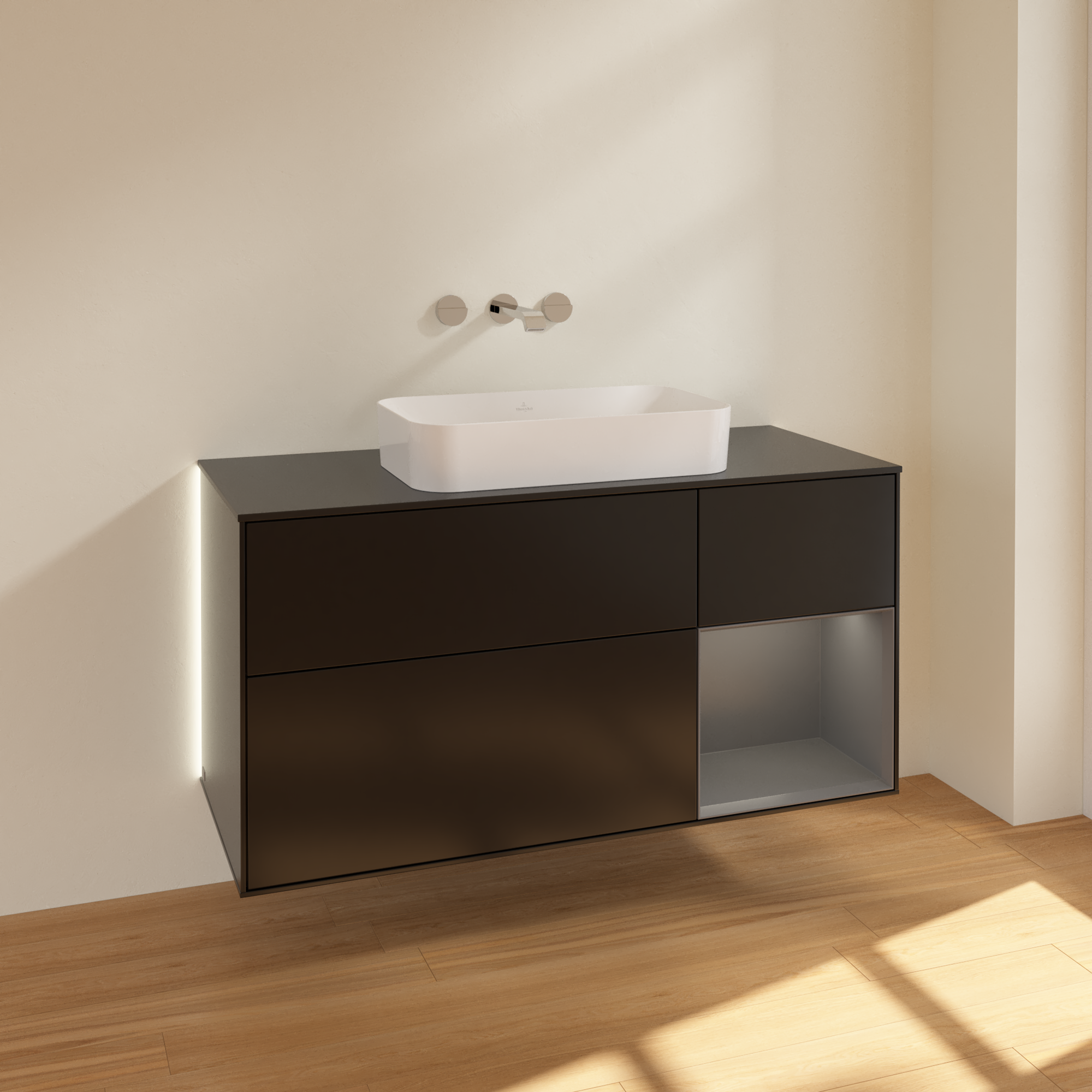 Finion Waschbeckenunterschrank, mit Beleuchtung, 3 Auszüge, 1200x603x501mm, Korpus: Black Matt Lacquer, Front: Black Matt Lacquer, Regalelement: Anthracite Matt Lacquer, Abdeckplatte: Glass Black Matt