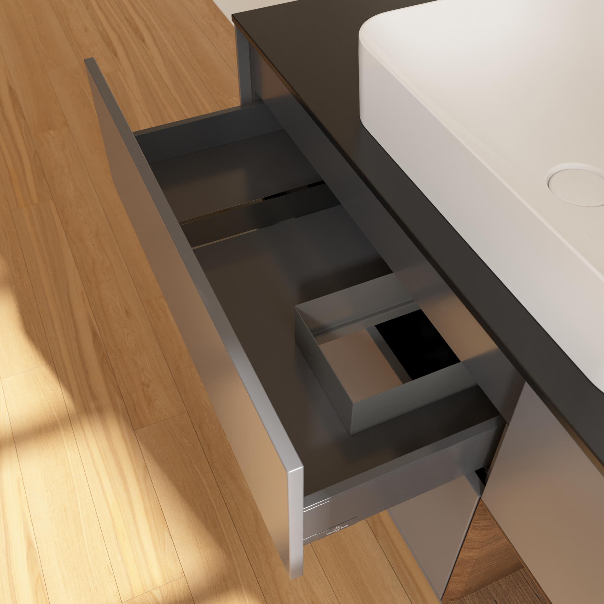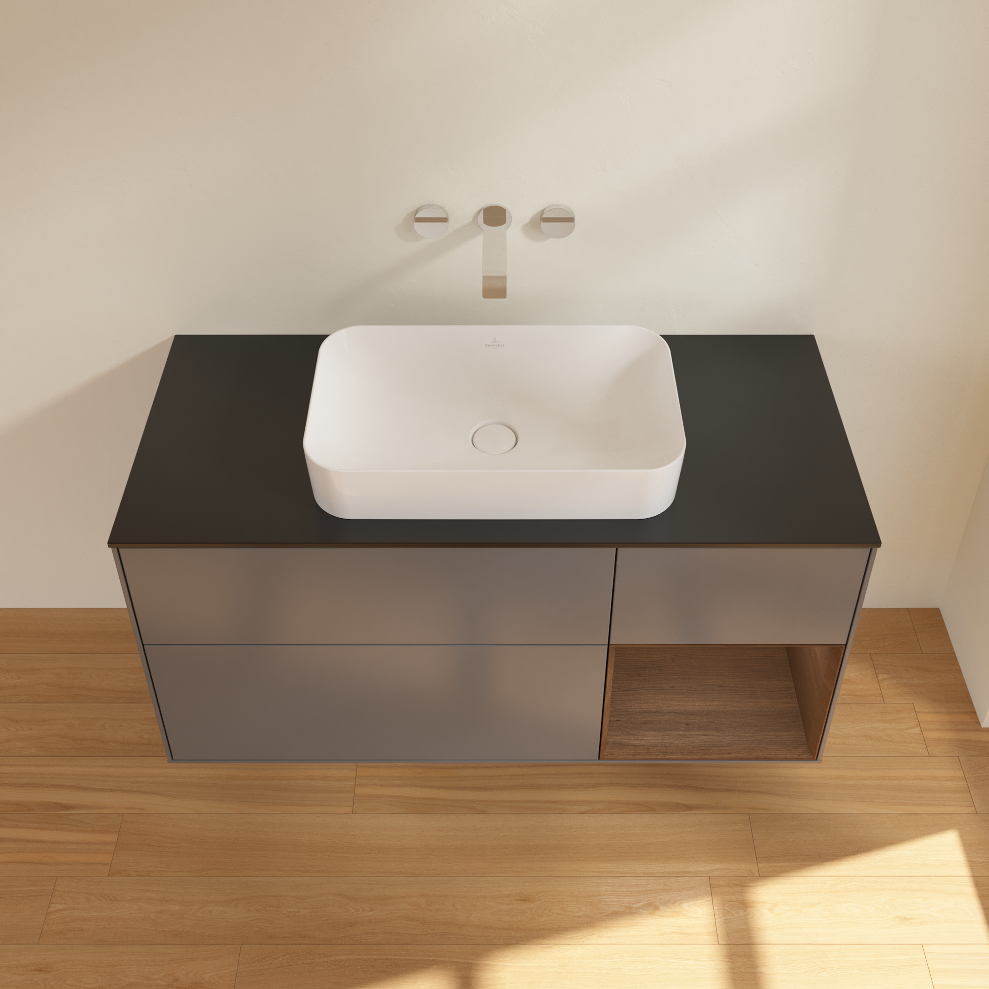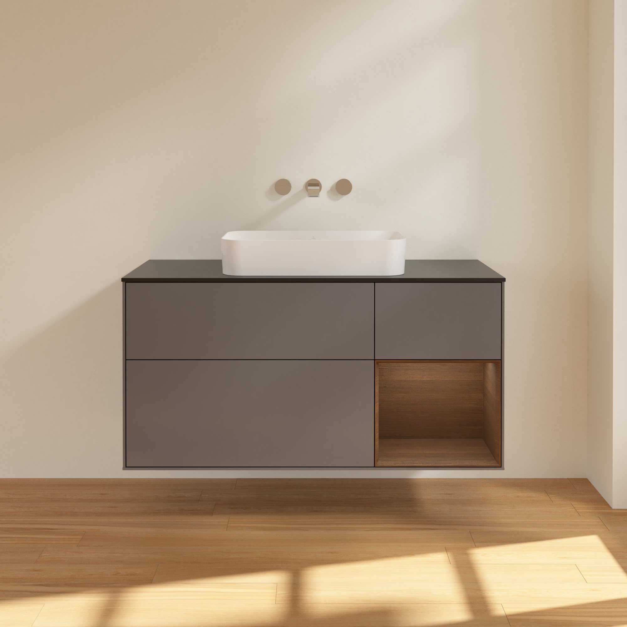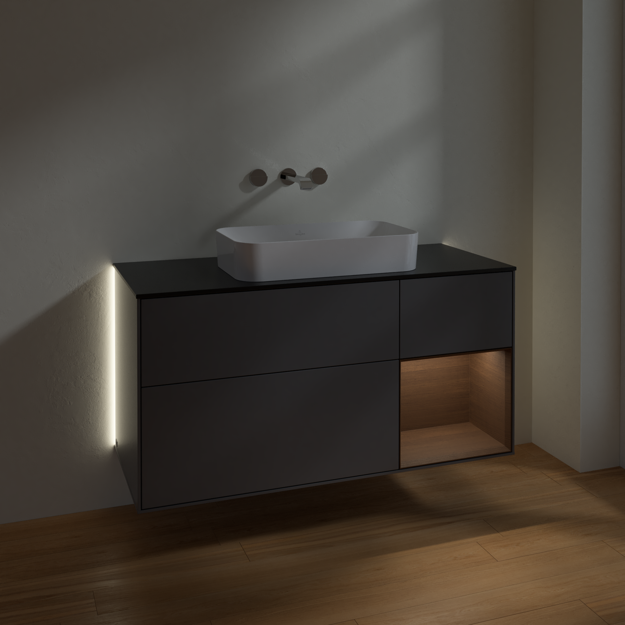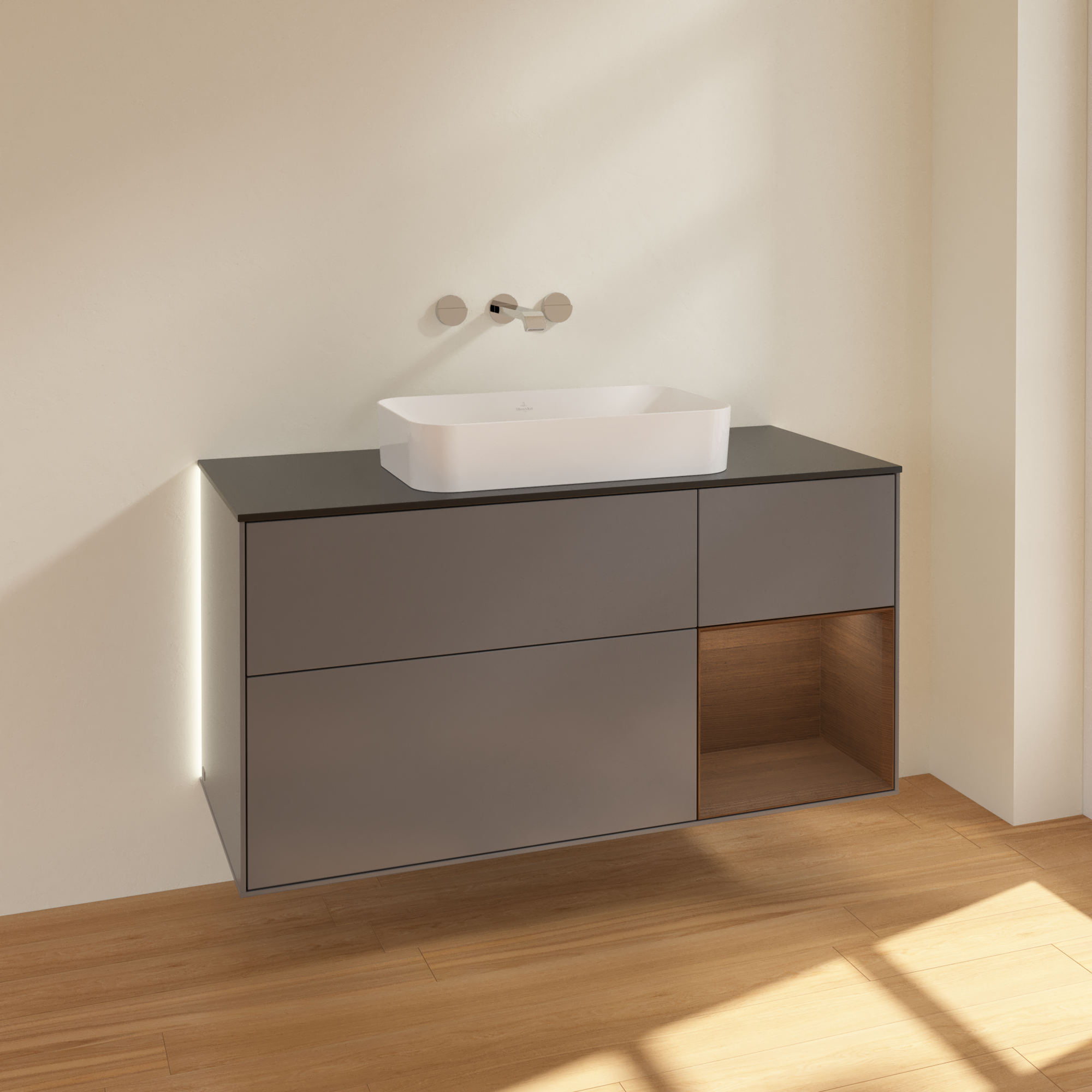 Finion Waschbeckenunterschrank, mit Beleuchtung, 3 Auszüge, 1200x603x501mm, Korpus: Anthracite Matt Lacquer, Front: Anthracite Matt Lacquer, Regalelement: Walnut Veneer, Abdeckplatte: Glass Black Matt