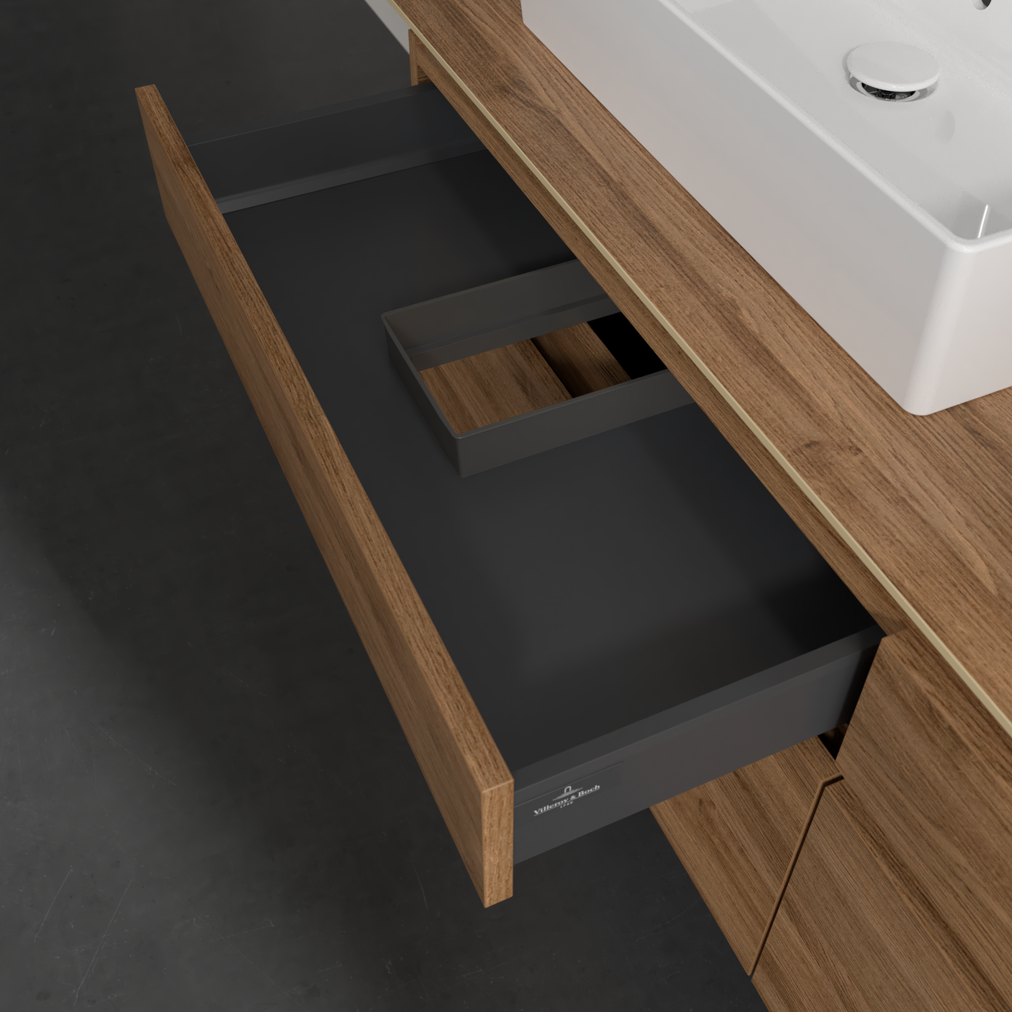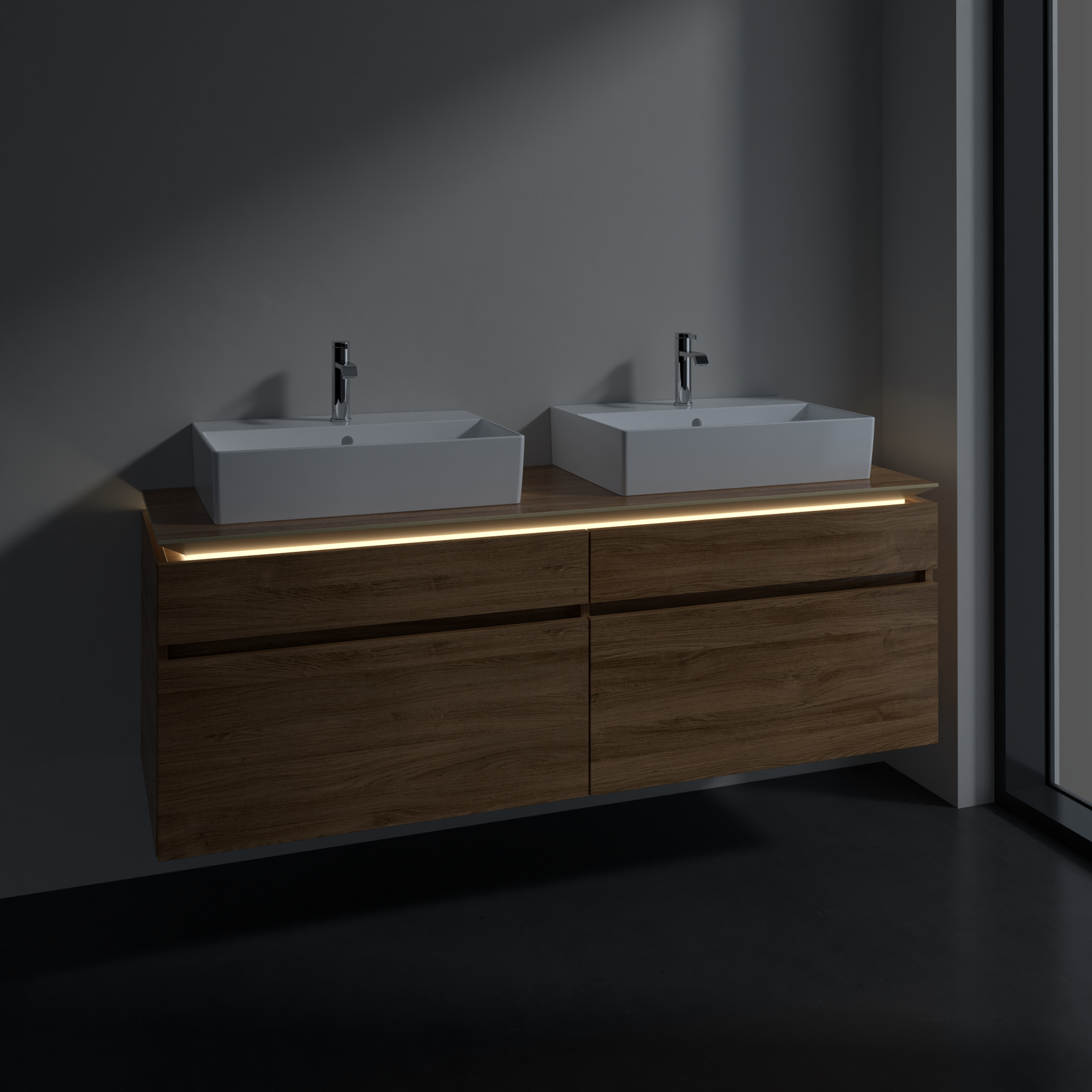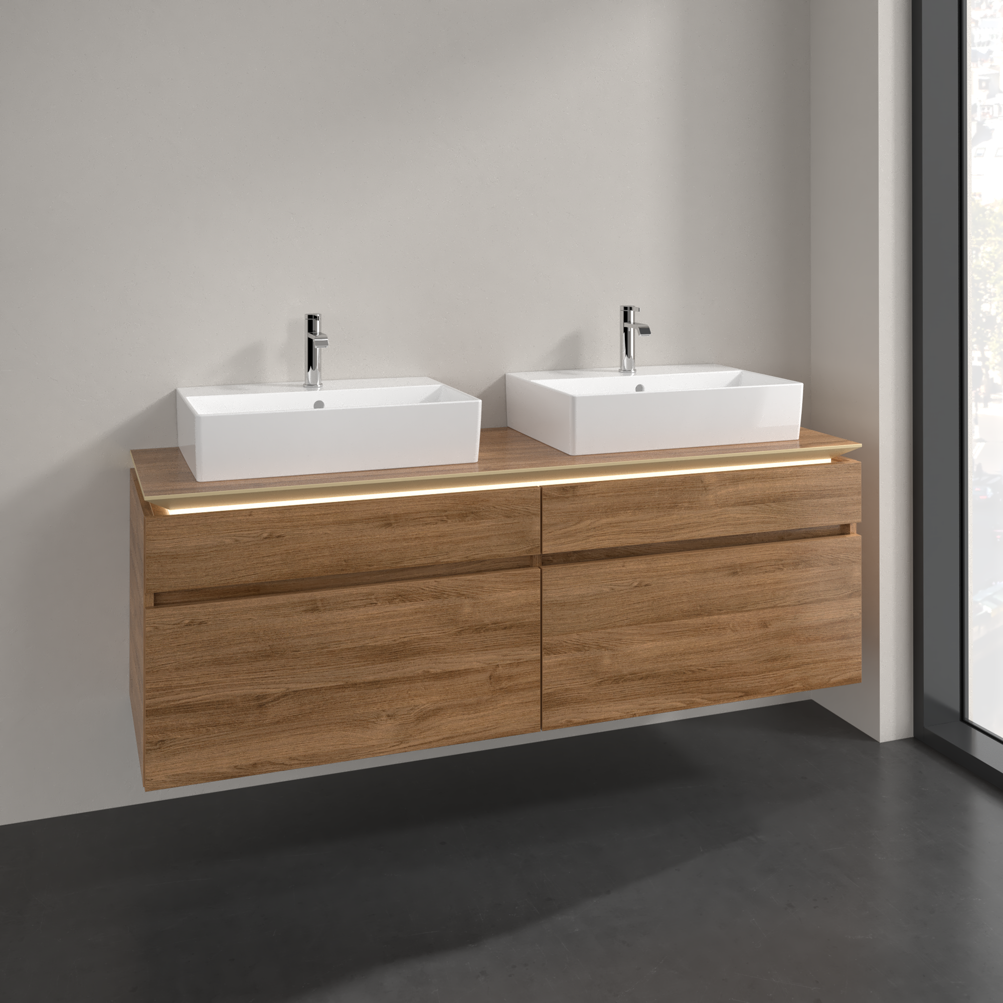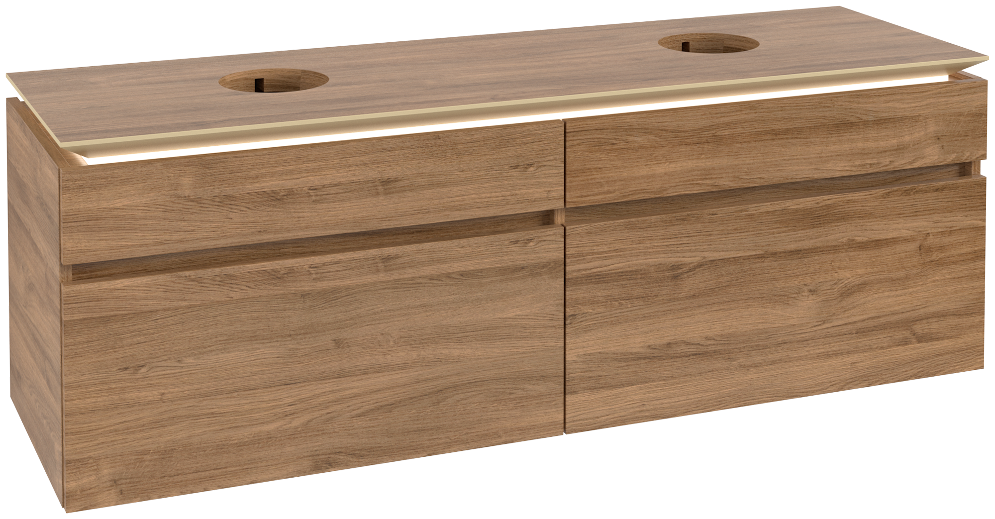 Legato Waschbeckenunterschrank, mit Beleuchtung, 4 Auszüge, 1600x550x500mm, Korpus: Kansas Oak, Front: Kansas Oak