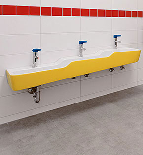 Dem Leitgedanken dieses Ansatzes folgend, enthält die Ausstattung auch der Nassbereiche Angebote für die Kinder, die sie dem Stand Ihrer Entwicklung folgend, selbstbestimmt nutzen können. So bietet der Waschtisch mit drei unterschiedlichen Höhen und Tiefen dem Kind die Möglichkeit eigenständig zu entscheiden, wo es seine Hände reinigt. In der Praxis bestätigt sich dieser Ansatz, da die Kinder intuitiv den für sie passenden Bereich am Waschtisch nutzen. Durch seine Formgebung ermöglicht der Waschtisch das eigenständige Handeln und kann so zu einer positiven Bestätigung nach einer selbständig getroffenen Entscheidung beitragen.