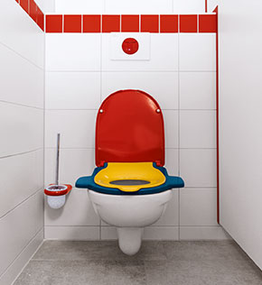 Der Bau richtet sich in erster Linie nach Süden aus, während sich die Bad- und WC-Bereiche nach Norden orientieren. Entsprechend der Ausrichtungder Waldorfpädagogik finden sich die Angebote zum spielerischen Lernen in der gesamten Einrichtung wieder. Selbstverständlich auch in den vier Nassräumen, die den Gruppenbereichen zugeordnet sind. Mit Signalfarben lenken die Armaturen und Betätigungsplatten der WC’s die Aufmerksamkeit auf ihre Funktion. Selbst die Sitzringe weisen mit den Farben Rot, Blau und Gelb auf unterschiedliche Nutzungsmöglichkeiten durch die Kinder hin.