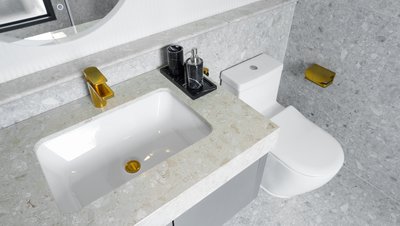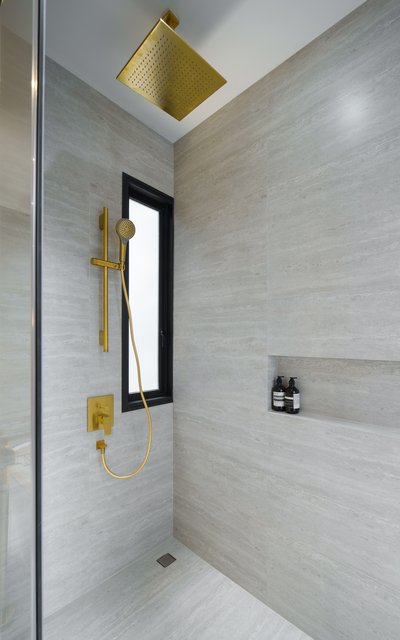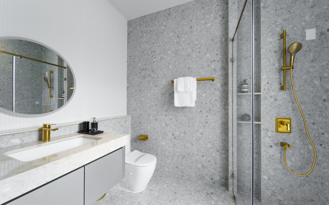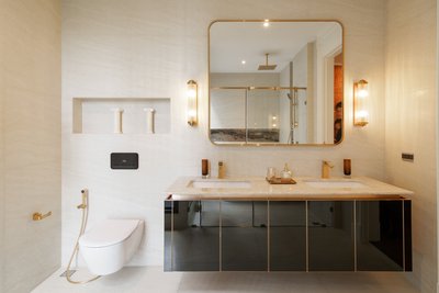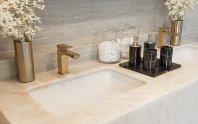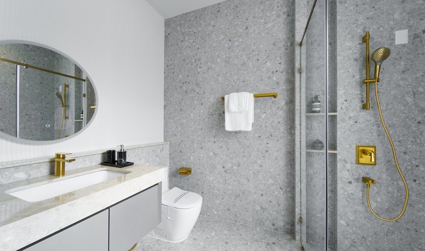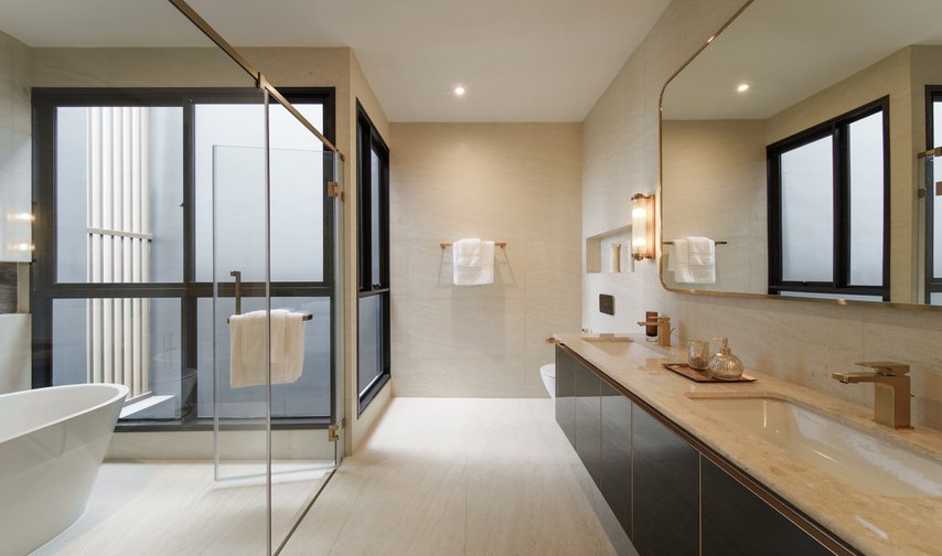 Im Gegensatz dazu spielt das Interior Design mit einer Fülle an Formen, Farben und Dekoren – stilistisch verortet von klassisch-elegant bis avantgardistisch-farbenfroh. Die exklusiven Badezimmer greifen die jeweilige Anmutung der Wohnbereiche auf und führen sie mit ausgesuchten Badelementen von Villeroy & Boch gelungen fort. So fügen sich die puristischen Unterbauwaschbecken aus der Serie Architectura harmonisch in Waschtischplatten aus edlem Marmor ein. Perfekt dazu: Architectura Square Armaturen für Waschtisch, Badewanne und Duschbereich, die mit ihrer eckigen Formensprache das Bad-Design selbstbewusst in Szene setzen und in der Farbe Brushed Gold zum markanten Stil-Statement avancieren. Zugleich bieten die aus europäischen Komponenten gefertigten Armaturen praktische Features für höchsten Nutzungskomfort.