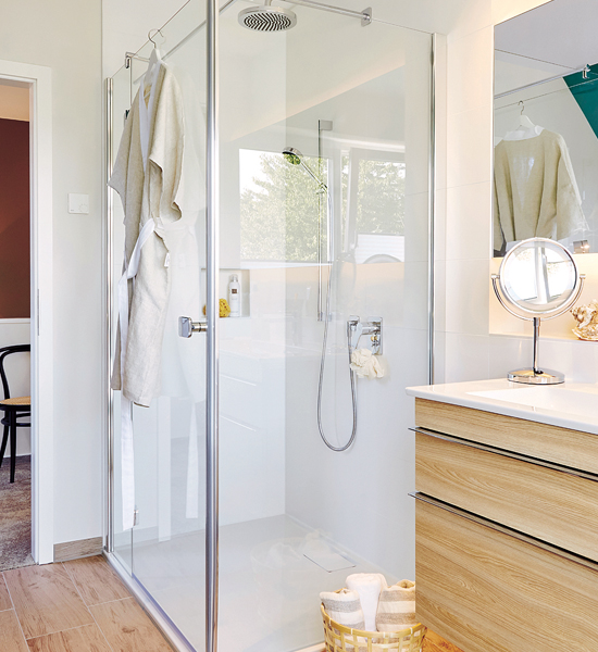 Die Holzoptik der Bodenfliesen LODGE stellt die optische Verbindung zum Erdgeschoss her. Kombiniert mit Jadegrün und Weiß an der Wand und einer bodentiefen Fensterfront verleihen die hellen Fliesen dem Badezimmer Weite. Die geräumige, bodengleiche Dusche Architectura MetalRim mit großer Kopfbrause sorgt für besten Nutzungskomfort, während der 100er Waschtisch aus der Serie Venticello mit passendem Unterschrank zugleich eine wohnliche Atmosphäre erzeugt. Eine Installationswand unter der Dachschräge bietet Ablagefläche für Accessoires und macht gleichzeitig die eingebaute Acryl-Badewanne aus der Serie Subway zum Hingucker. Das wandhängende WC ist dank spülrandloser DirectFlush-Technik besonders hygienisch und leicht zu reinigen.