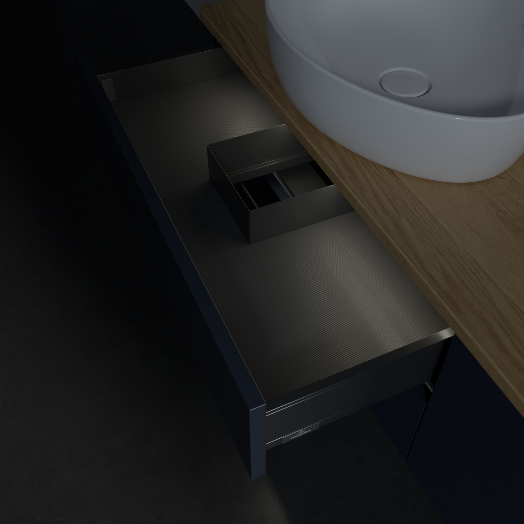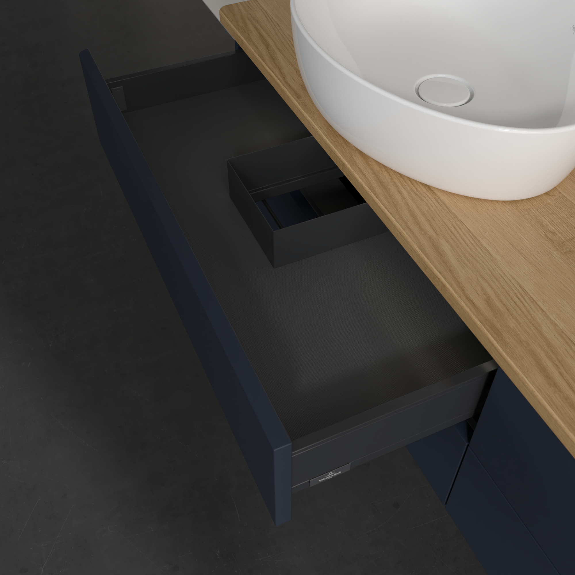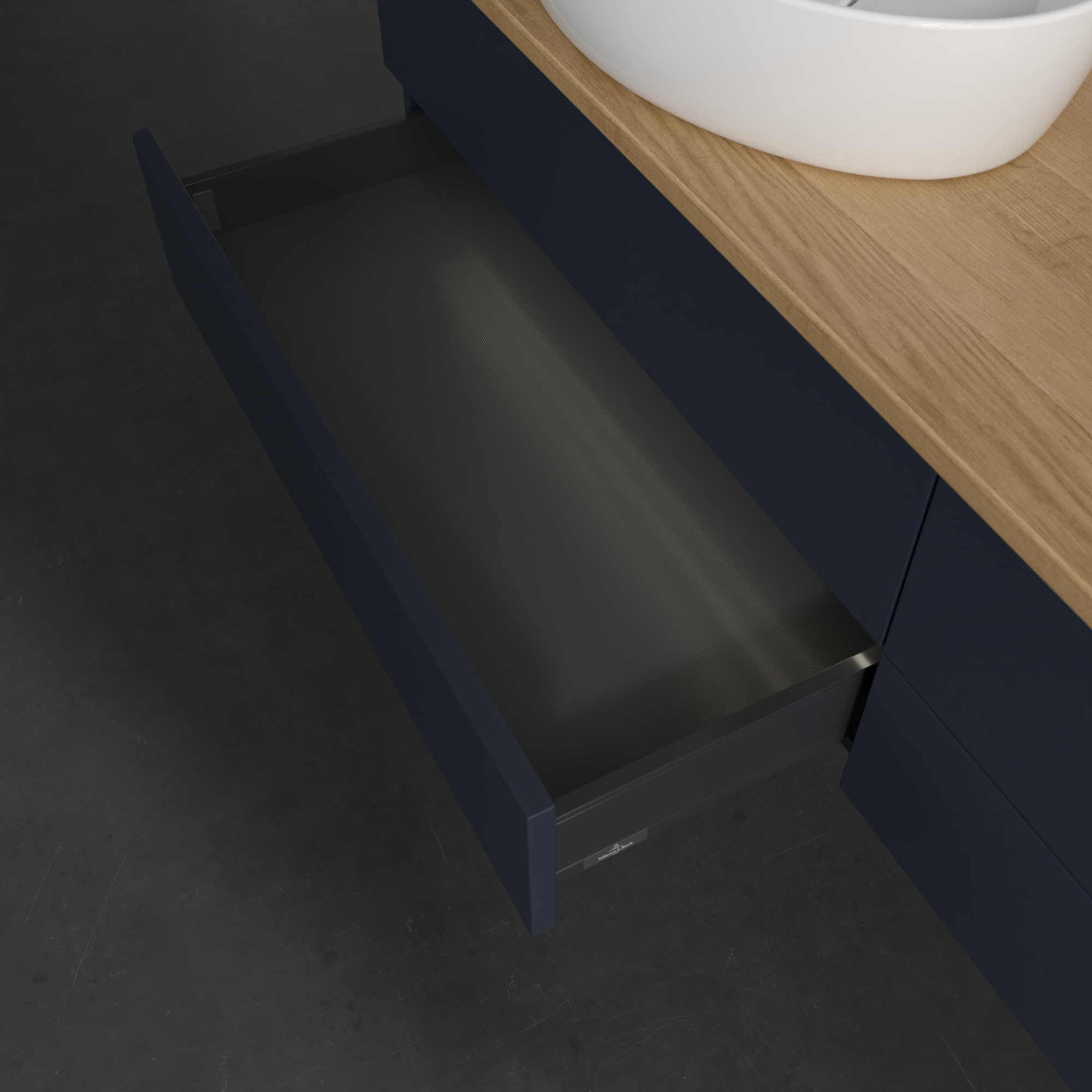 Antao Waschbeckenunterschrank, mit Beleuchtung, 4 Auszüge, 1600x360x500mm, Front ohne Struktur, Korpus: Midnight Blue Matt Lacquer, Front: Midnight Blue Matt Lacquer, Abdeckplatte: Honey Oak